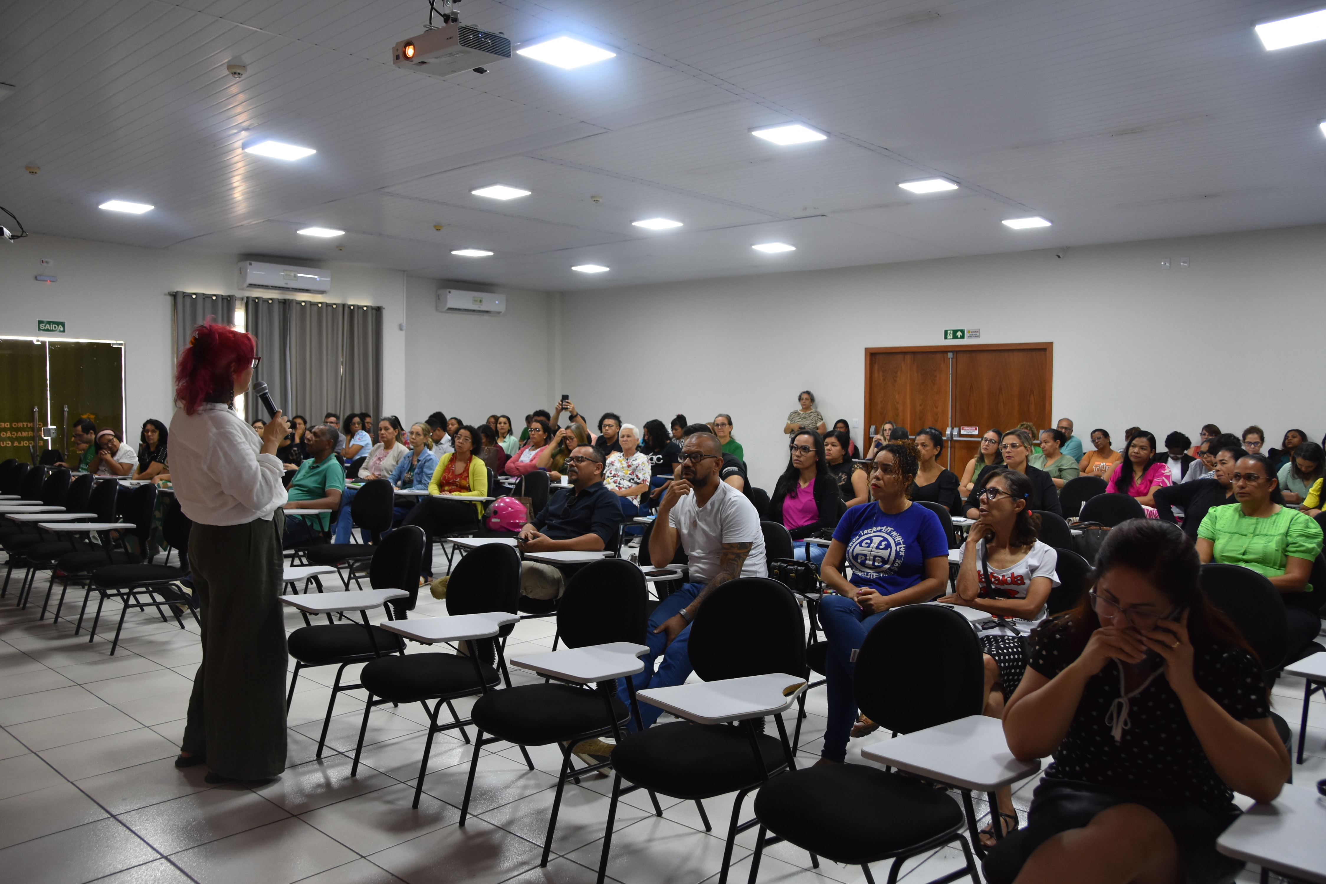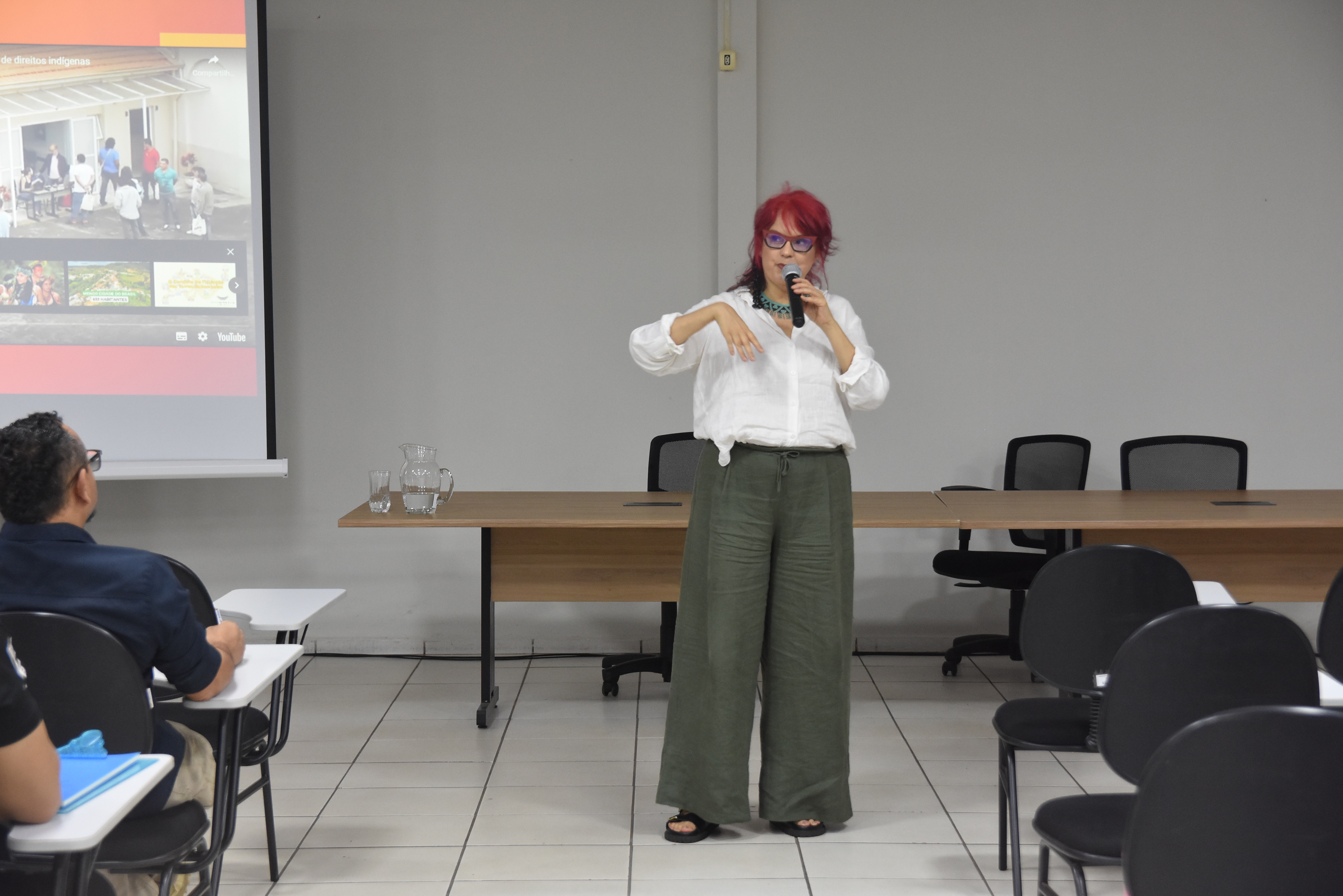 Professores de Artes da rede pública municipal de educação participam, no Centro de Formação da Escola Cuiabana (CFEC), da oficina “Cantos da floresta – enveredando-se pelas culturas indígenas brasileiras”. A proposta é estimular os educadores a refletirem sobre o universo indígena, em toda sua diversidade cultural, a partir das músicas indígenas brasileiras. A palestra foi ministrada pela musicista e pesquisadora independente de músicas do mundo e das culturas indígenas brasileiras, Magda Pucci.