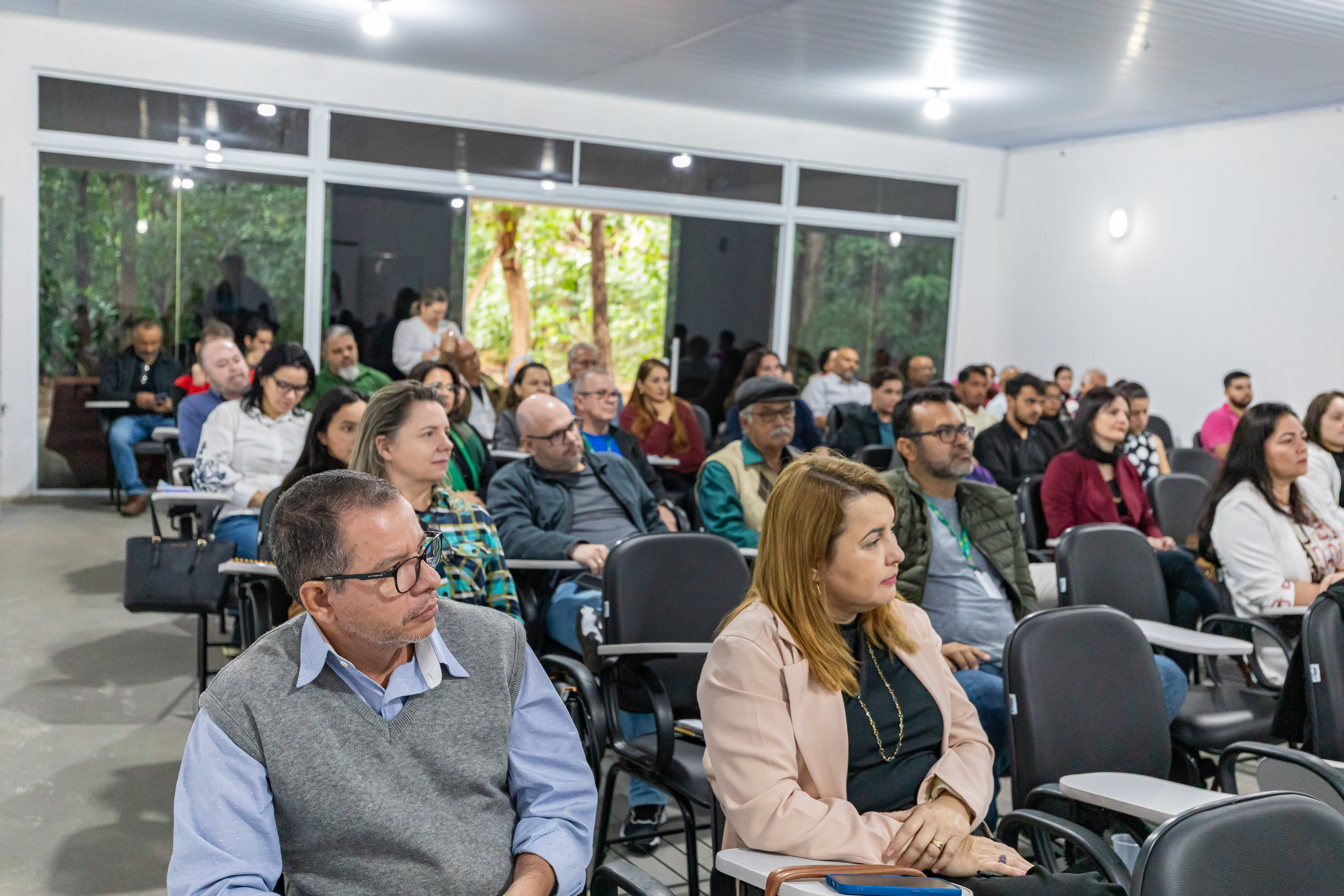 A foto mostra os participantes acomodados em poltronas em sala de auditório onde é realizado o evento.