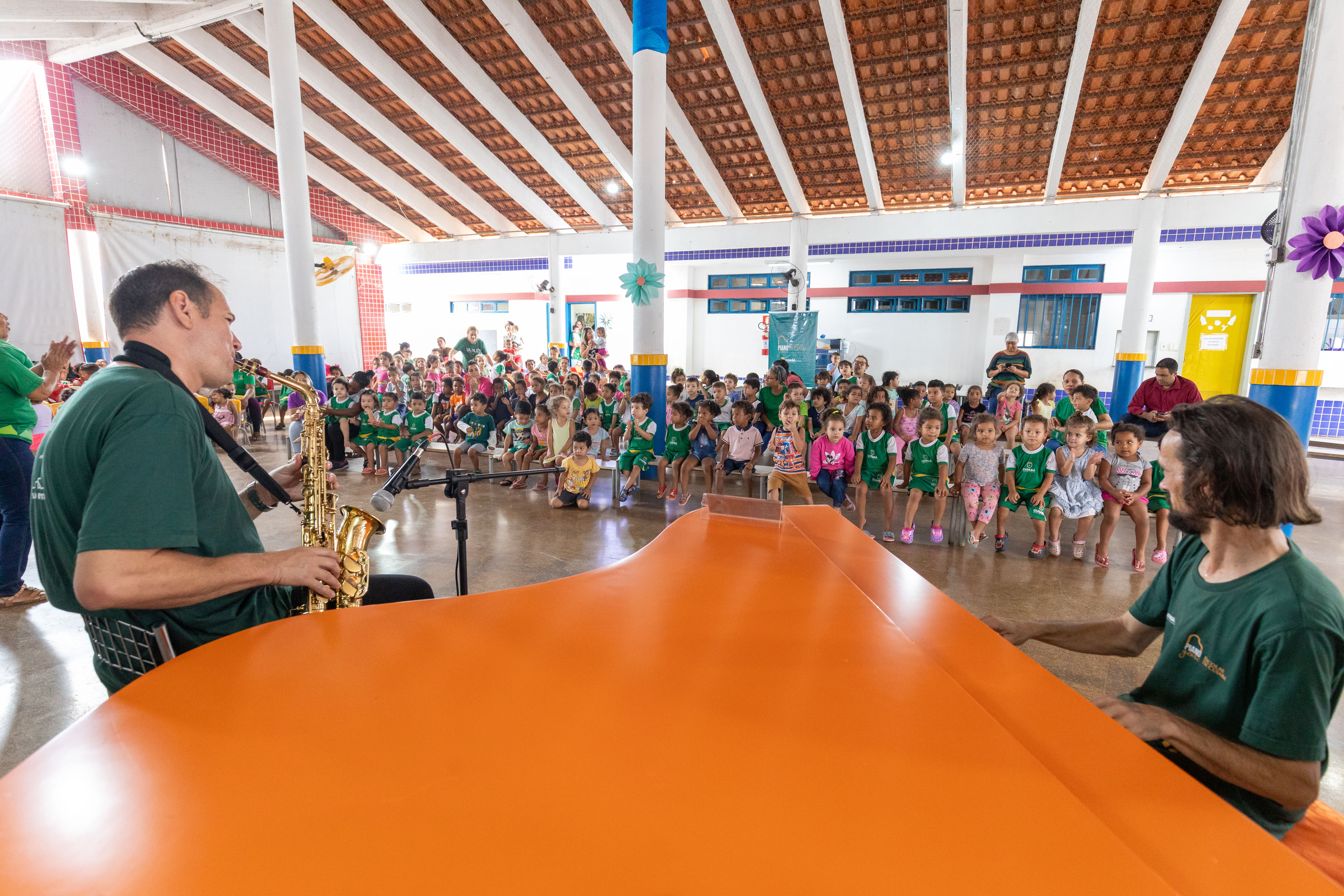 A foto ilustra um piano de cor laranja no pátio de uma escola. Um homem de camisa verde, do lado esquerdo, toca saxofone. À frente, está uma bailarina de blusa preta. Diversas crianças estão sentadas e em pé prestando atenção na apresentação.