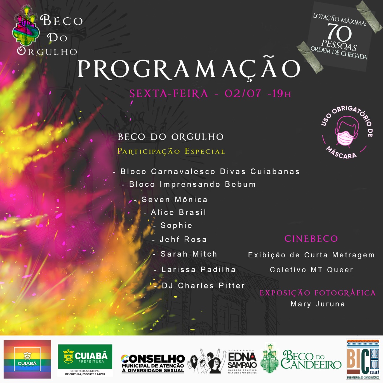 Nesta semana não haverá o acendimento dos candeeiros na quinta-feira (01) e a programação começa na sexta-feira (02), com a ação “Beco do Orgulho”, alusiva ao Dia Internacional do Orgulho LGBTQIA+, com apresentações do Bloco Carnavalesco Divas Cuiabanas, Bloco Imprensando Bebum, Seven Mônica, Alice Brasil, Sophie Jehf Rosa, Sarah Mitch, Larissa Padilha e Dj Charles Pitter. Além de exibição de curta metragem do Coletivo MT Queer no Cine Beco e também exposição fotográfica de Mary Juruna.