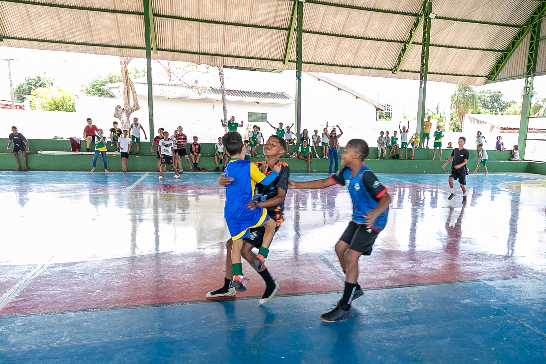 A foto mostra crianças em uma quadra esportiva disputando futsal. Um time veste uniforme azul e o outro uniforme amarelo. O piso da quadra, de cor amarela, também se destaca.