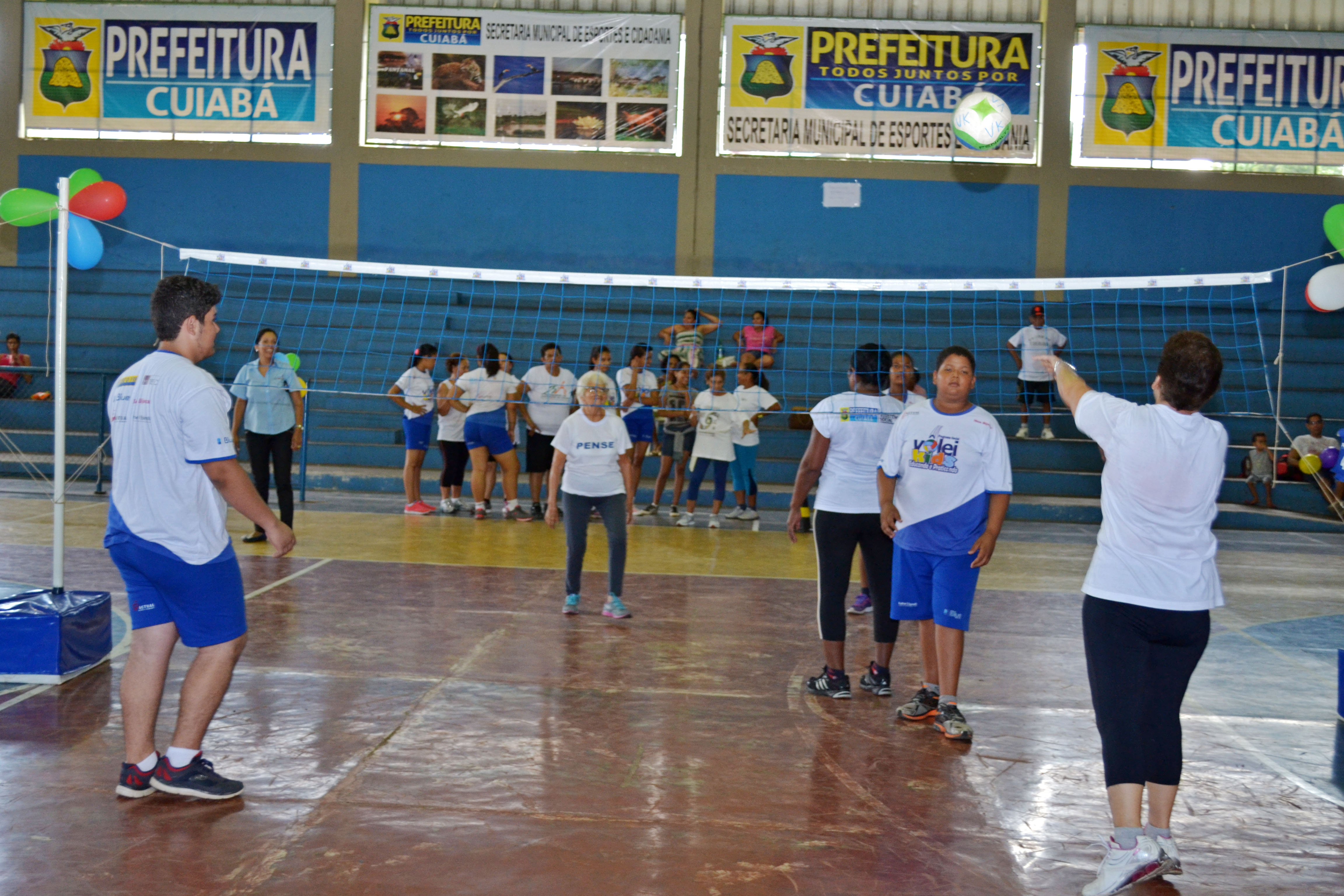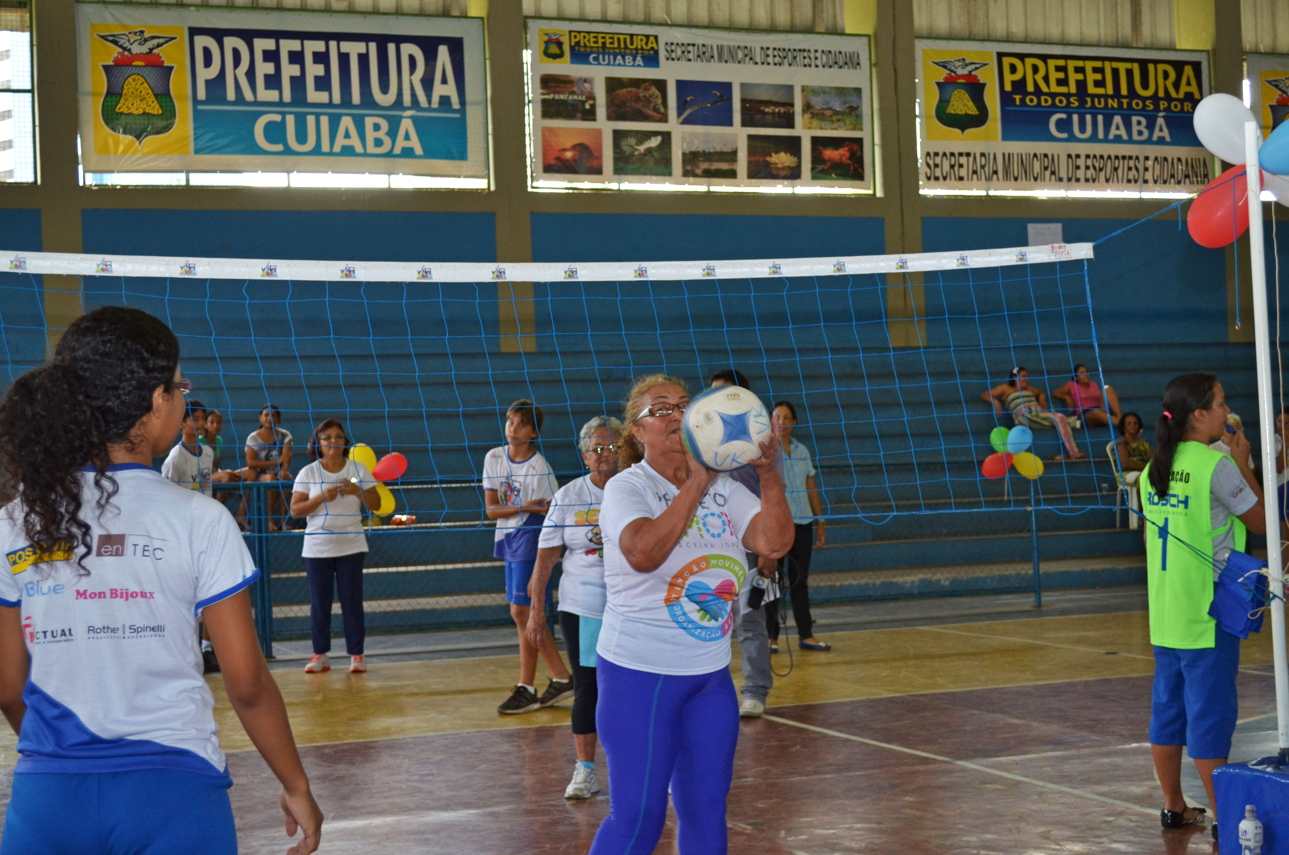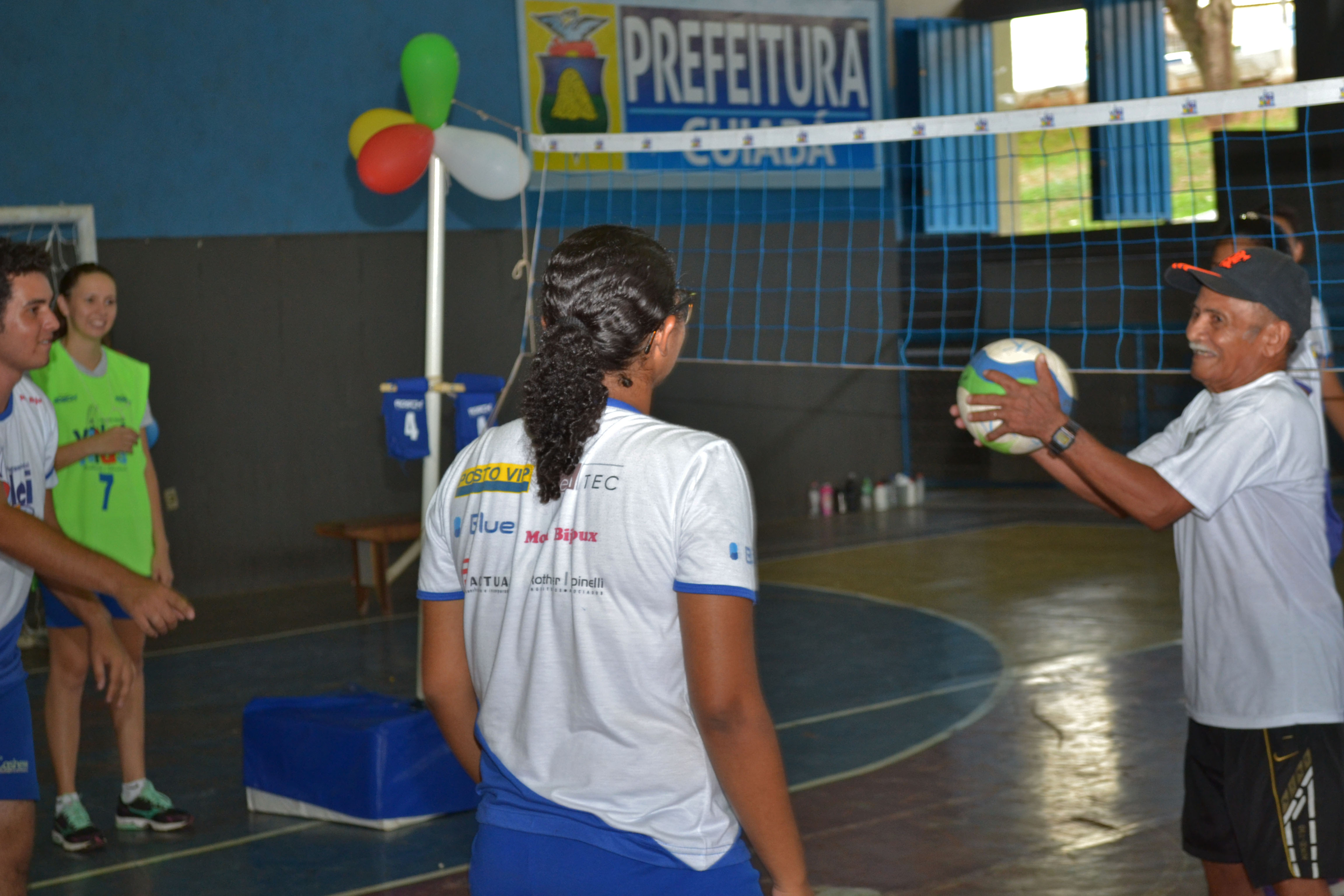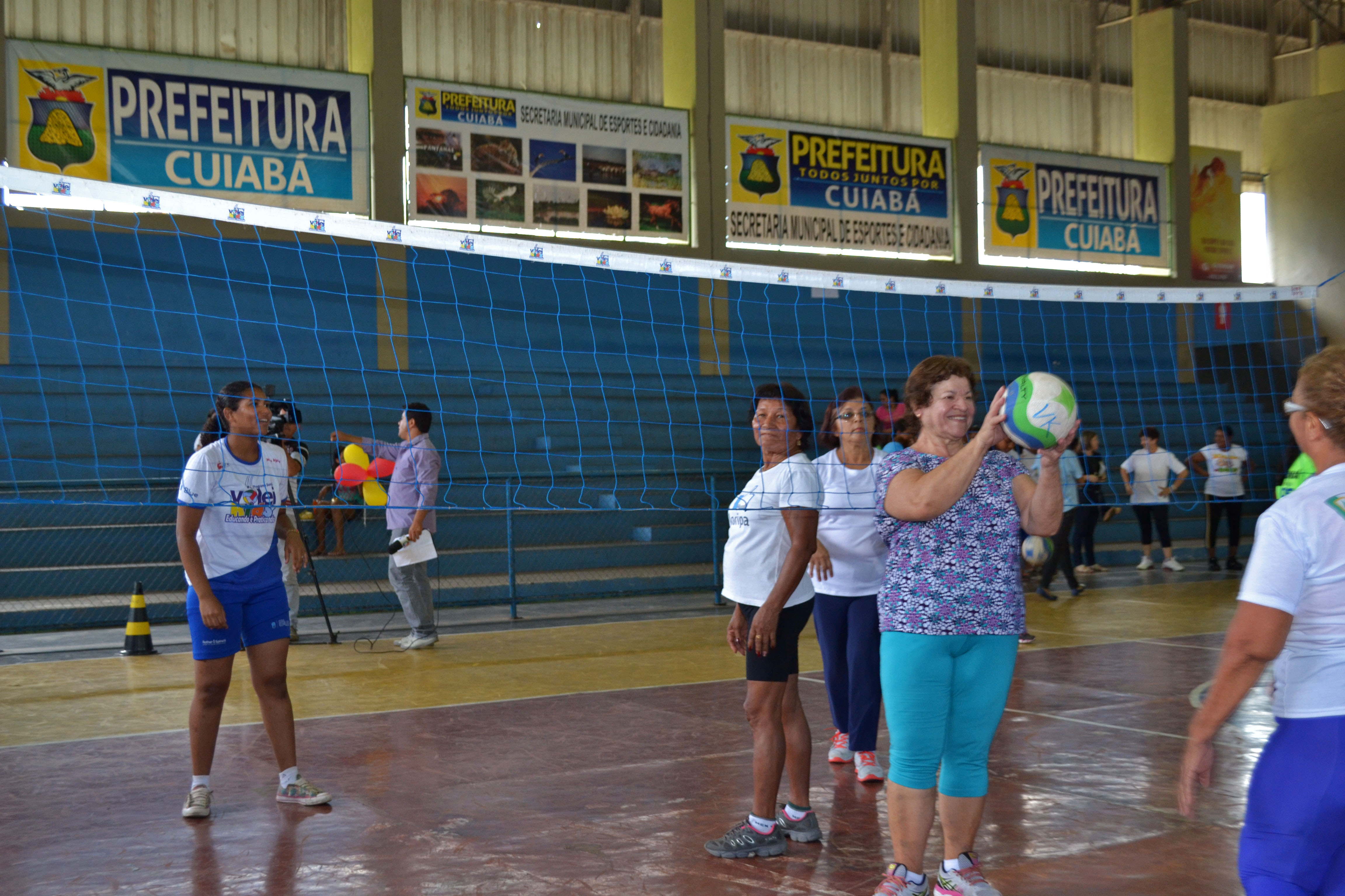 Crianças e idosos que participam de projetos mantidos pela Prefeitura de Cuiabá se reuniram nesta quarta-feira (05) para praticar vôlei. A iniciativa faz parte do Projeto “Vôlei entre gerações - superando preconceitos”, realizado no Ginásio Quilombo.