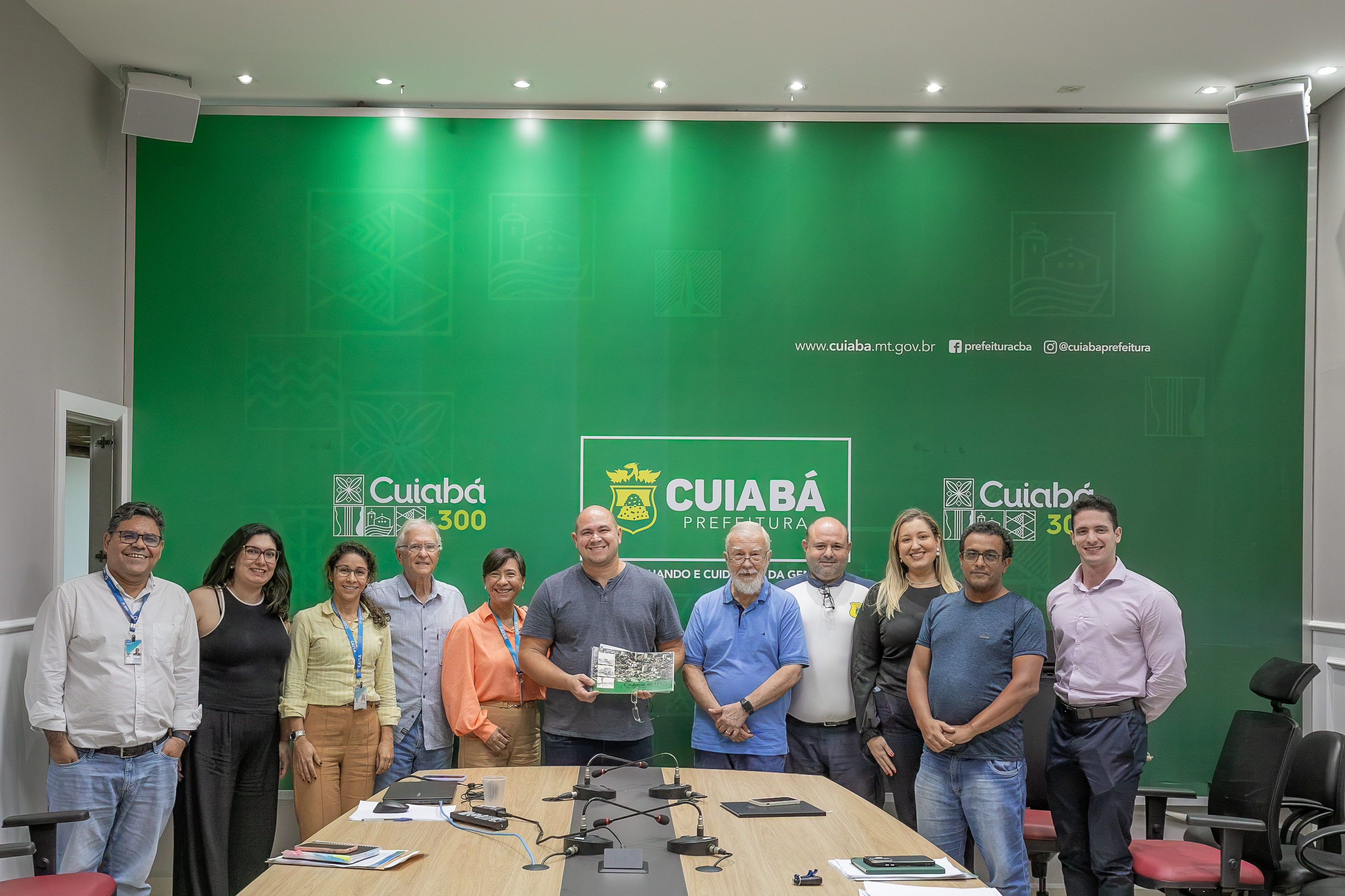 A foto mostra toda a equipe participante da reunião de alinhamento liderada pelo prefeito de Cuiabá, Abilio Brunini, no salão nobre da Palácio Paiaguás, com a representante da Caixa Econômica Federal, sendo 11 participantes. São profissionais da Secretaria de Meio Ambiente e Desenvolvimento Urbano, da Secretaria de Mobilidade Urbana, Secretaria de Planejamento e a Diretoria Técnica de Convênios da Prefeitura. Todos estão em pé, em foto padrão, com o prefeito Abili ao centro segurando um exemplar do Caderno do IPDU elaborado no ano de 1994, que ganhou da representante da Caixa Econômica Federal.