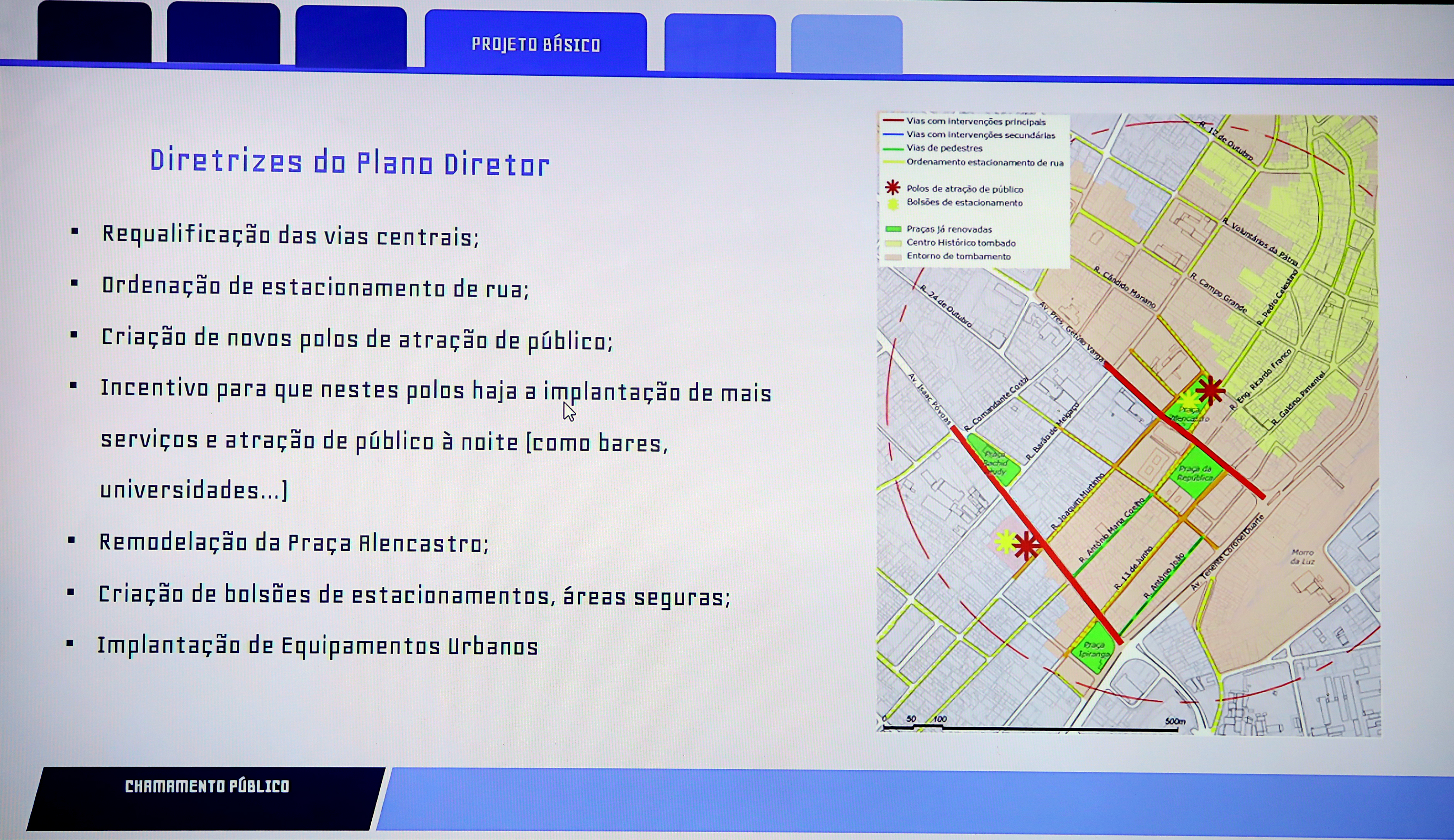Arthur César de Oliveira, engenheiro e representante da Promulti Engenharia, Infraestrutura e Meio Ambiente, empresa habilitada em Procedimento de Manifestação de Interesse (PMI) aberto pela Prefeitura de Cuiabá em dezembro de 2019, fez a apresentação do estudo de viabilidade técnica, econômico-financeira e jurídica para requalificação urbana do Centro da Cidade de Cuiabá e revitalização do Mercado Municipal, destacando que o mesmo foi embasado em diversos diagnósticos, avaliações, pesquisas de opinião feitas tanto com comerciantes e empresários quanto com a população em geral. O estudo compreende ainda quatro cenários possíveis de viabilização, que foram alvos de questionamentos por parte dos presentes, que foram esclarecidos pelo representante da empresa.