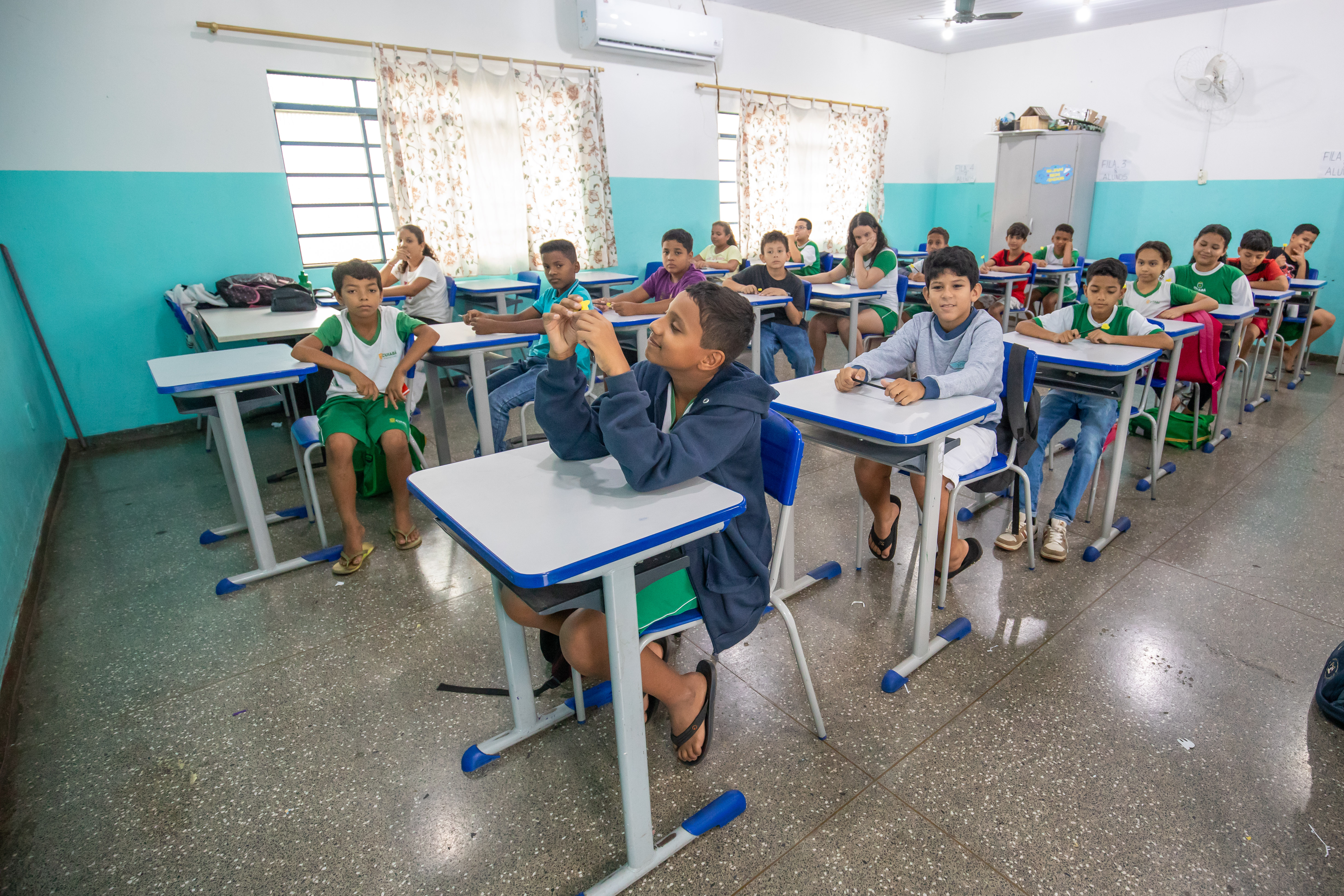 A foto ilustra estudantes da rede pública dentro de uma sala de aula. Todos estão sentados em cadeiras e apoiados em mesas de cor branca com detalhes azuis.