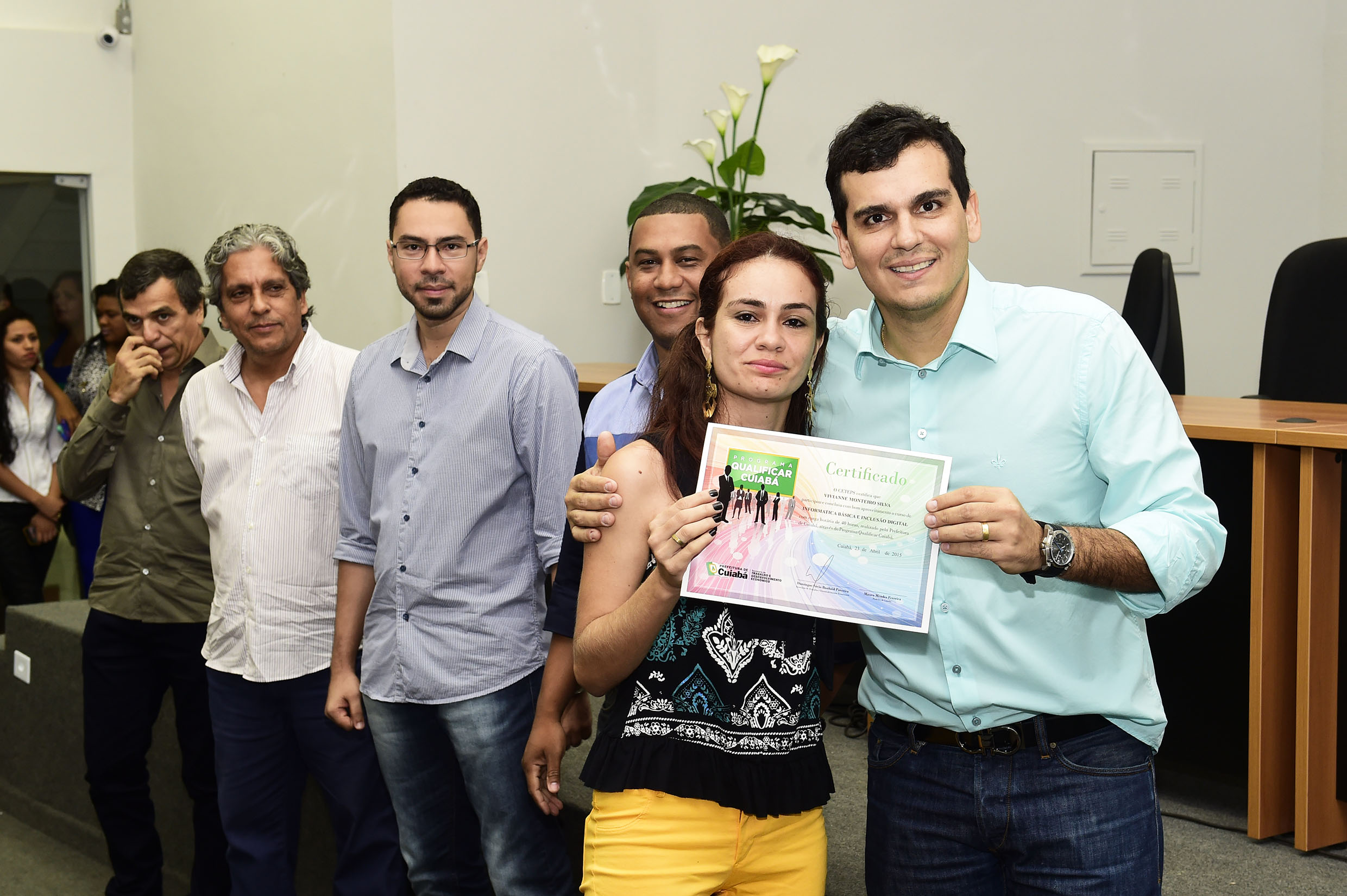 O primeiro grupo do Projeto Qualificar Cuiabá recebeu na noite deste sábado (25) os certificados de conclusão de cursos oferecidos gratuitamente pela prefeitura por meio da Secretaria Municipal do Trabalho e Desenvolvimento Econômico. A solenidade de entrega dos certificados para 400 alunos aconteceu no auditório da Secretaria Municipal de Educação (bairro Bandeirantes), que ficou lotado. Durante o evento, que faz parte das comemorações pelos 296 anos da Capital, o secretário Domingos Sávio, juntamente com diretores e professores, fez a entrega simbólica de certificados para 10 alunos (os demais foram entregues em uma sala anexa).