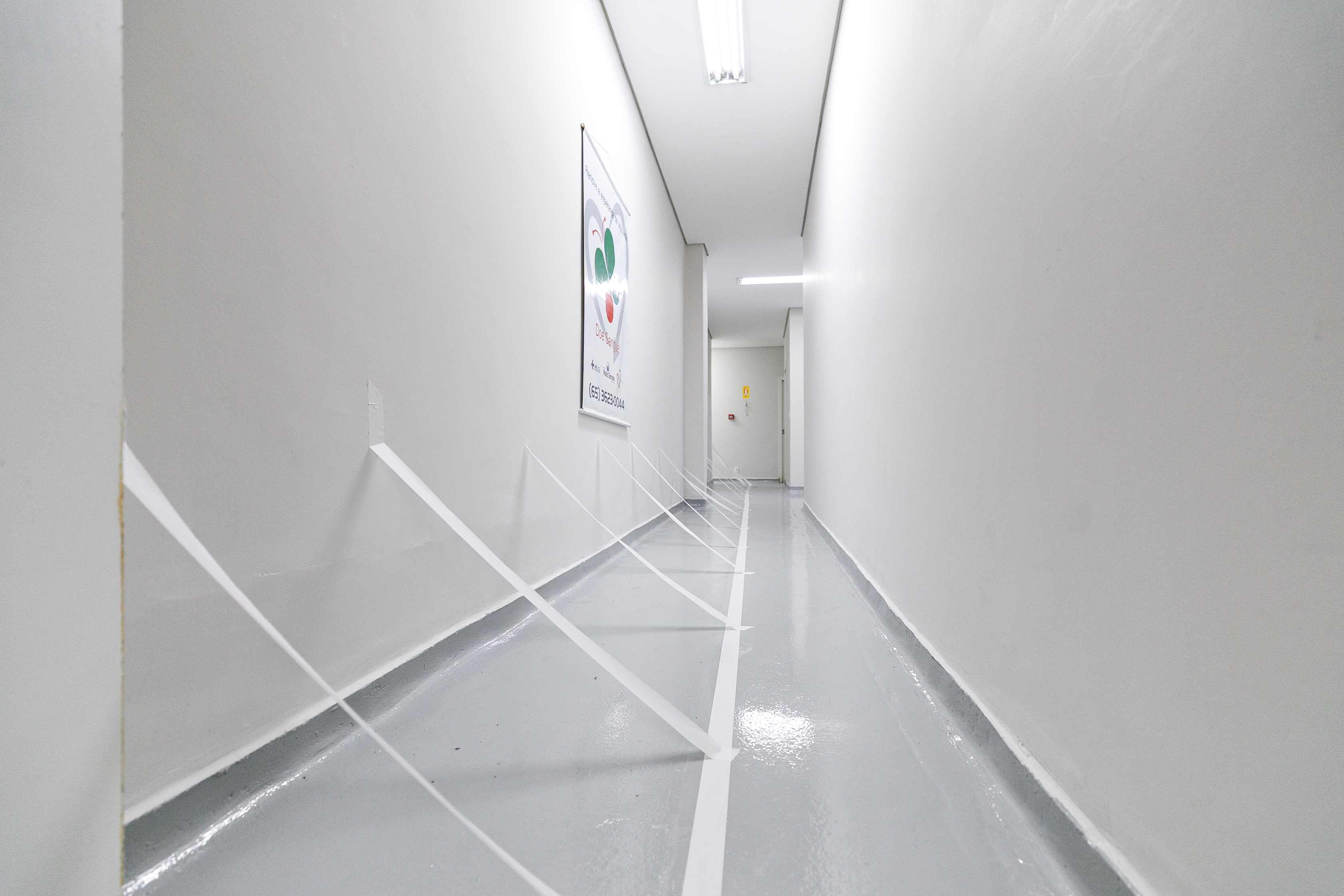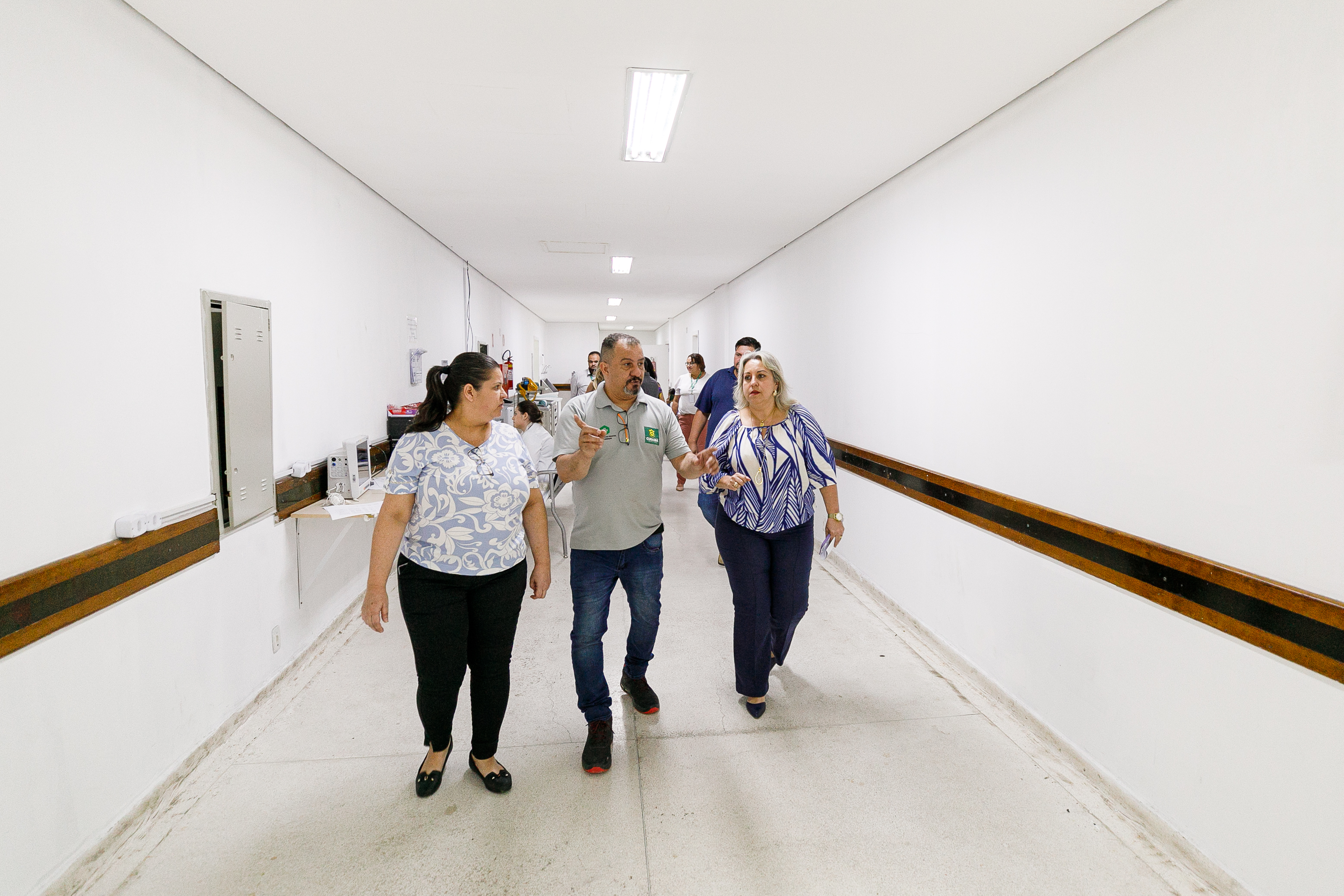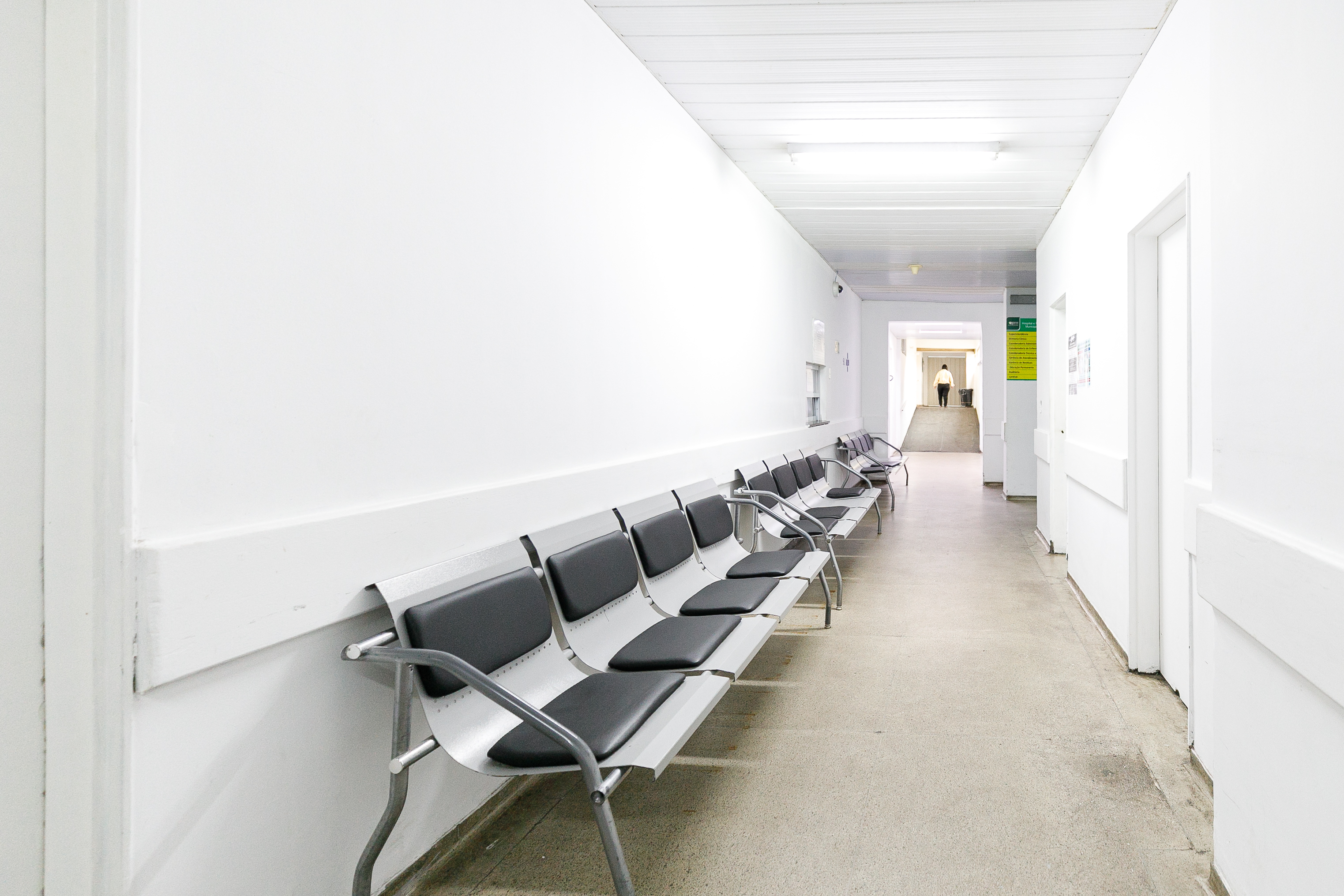 A imagem mostra diversas lonarinas em um corredor de hospital. As paredes são brancas e o piso tem tons claros.