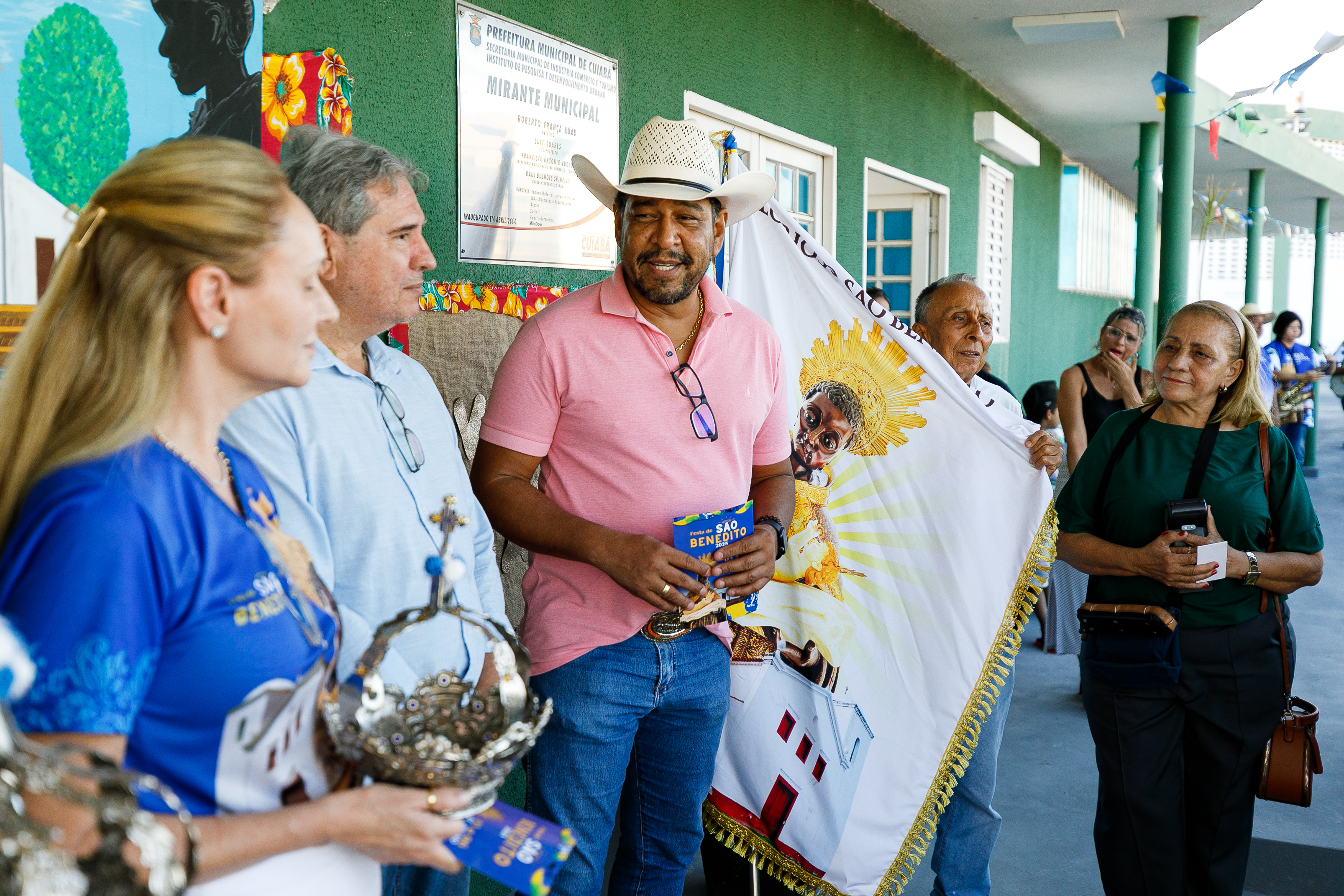 Na imagem principal estão os secretários municipais e o rei e a rainha das festividades de São Benedito. Os reprensentantes estão segurando as coroas enquanto Nivaldo e Johnny fazem a acolhida.