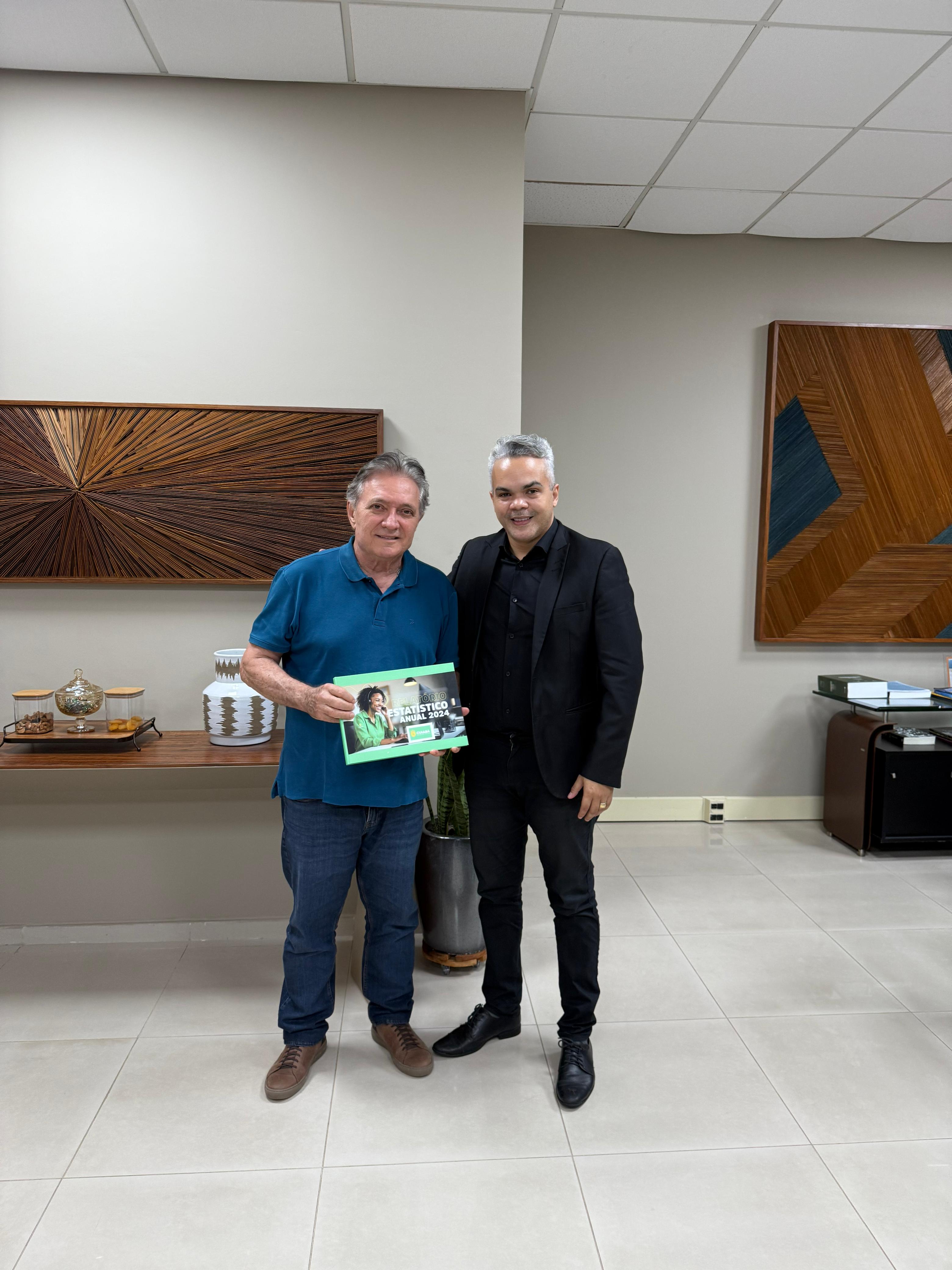 A foto mostra o conselheiro e presidente do Tribunal de Contas do Estado, Sérgio Ricardo, recebendo o Relatório Estatístico Anual da Ouvidoria Geral do Município (OGM).