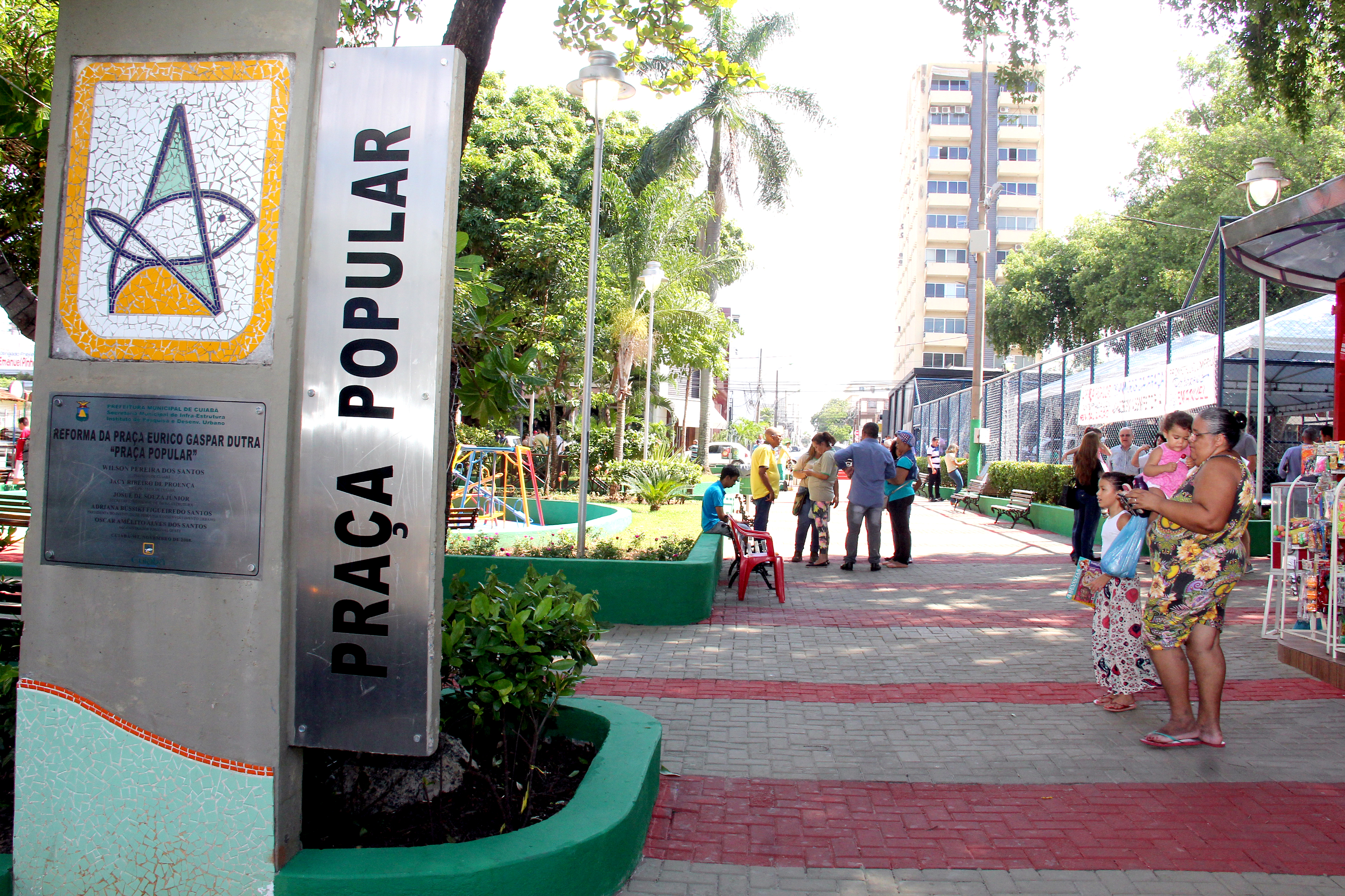 Cumprindo as ações do projeto de revitalização dos espaços públicos e recuperação dos patrimônios históricos da Capital, a Prefeitura de Cuiabá inaugurou na manhã deste sábado a revitalização da Praça Popular. O espaço, que foi fundado junto com o primeiro conjunto habitacional de Cuiabá, na gestão do presidente Eurico Gaspar Dutra, ganhou novas cores, canteiros, parque infantil, quadra esportiva, recuperação de todos os bancos. O ambiente também recebeu um novo jardim e poda das árvores.