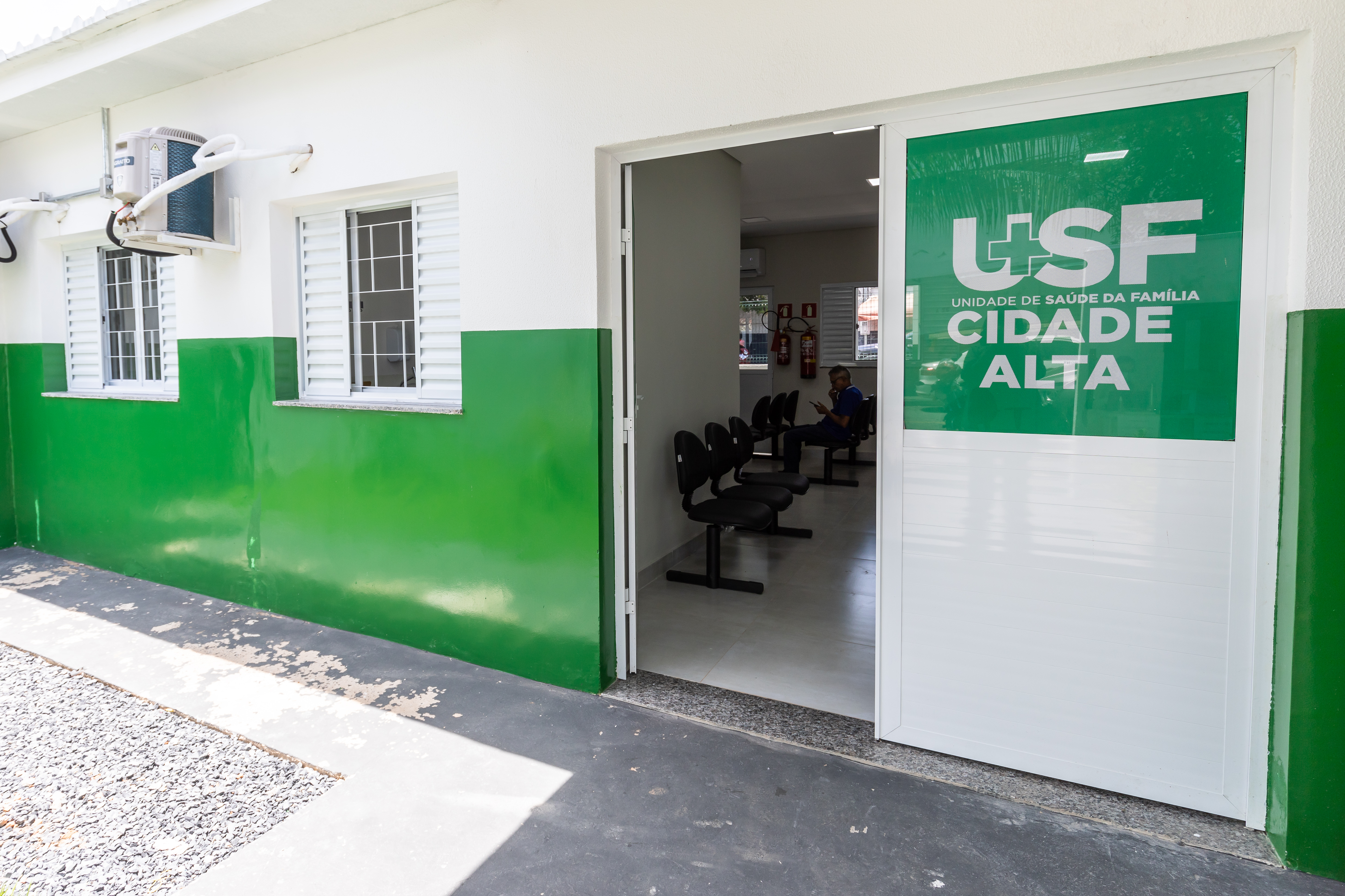 A imagem mostra a fachada de uma Unidade Básica de Saúde (UBS), nas cores branca e verde.