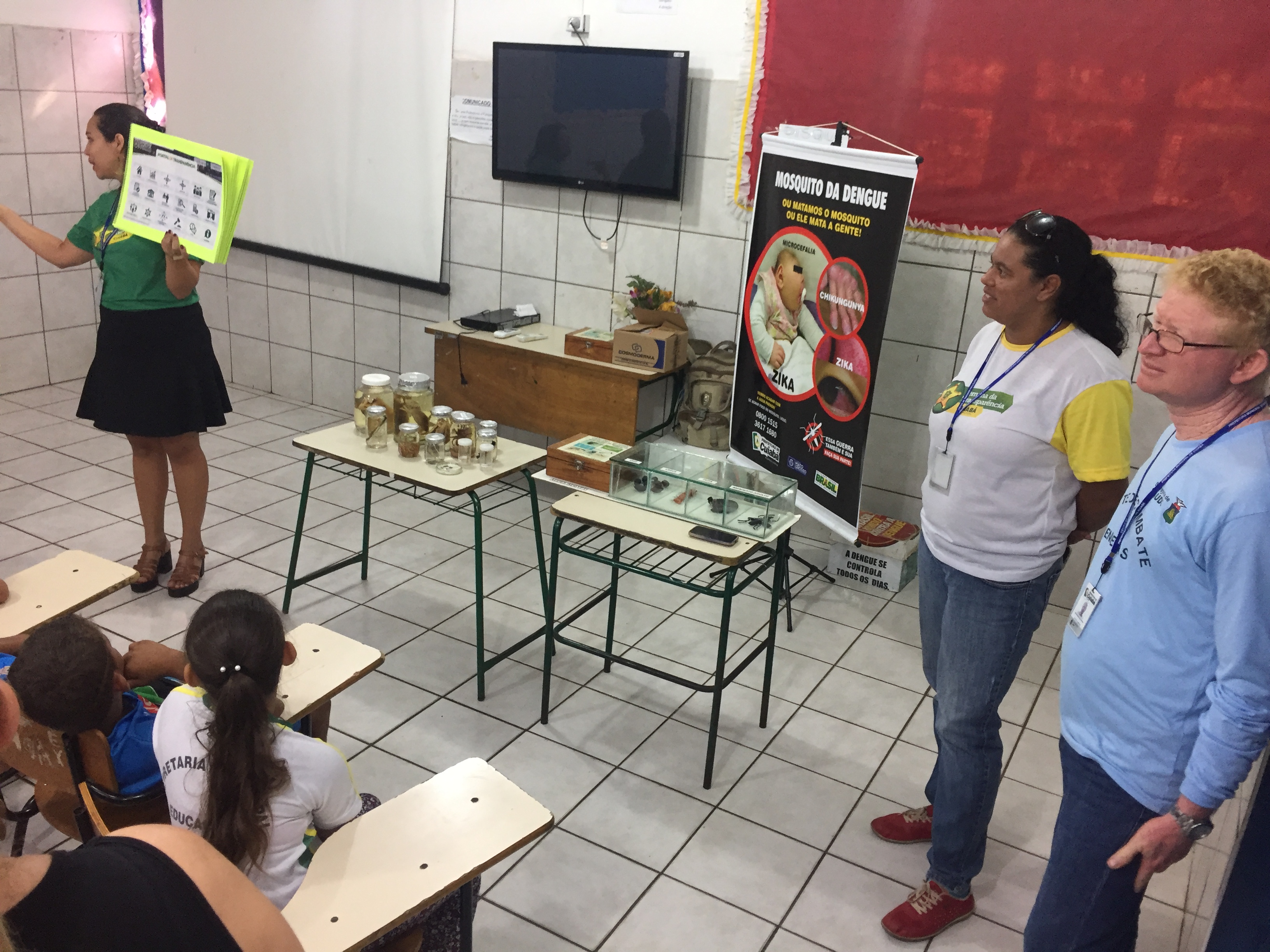 Com folders educativos e exemplares de algumas espécies de animais sinantrópicos como morcegos, caramujos, pombos, escorpiões e lacraias, os profissionais do Programa de Educação, Saúde e Controle em Zoonoses, da Coordenadoria de Vigilância em Zoonoses de Cuiabá (CCZ), conduziram a exposição apresentando o ciclo evolutivo do Aedes. Além disso, os estudantes aprenderam com a equipe da Controladoria como funciona a administração pública de uma cidade e foram norteados por meio de atividades lúdicas a respeito dos princípios éticos e morais