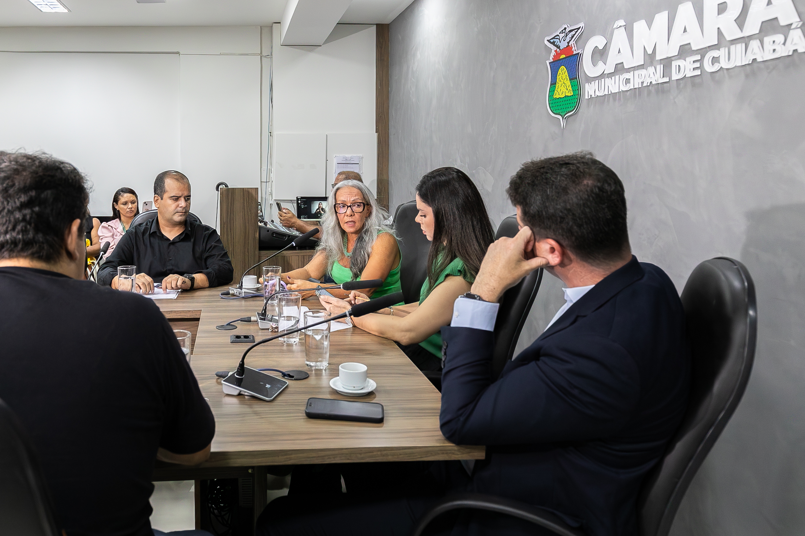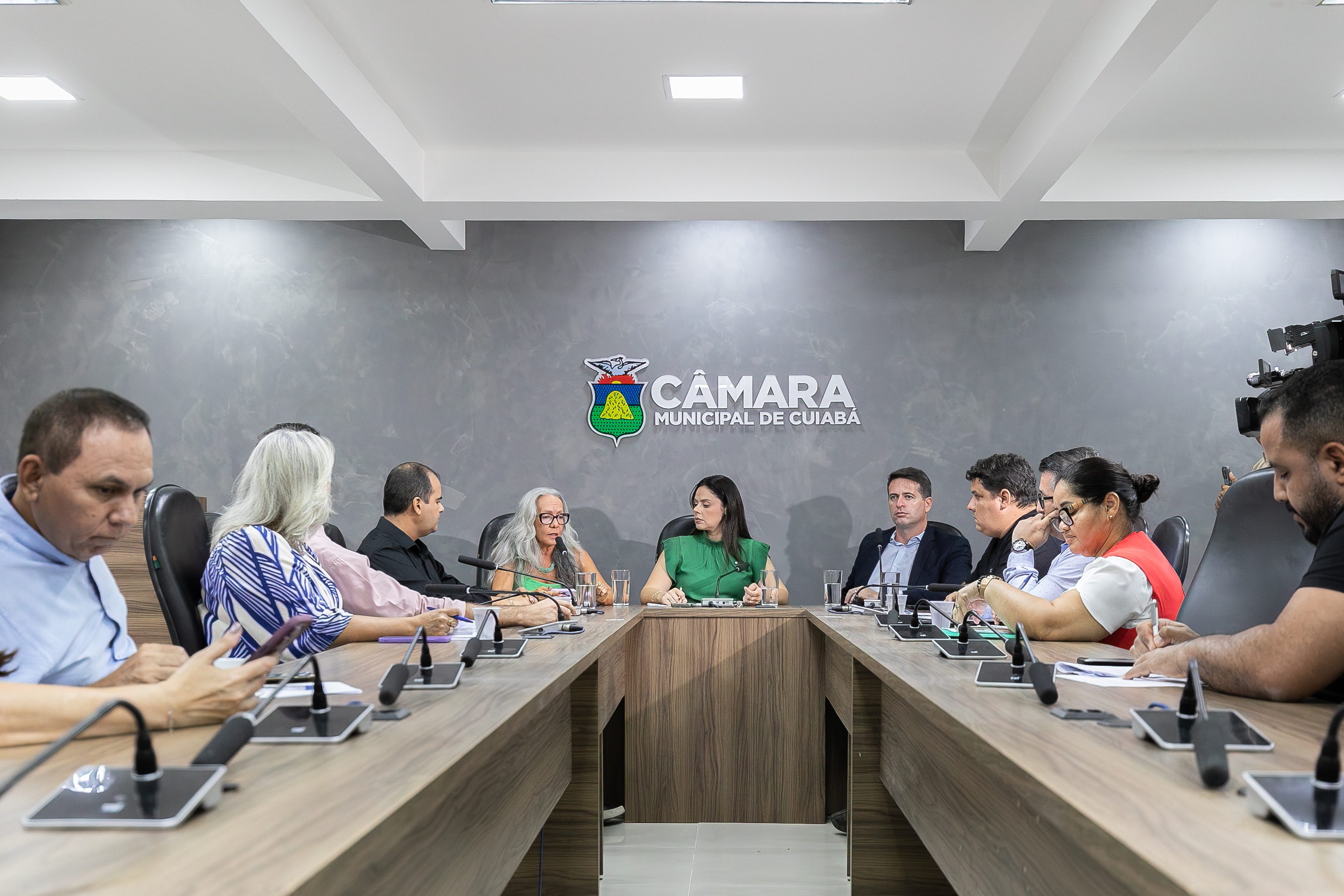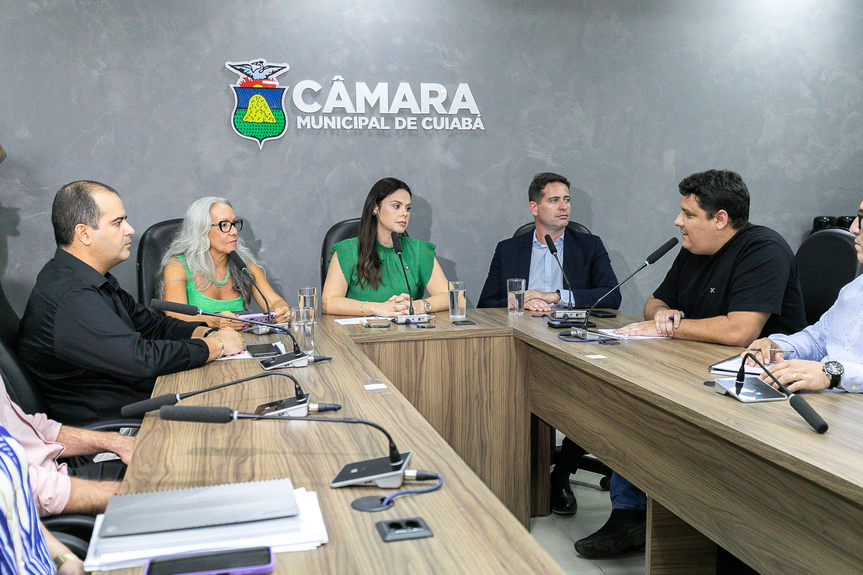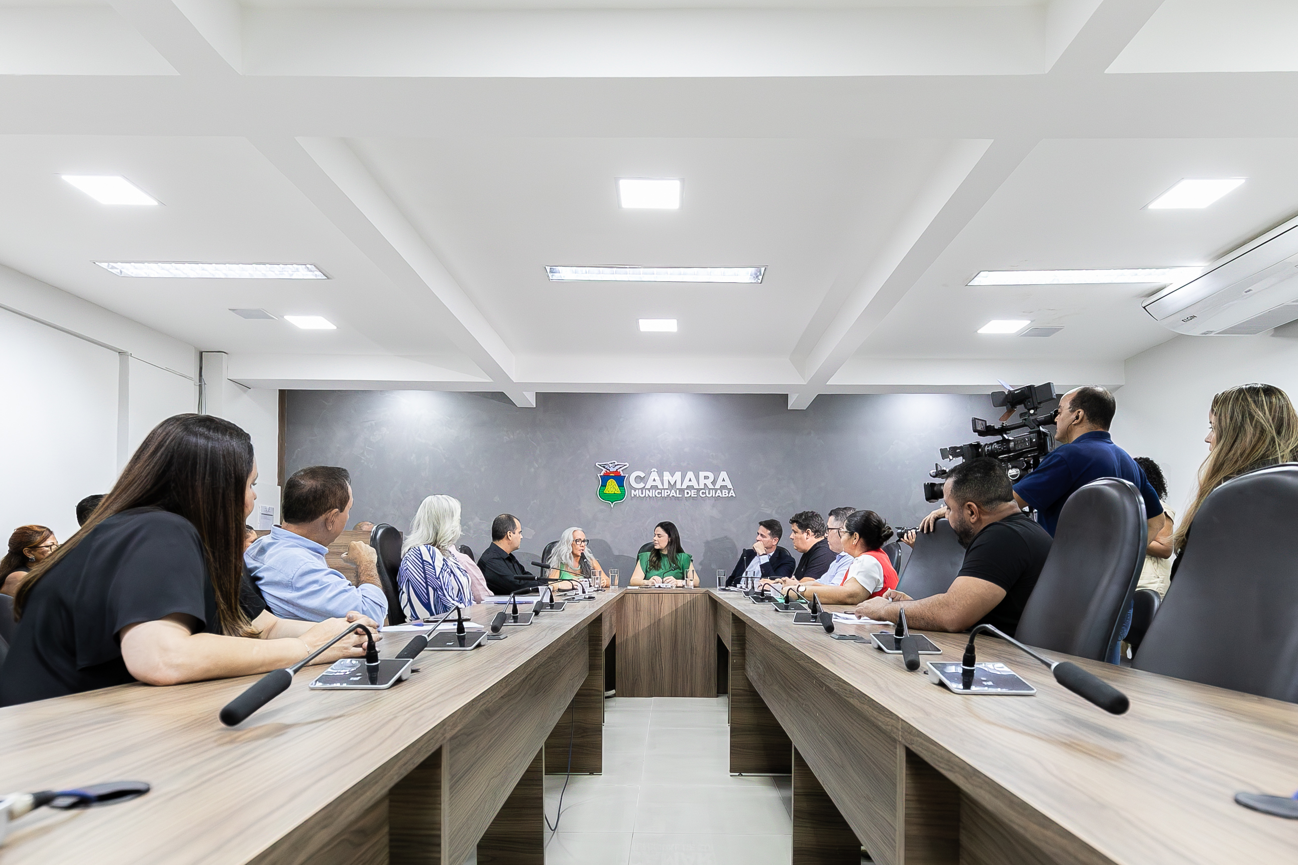 A imagem ilustra representantes de diversos poderes durante uma audiência pública, reunidos em volta de uma bancada de madeira. A parede ao fundo possui um tom cinza com a logo marca da Câmara Municipal de Cuiabá.