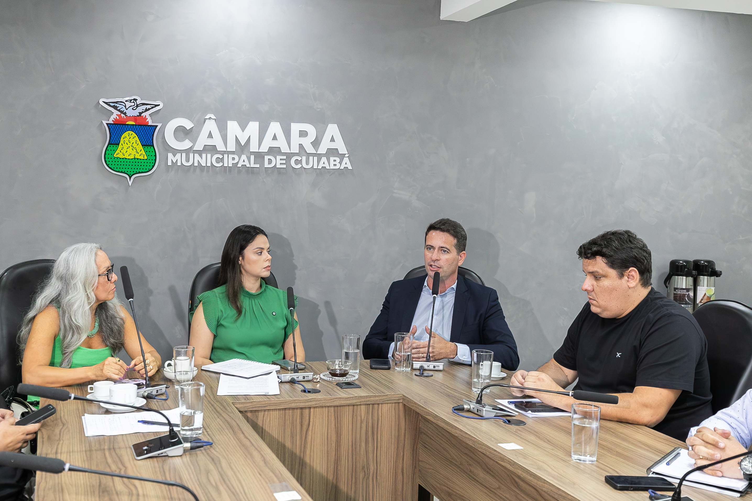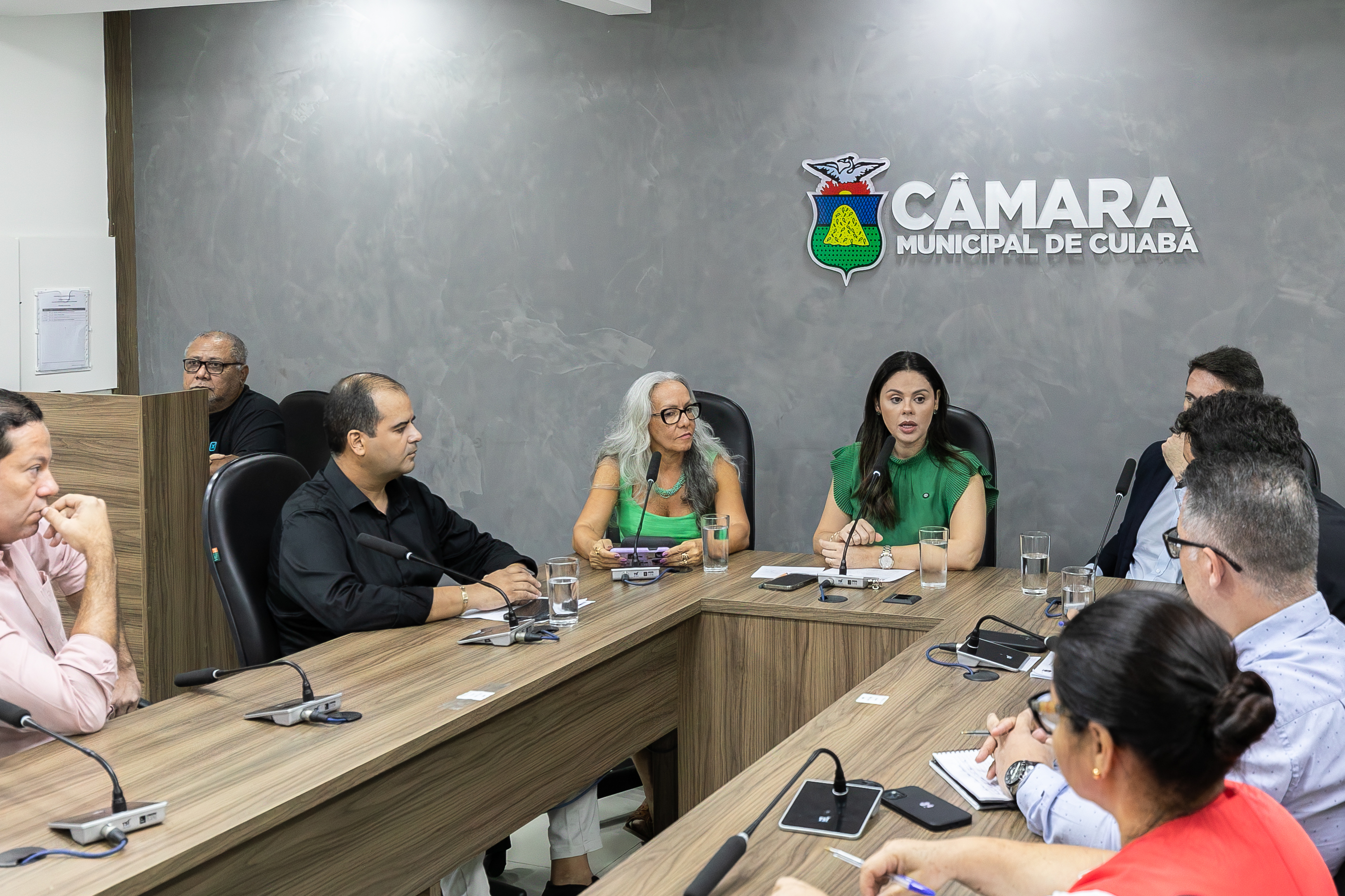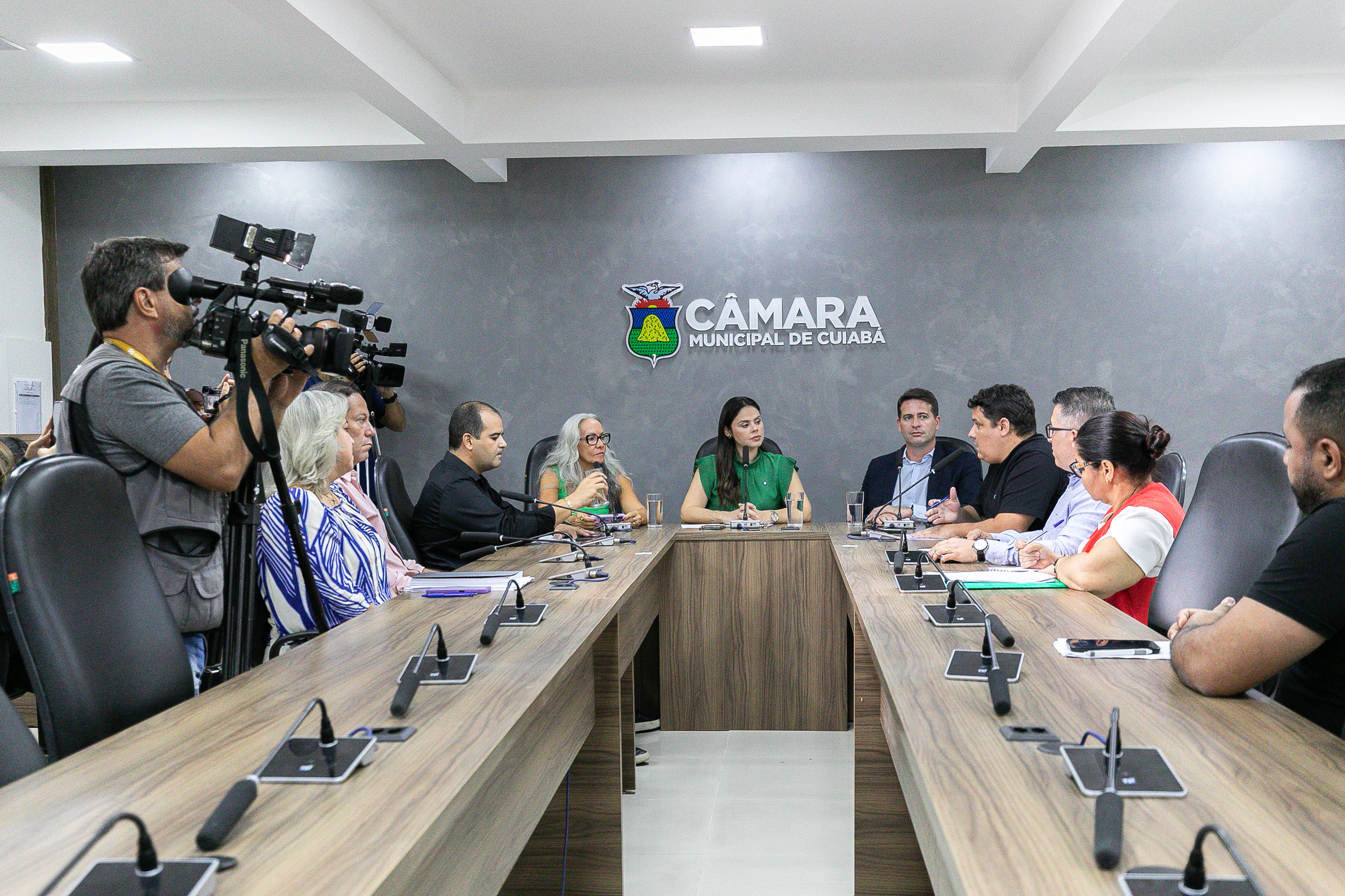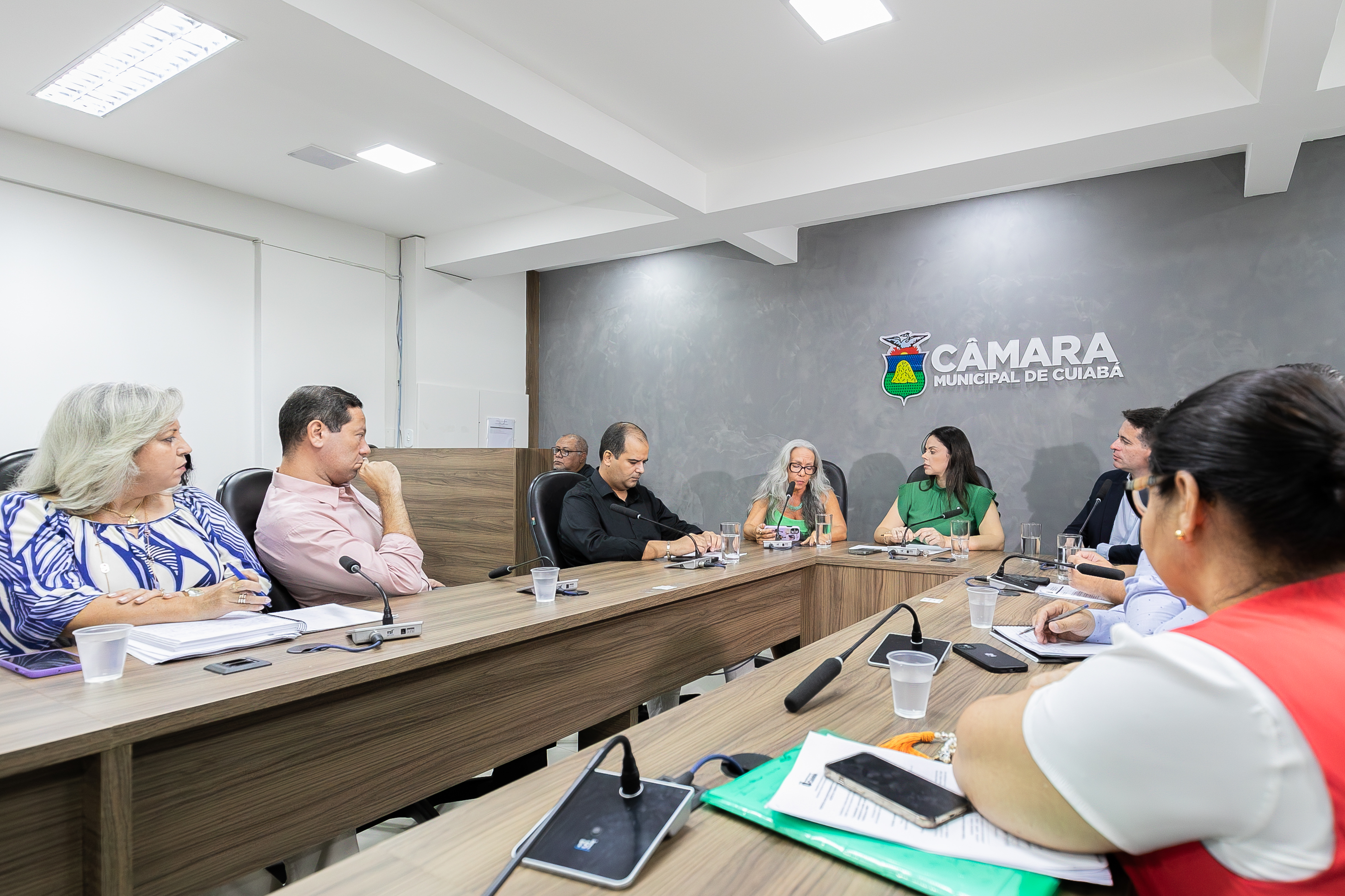 A imagem ilustra representantes de diversos poderes durante uma audiência pública, reunidos em volta de uma bancada de madeira. A parede ao fundo possui um tom cinza com a logo marca da Câmara Municipal de Cuiabá.