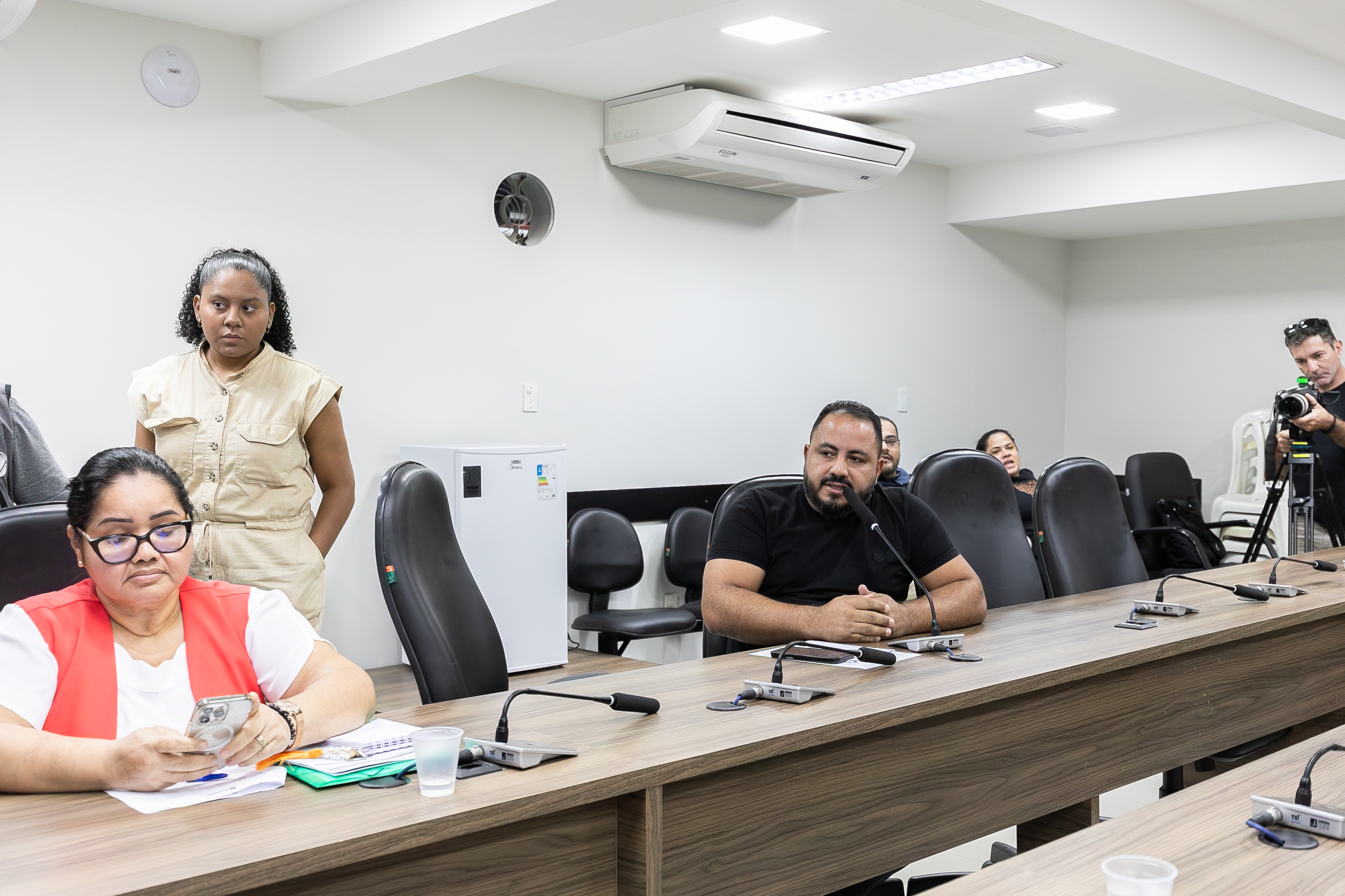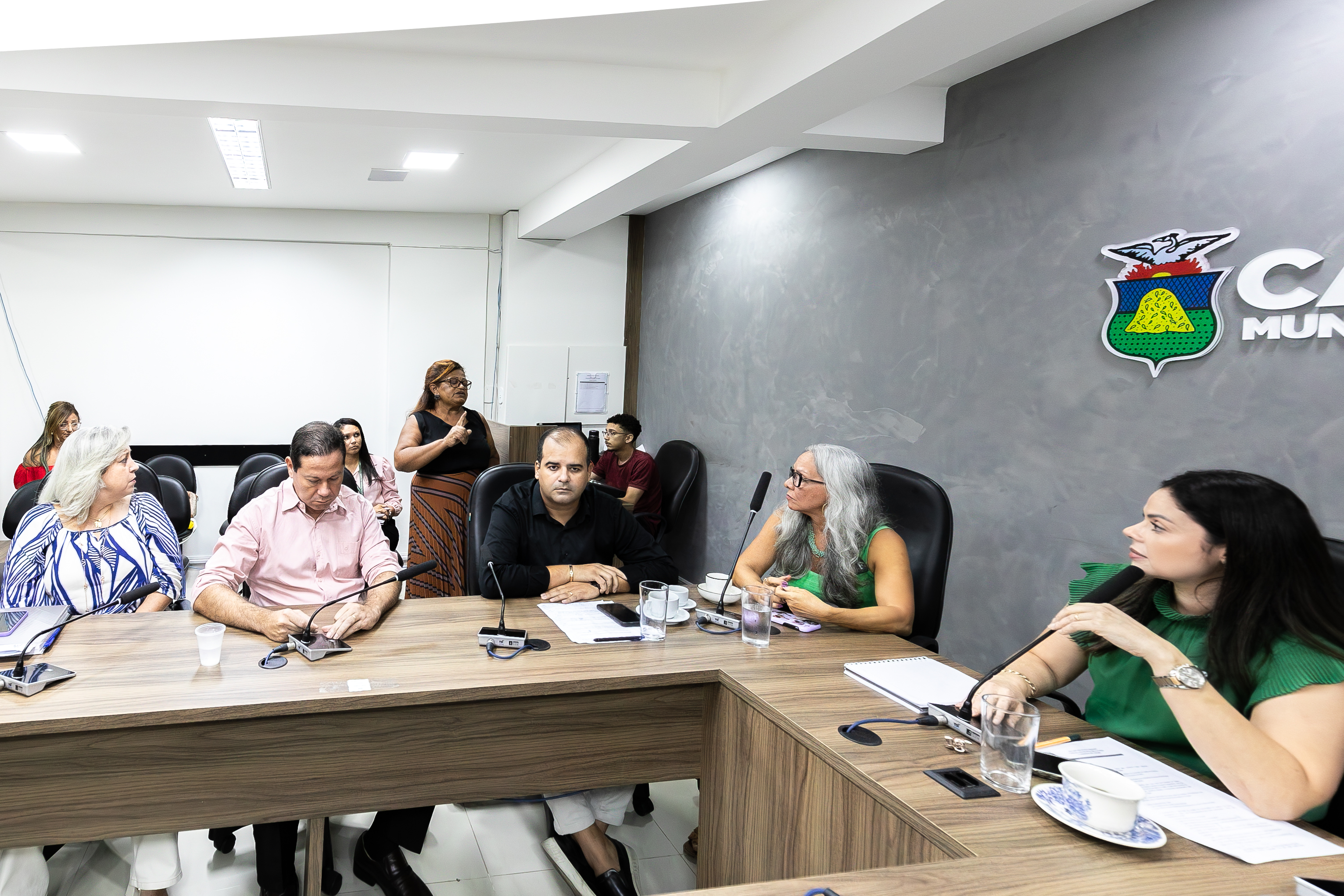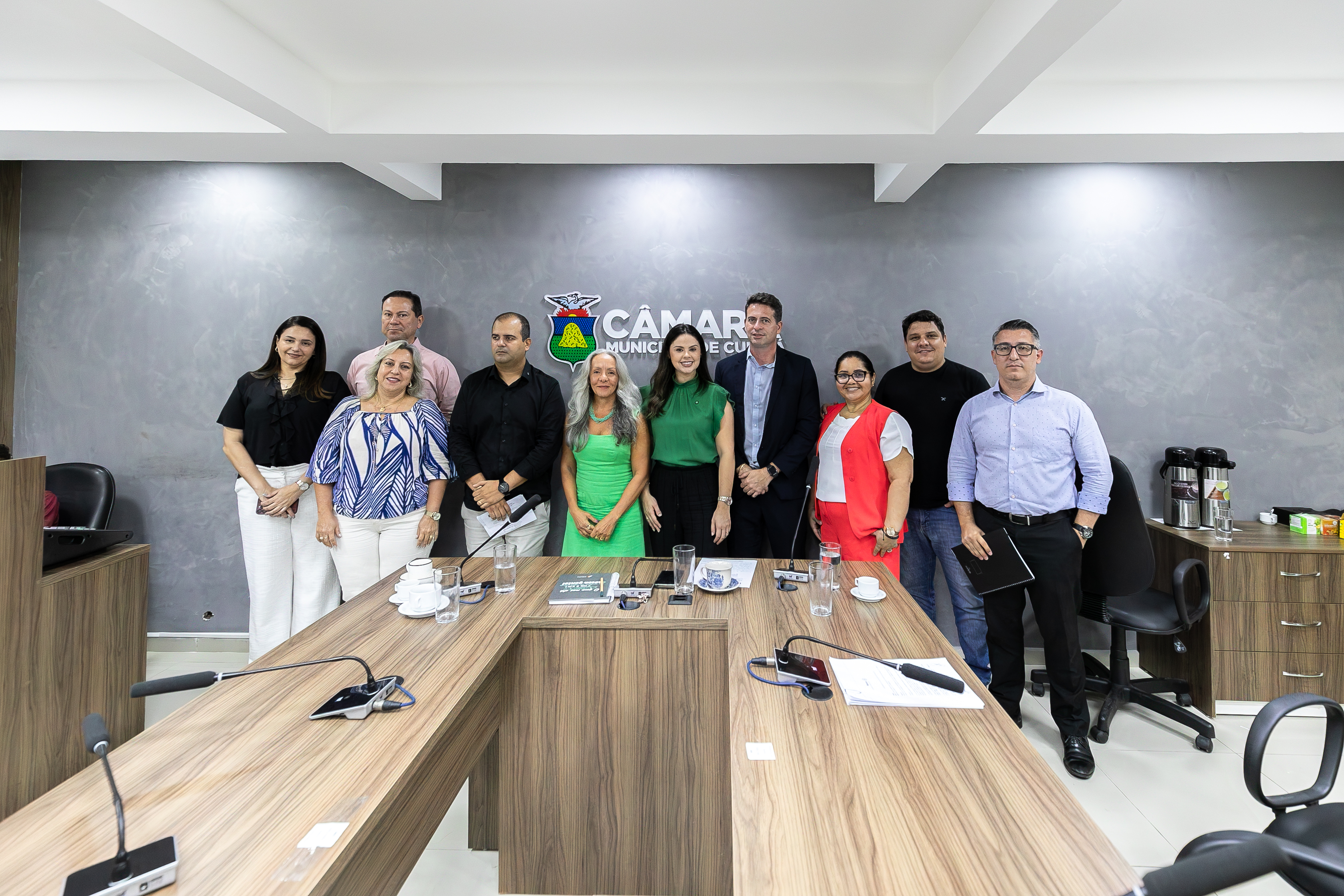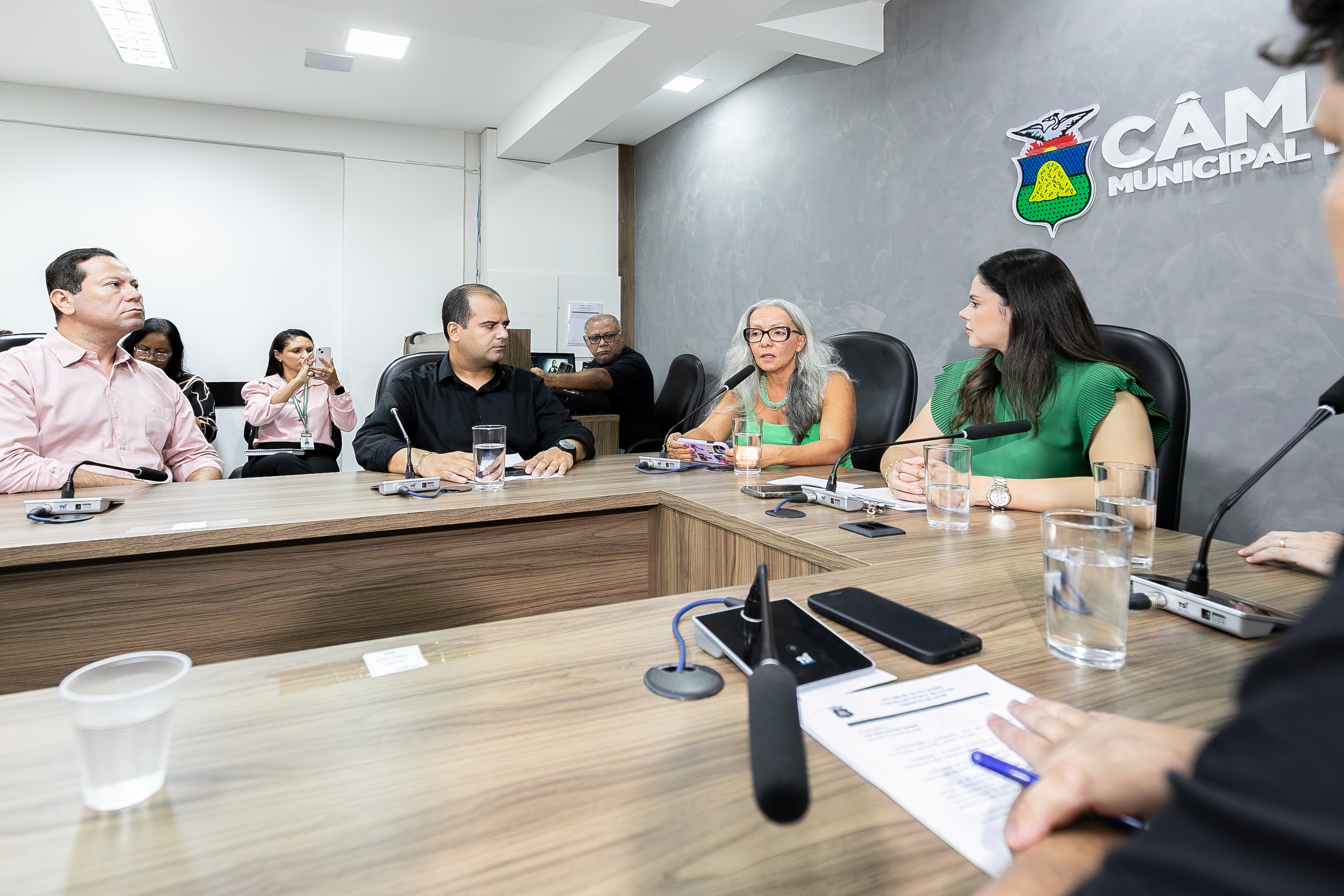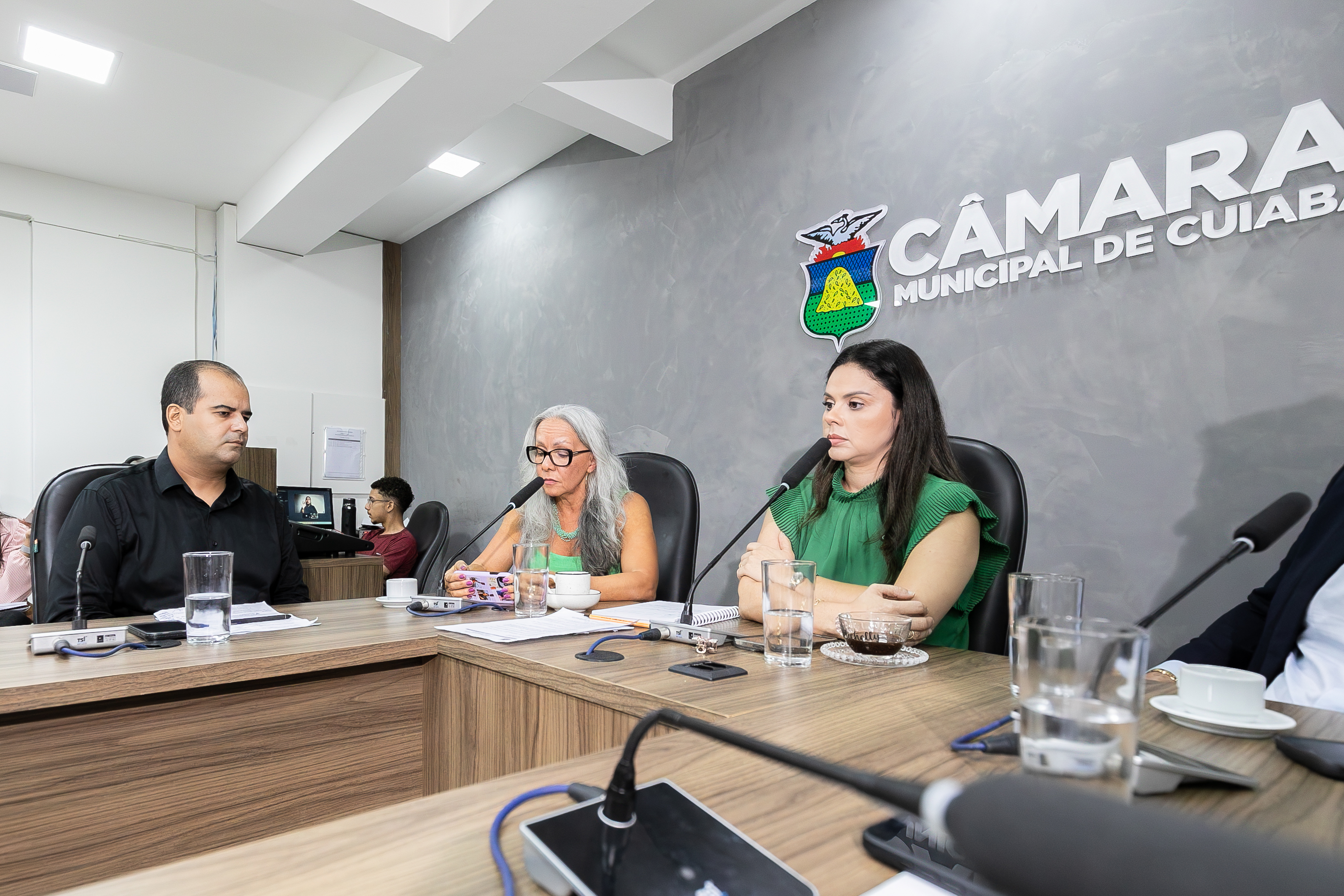 A imagem ilustra representantes de diversos poderes durante uma audiência pública, reunidos em volta de uma bancada de madeira. A parede ao fundo possui um tom cinza com a logo marca da Câmara Municipal de Cuiabá.