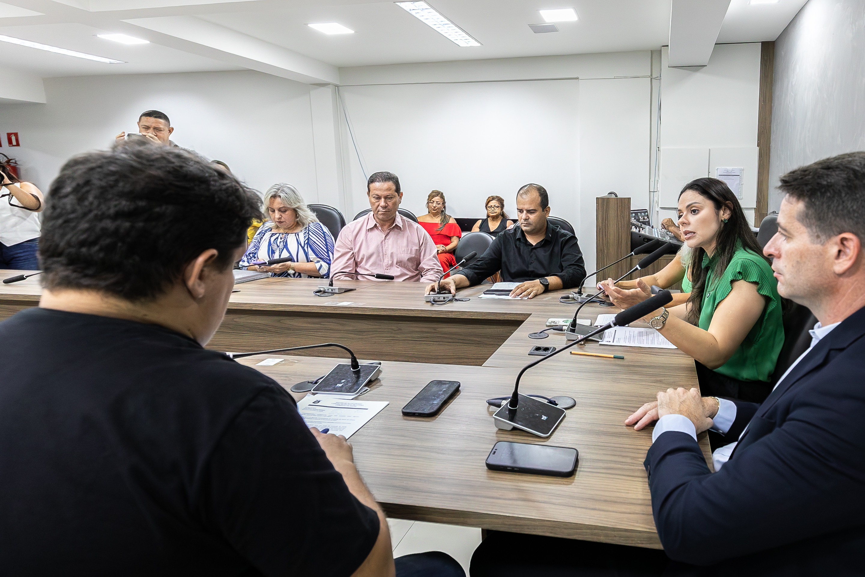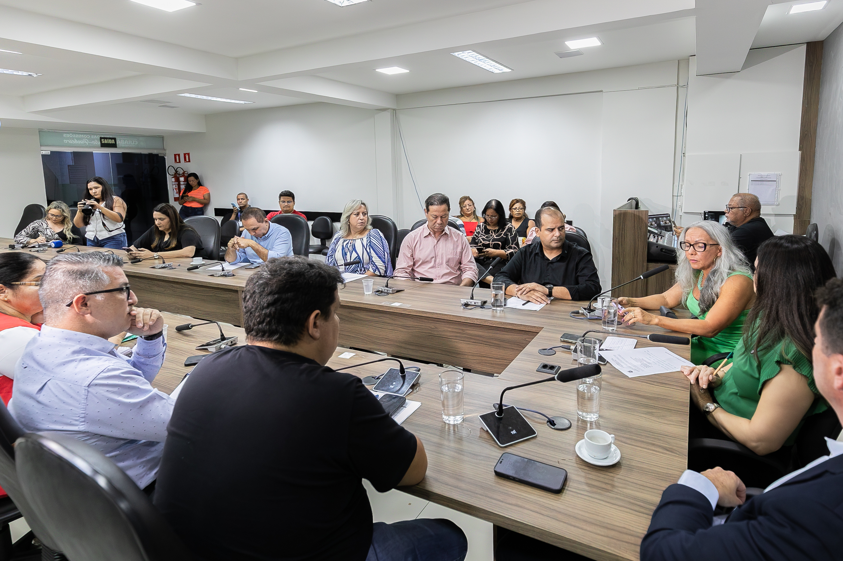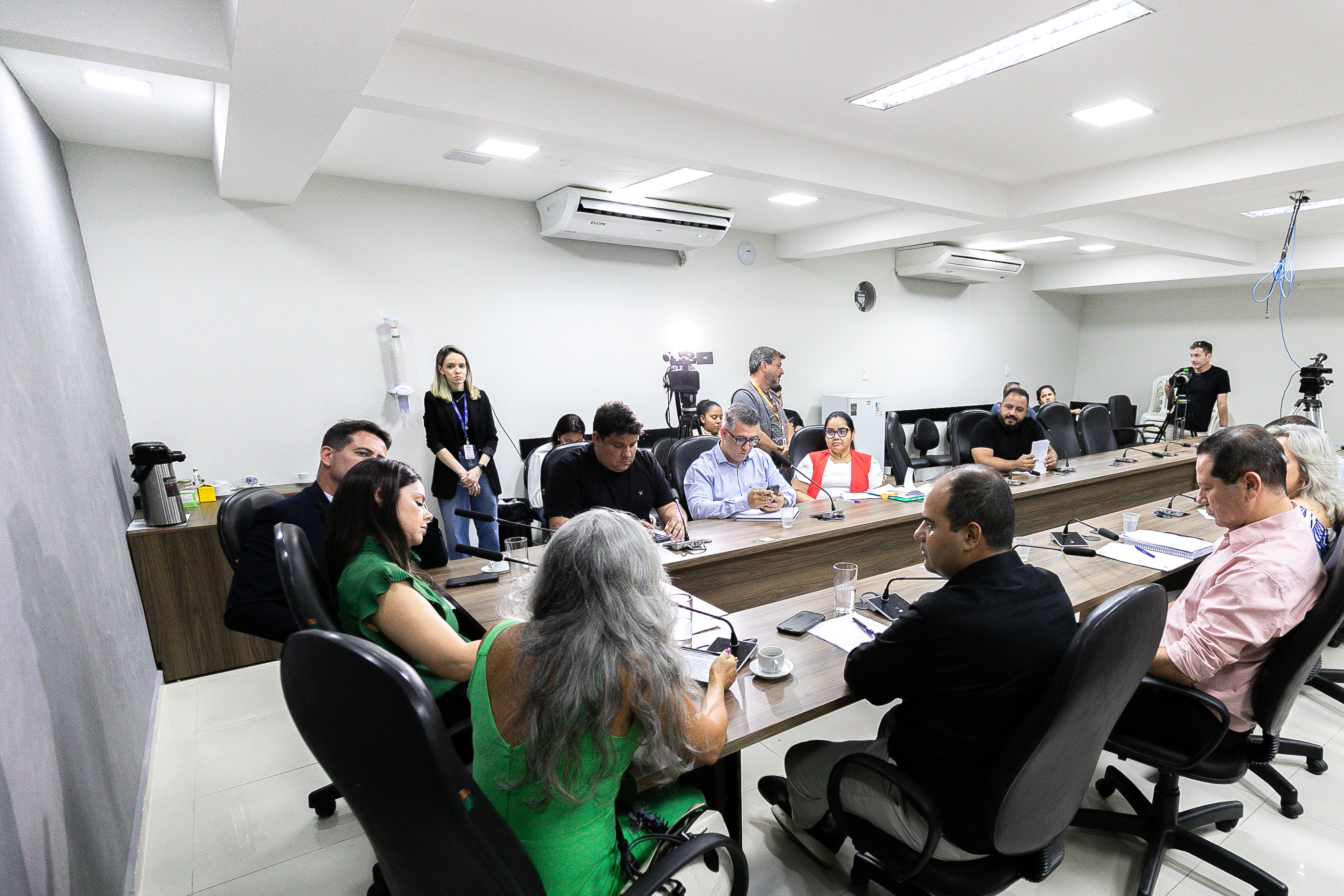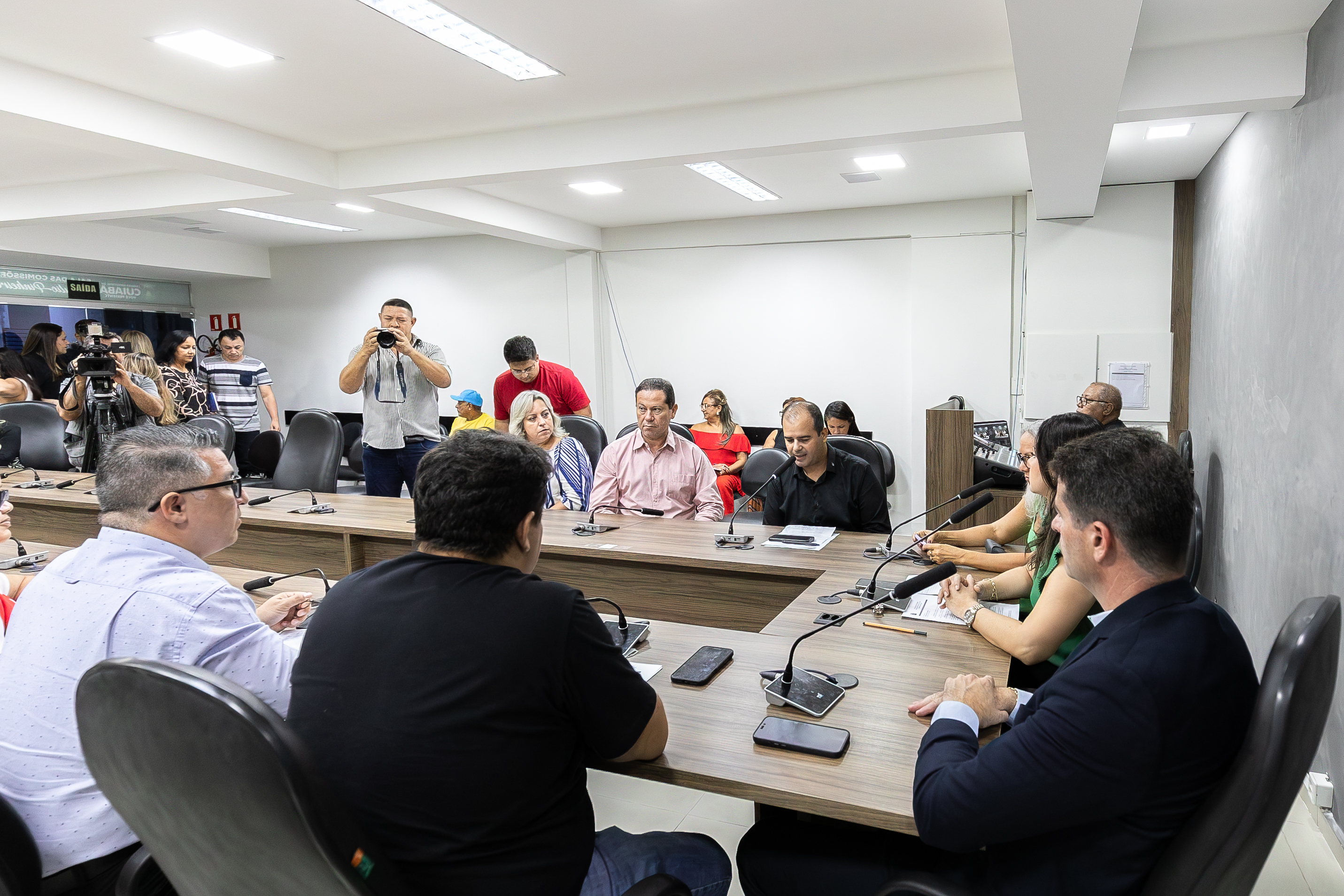 A imagem ilustra representantes de diversos poderes durante uma audiência pública, reunidos em volta de uma bancada de madeira. A parede ao fundo possui um tom cinza com a logo marca da Câmara Municipal de Cuiabá.