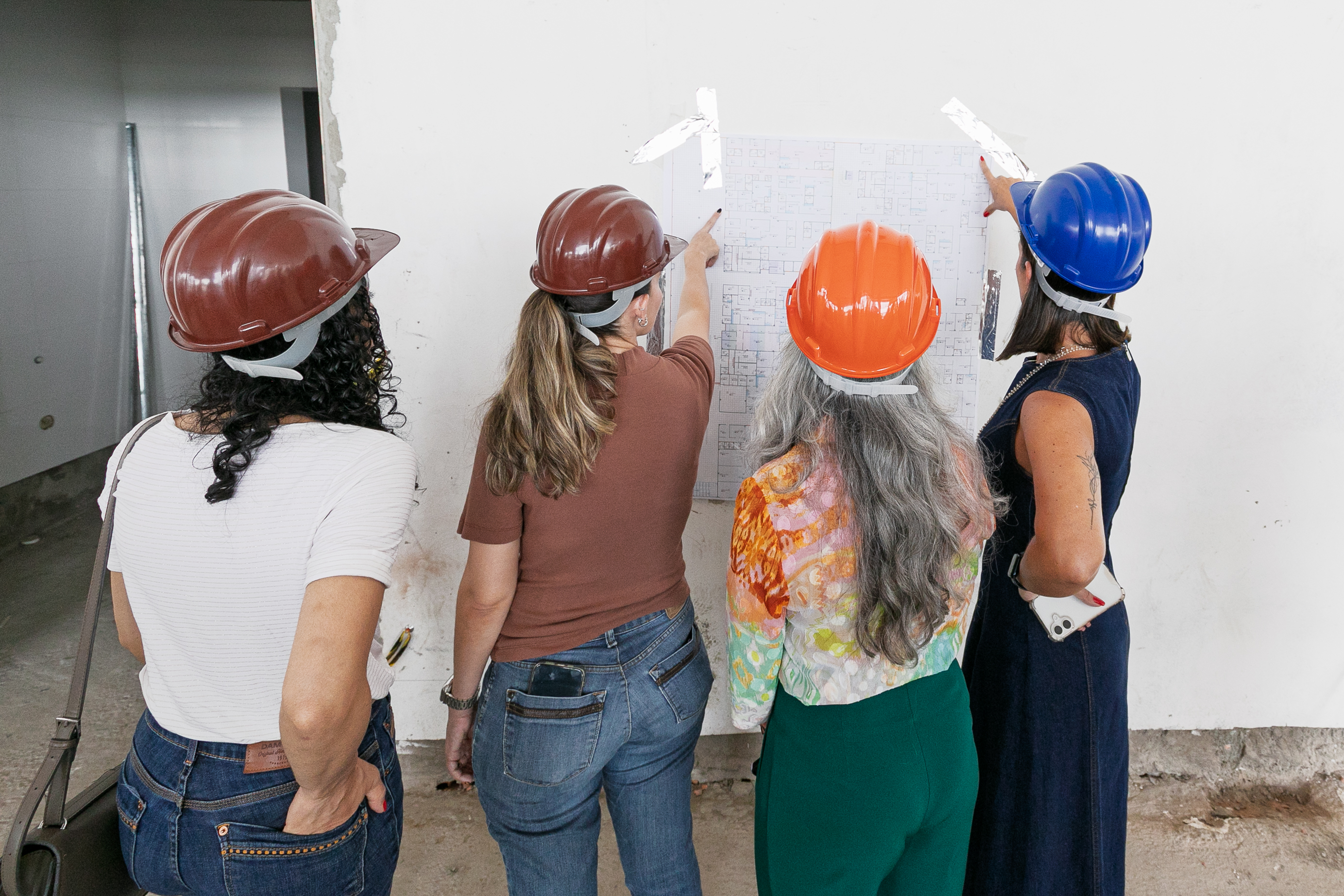 A imagem mostra a secretária de Saúde acompanhada de alguns representantes da empresa que administra o Hospital Universitário Júlio Müller. A gestora realiza uma visita técnica ao canteiro de obras onde será construído o novo HUJM.