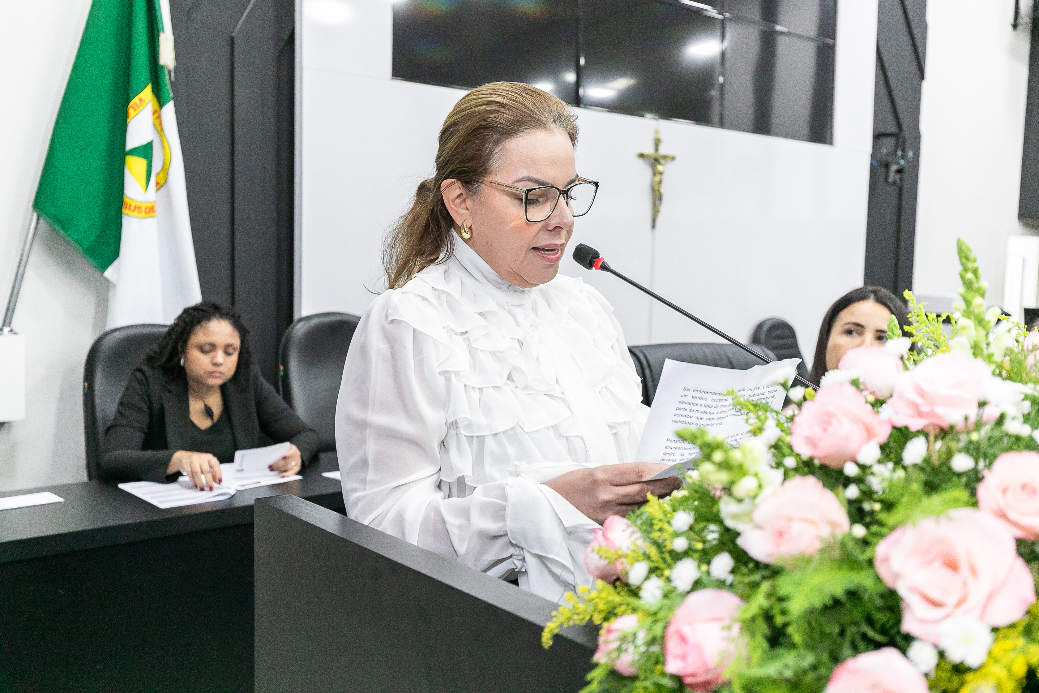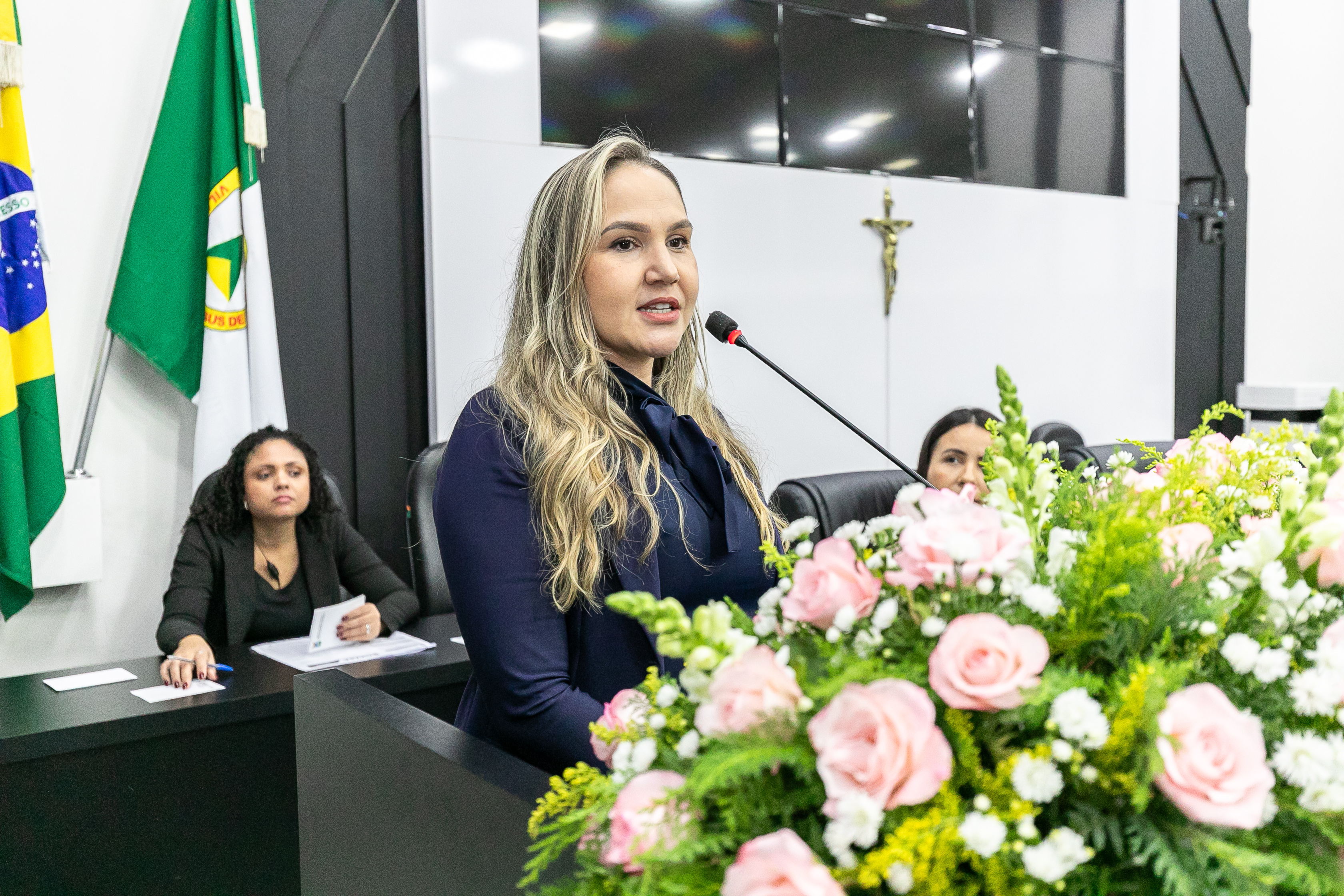 A foto mostra o momento em que a secretária da Mulher fala ao público, no auditório das deliberações da Câmara Municipal de Cuiabá.