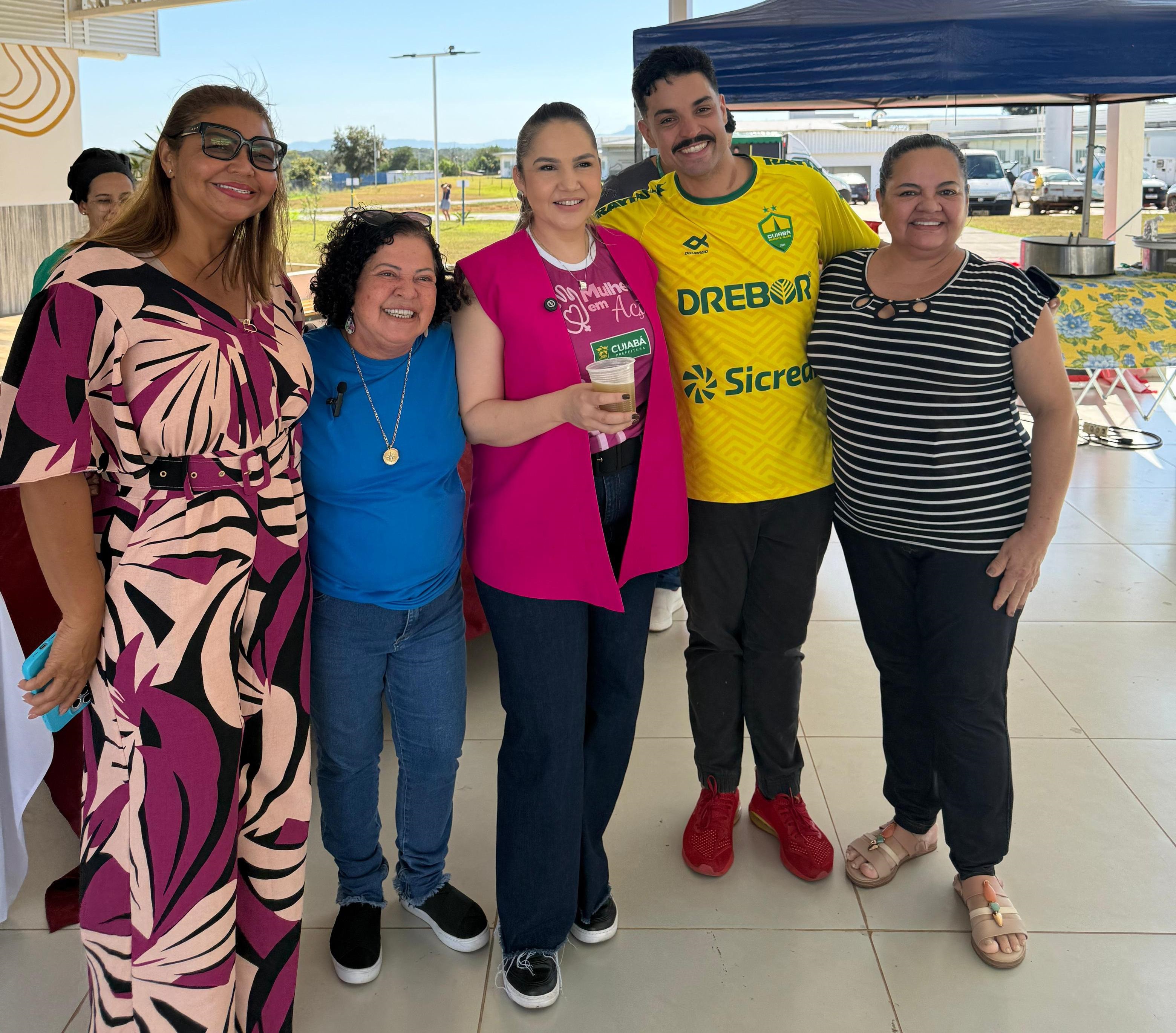 A foto mostra a secretária da Mulher de Cuiabá, Hadassah Suzannah com a equipe da saúde que realizou atendimento durante o evento no bairro Pedra 90.