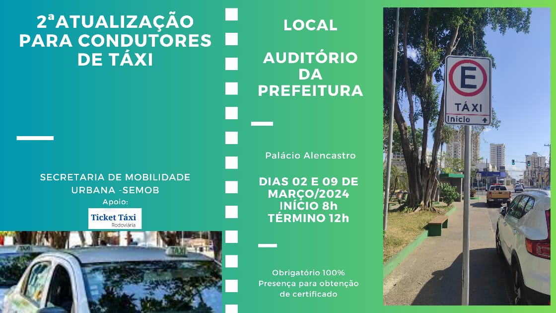 A Prefeitura de Cuiabá, por meio do setor de transporte da Secretaria de Mobilidade Urbana (Semob), vai proporcionar curso gratuito para profissionais que atuam como condutores de táxi na capital. O curso, com aulas teóricas e carga horária de 8h, será ministrado em dois sábados consecutivos, no auditório do Palácio Alencastro, das 8h às 12h. Para participar, os candidatos devem preencher ficha de inscrição no setor de regularização de transporte da secretaria, localizada na Rua 13 de Junho, nº 1.289, Bairro Porto, das 8h às 17h. As inscrições se encerram nesta sexta-feira, 1º de março.