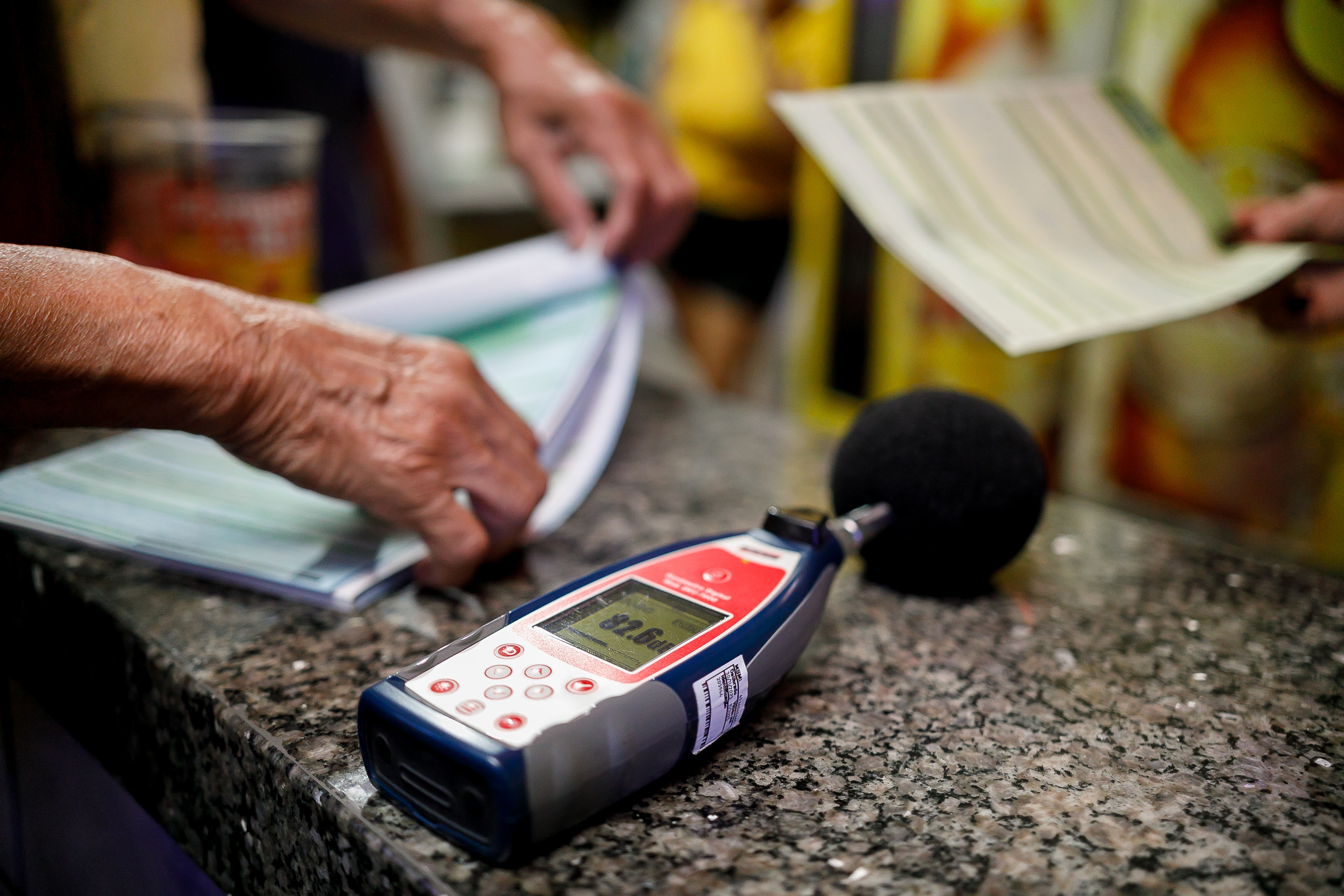 A foto mostra o momento da fiscalização e notificação junto com o medidor de nível de pressão sonora e uma. Abaixo tem uma galeria com fotos que mostram o momento da operação realizada pela Secretaria de Ordem Pública e da PM.