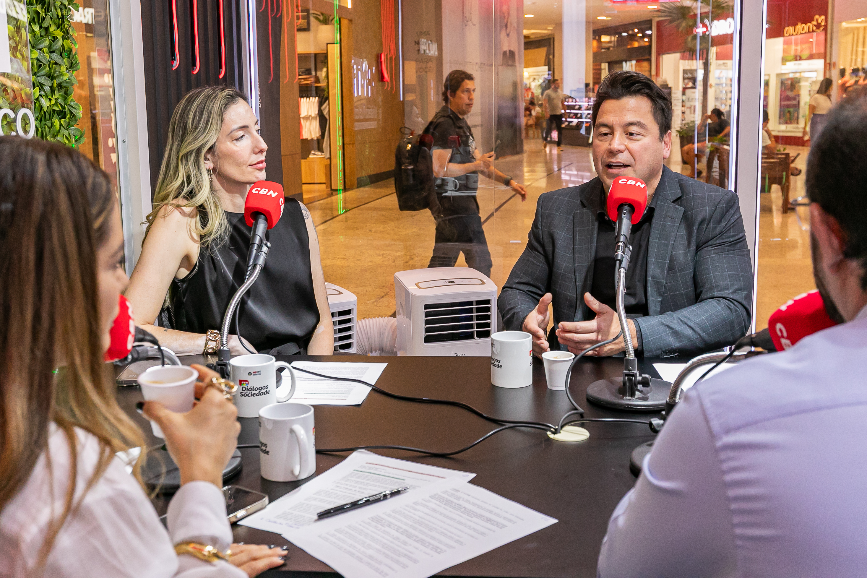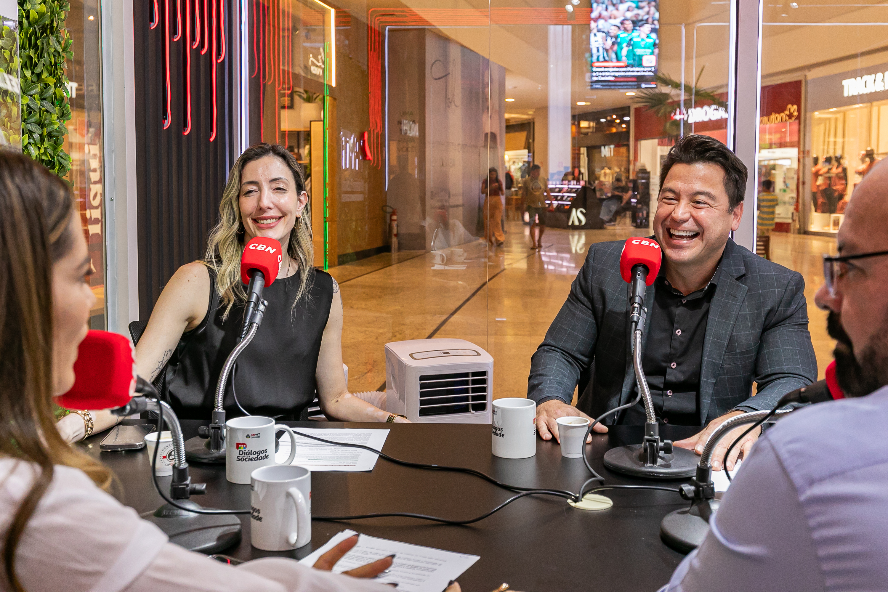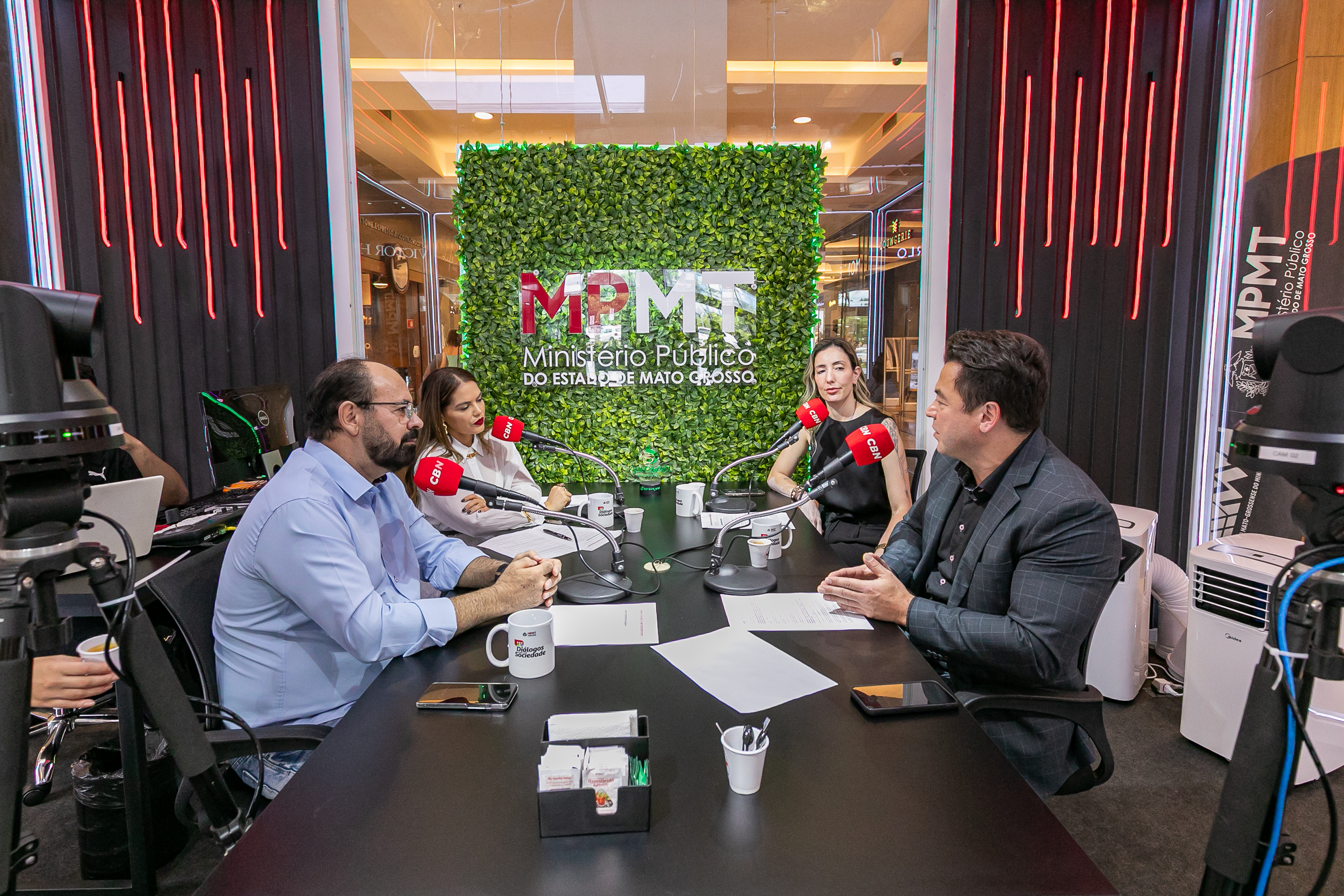 A foto mostra a secretária de Ordem Pública de Cuiabá, Juliana Chiquito Palhares, e o promotor de Justiça Mauro Poderoso de Souza no estúdio de vidro de frente à jornalista e apresentadora Marcela Vasconcelos e ao também apresentador e cientista político João Edison. Abaixo tem uma galeria de fotos que mostra outros momentos da entrevista.