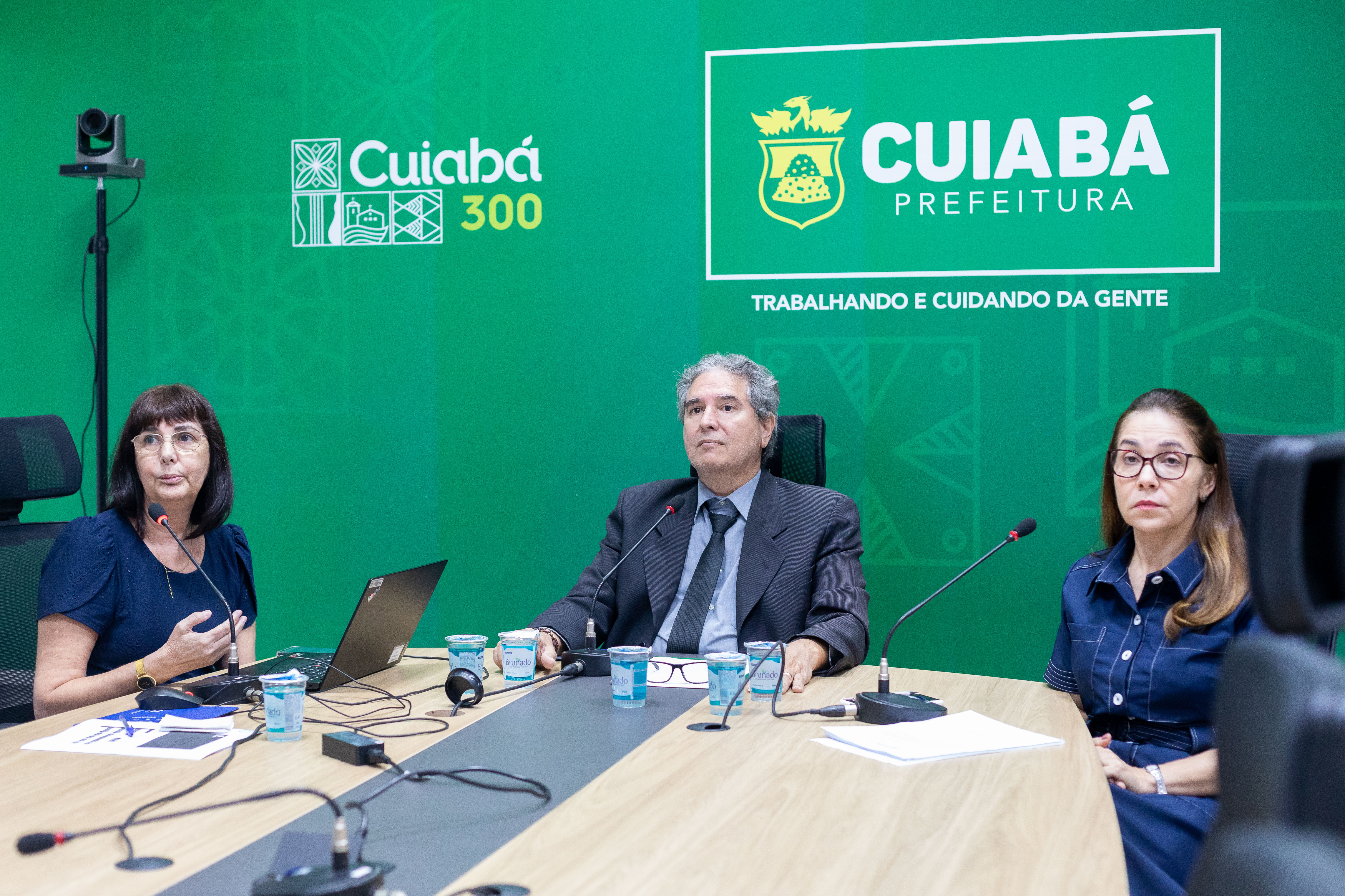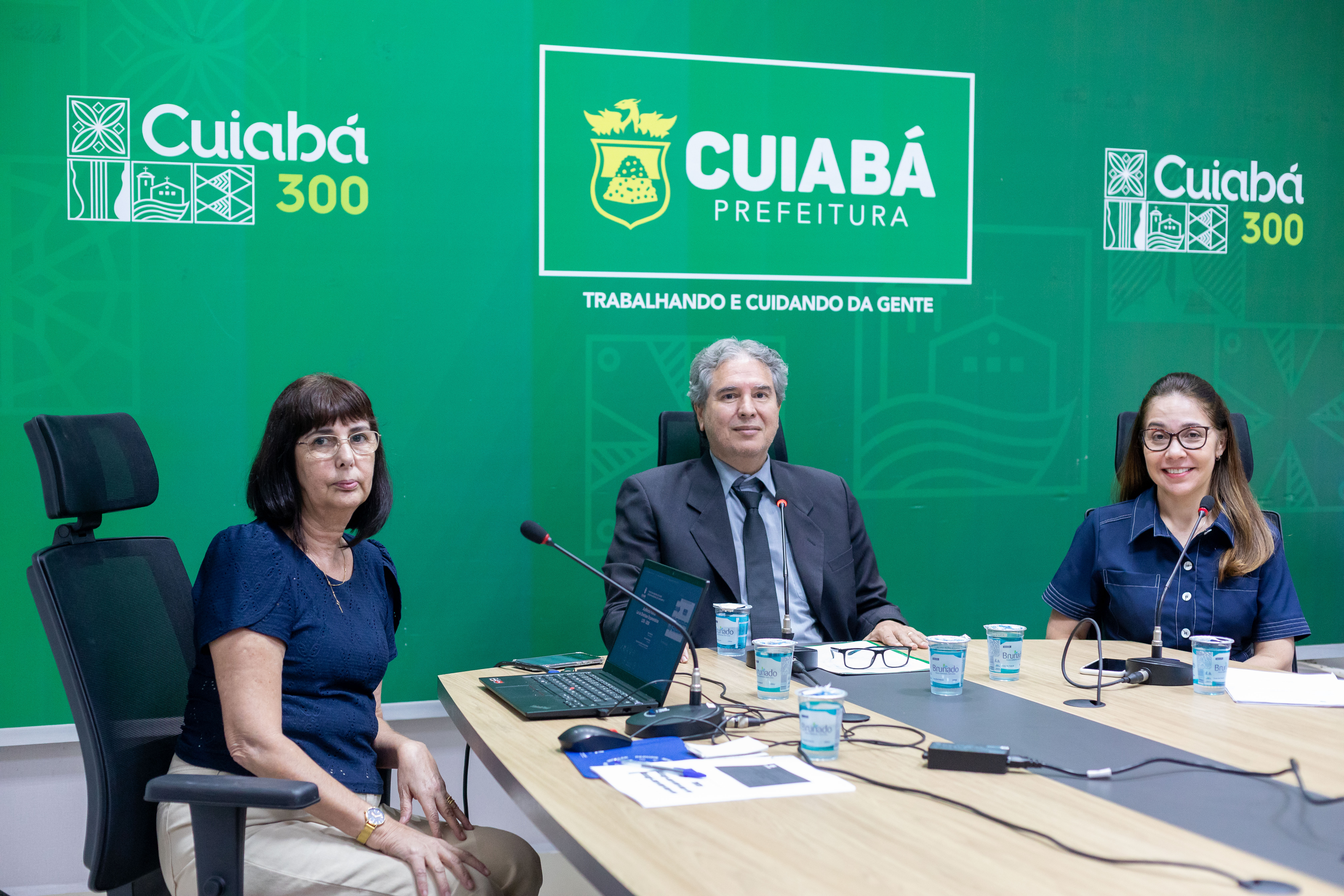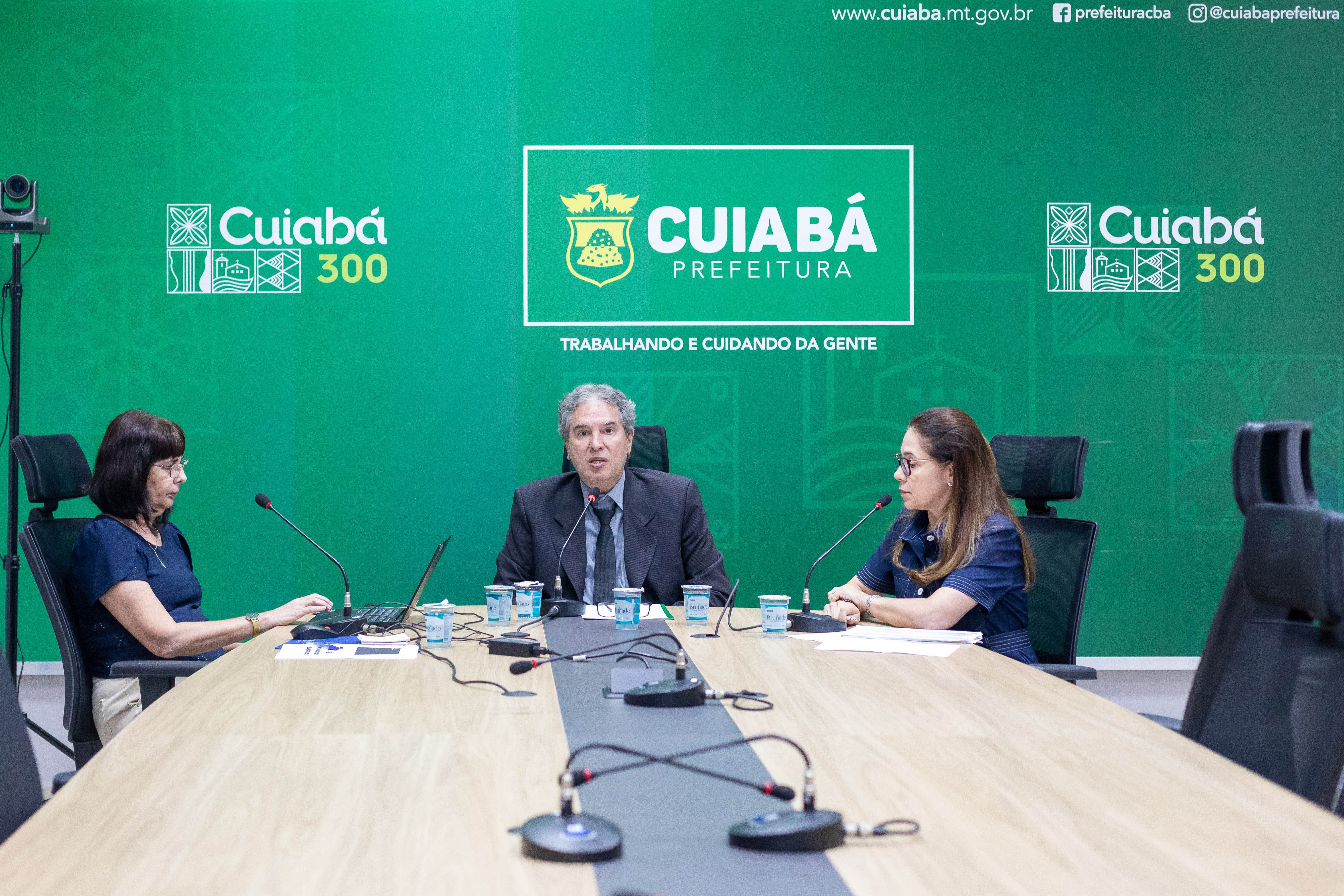 A foto ilustra o secretário Nivaldo Carvalho Júnior vestido de terno e gravata e sentado numa cadeira preta apoiado numa mesa de madeira. Em cada lado, está uma mulher que trabalha como suas auxiliares. No fundo, há um painel verde com o logotipo da Prefeitura de Cuiabá.