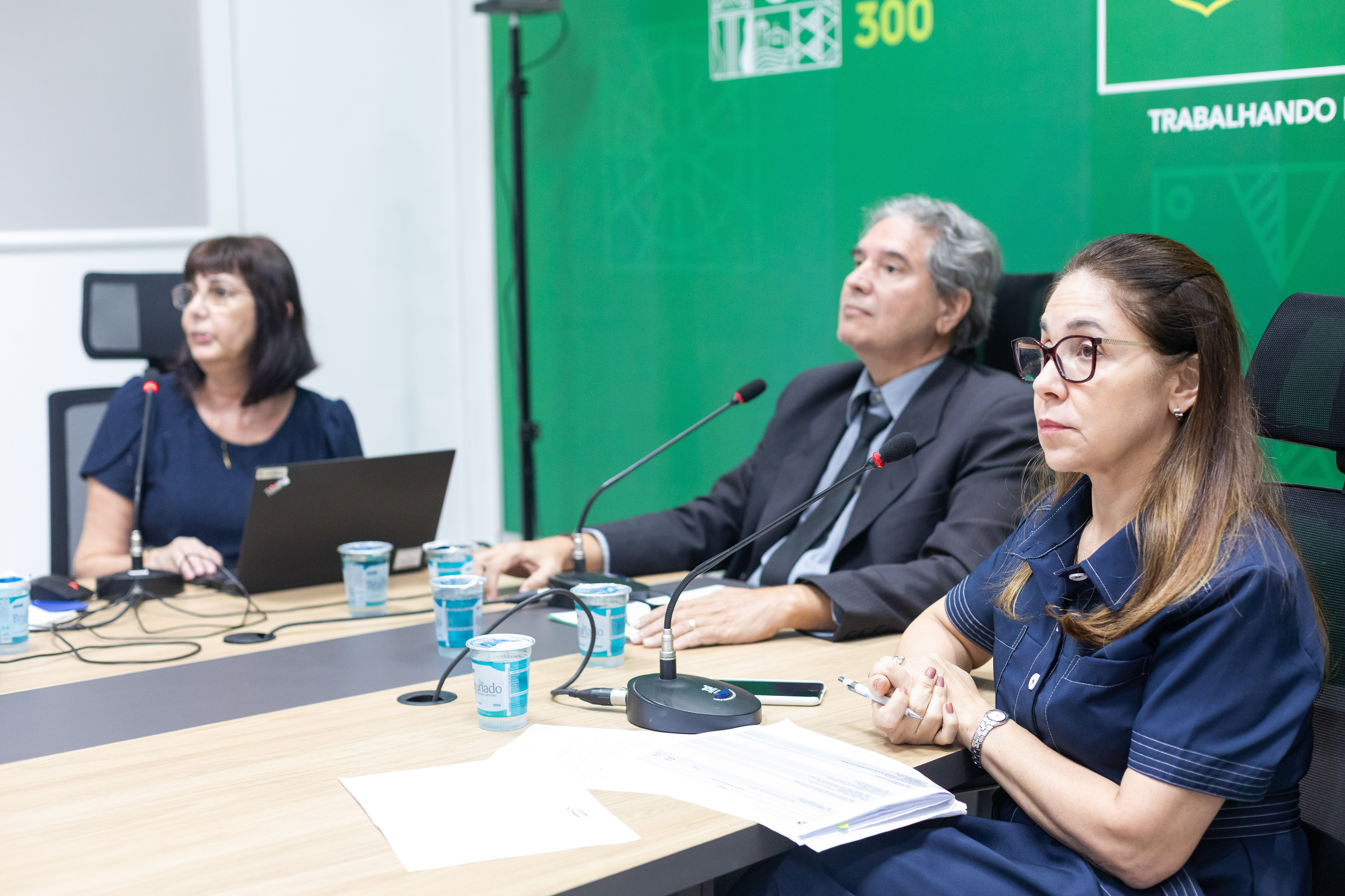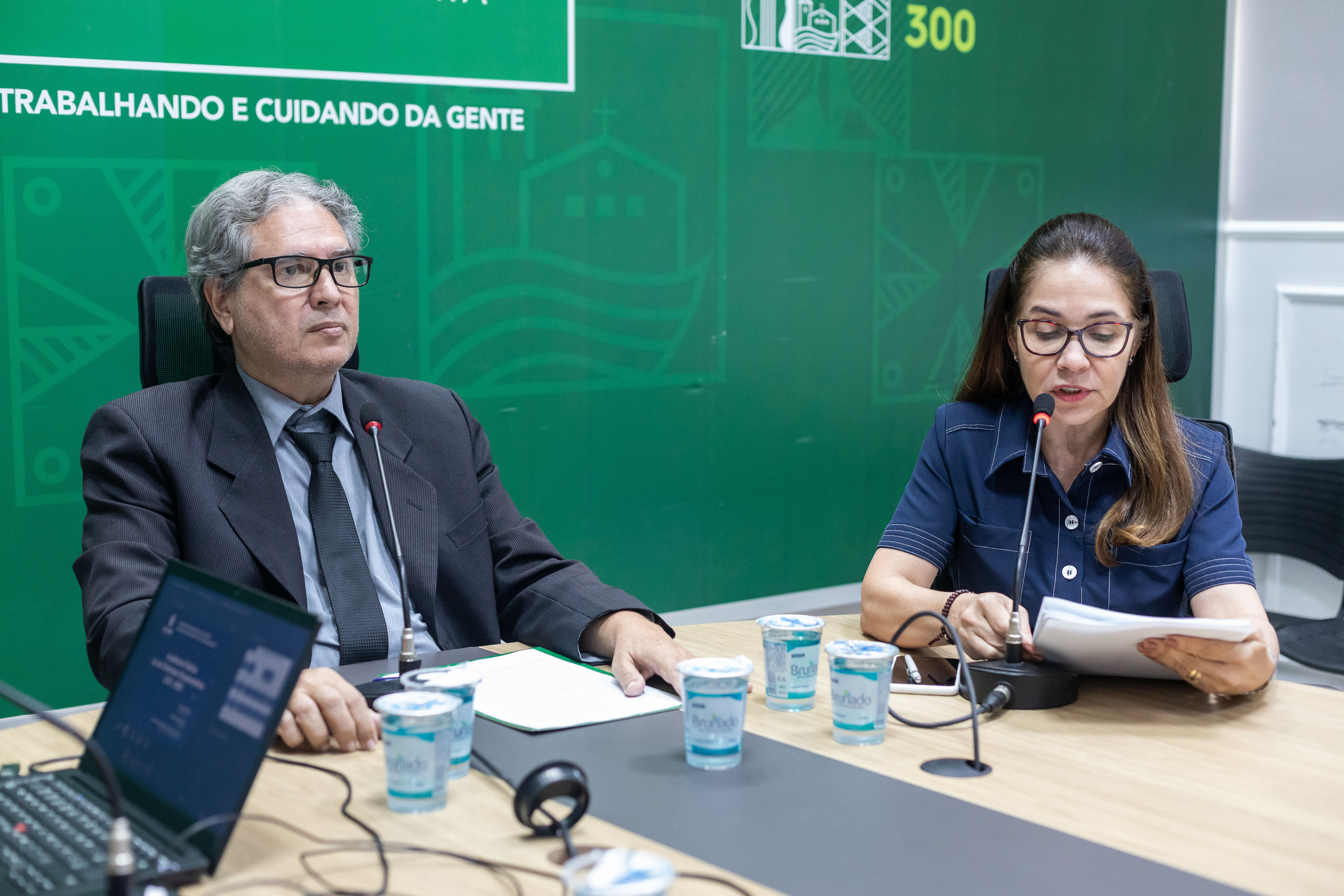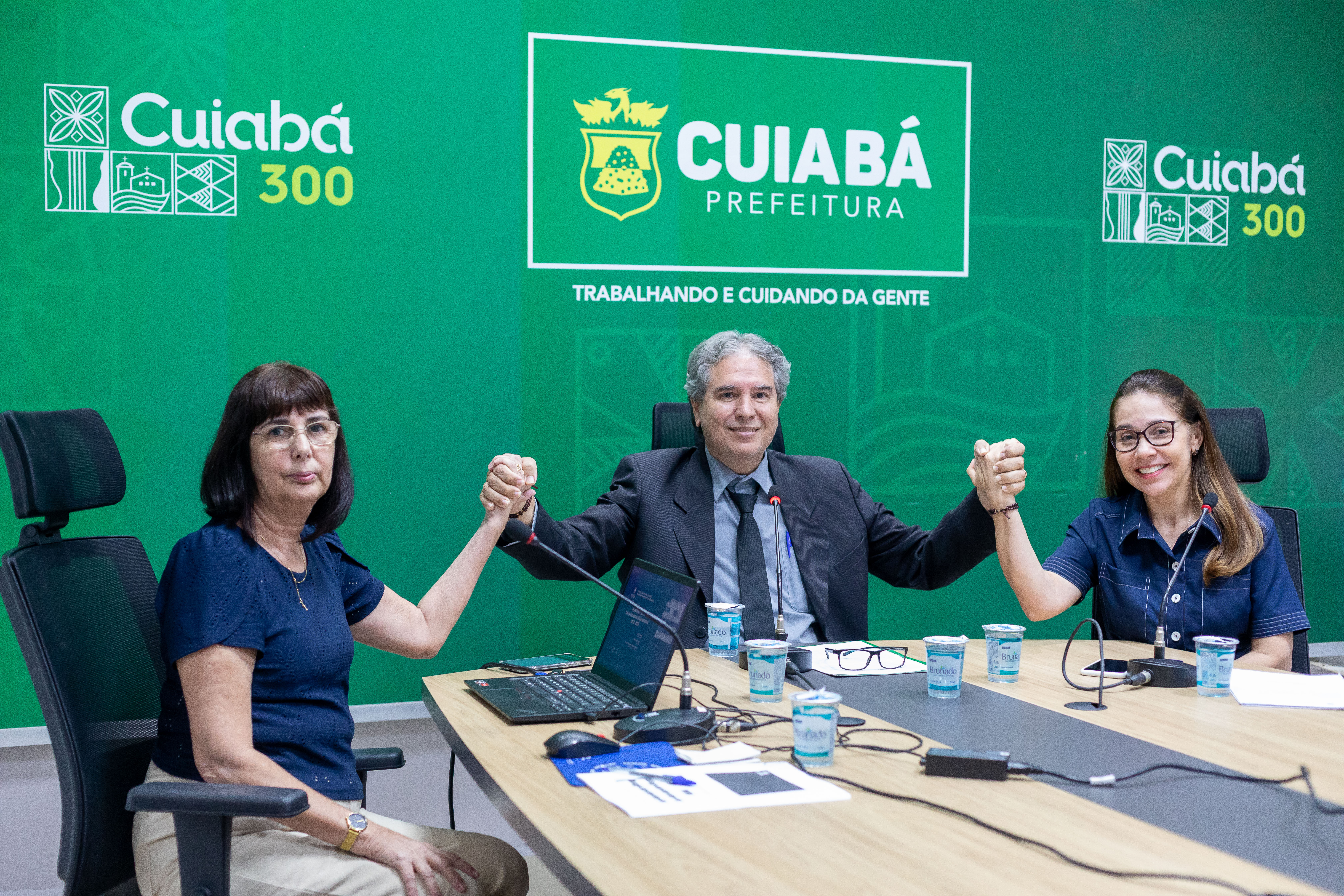 A foto ilustra o secretário Nivaldo Carvalho Júnior vestido de terno e gravata e sentado numa cadeira preta apoiado numa mesa de madeira. Em cada lado, está uma mulher que trabalha como suas auxiliares. No fundo, há um painel verde com o logotipo da Prefeitura de Cuiabá.