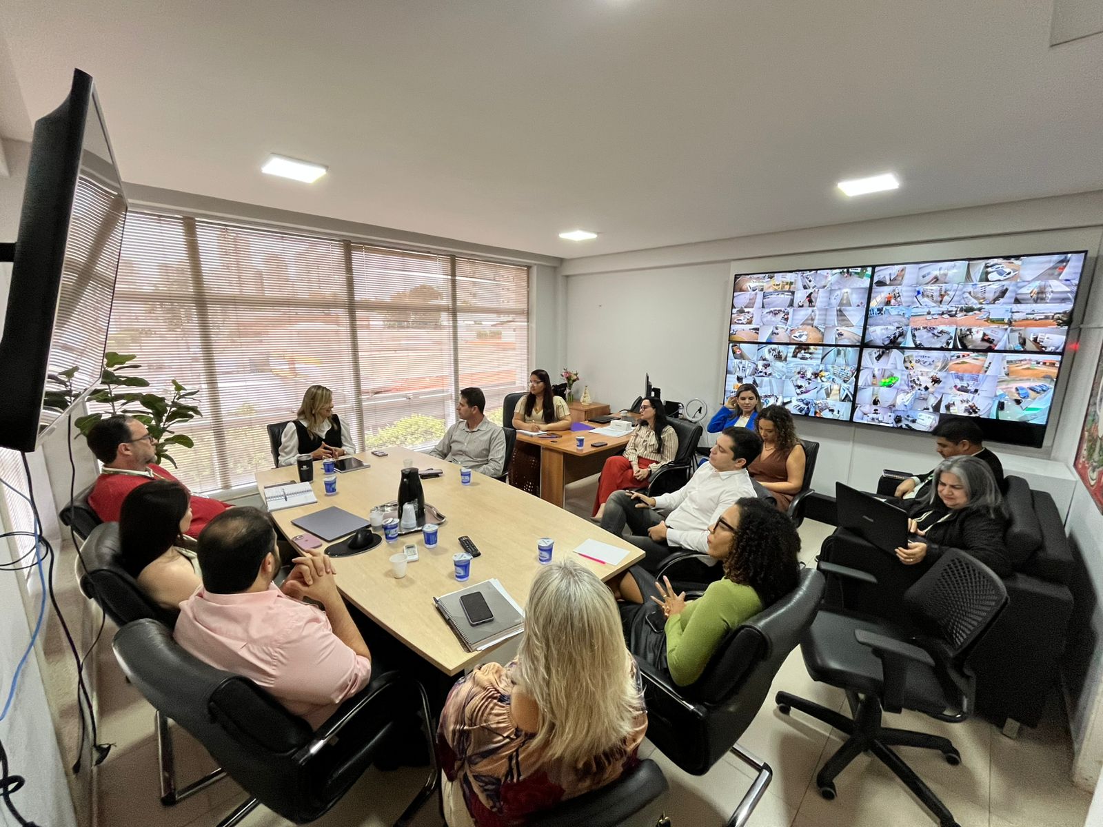 A imagem mostra um grupo de servidores participando de uma reunião. O local é amplo e possui, ao centro, uma mesa de reuniões. As paredes são brancas e há ainda uma parede totalmente de vidro.
