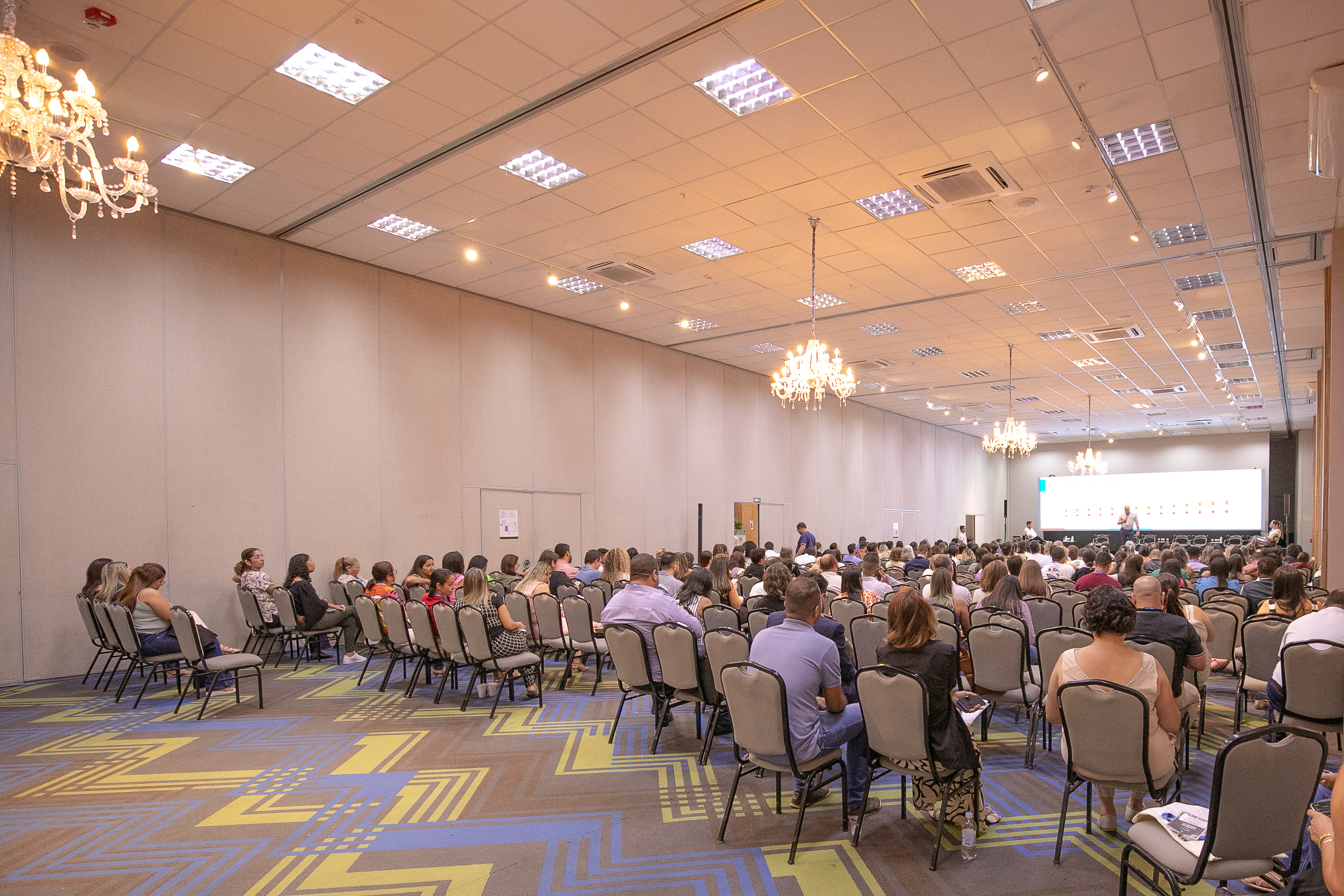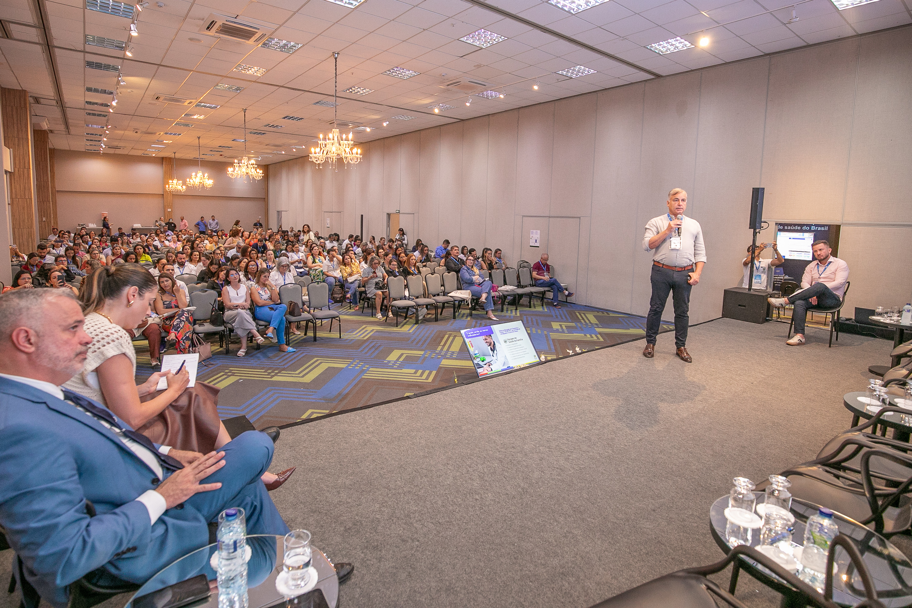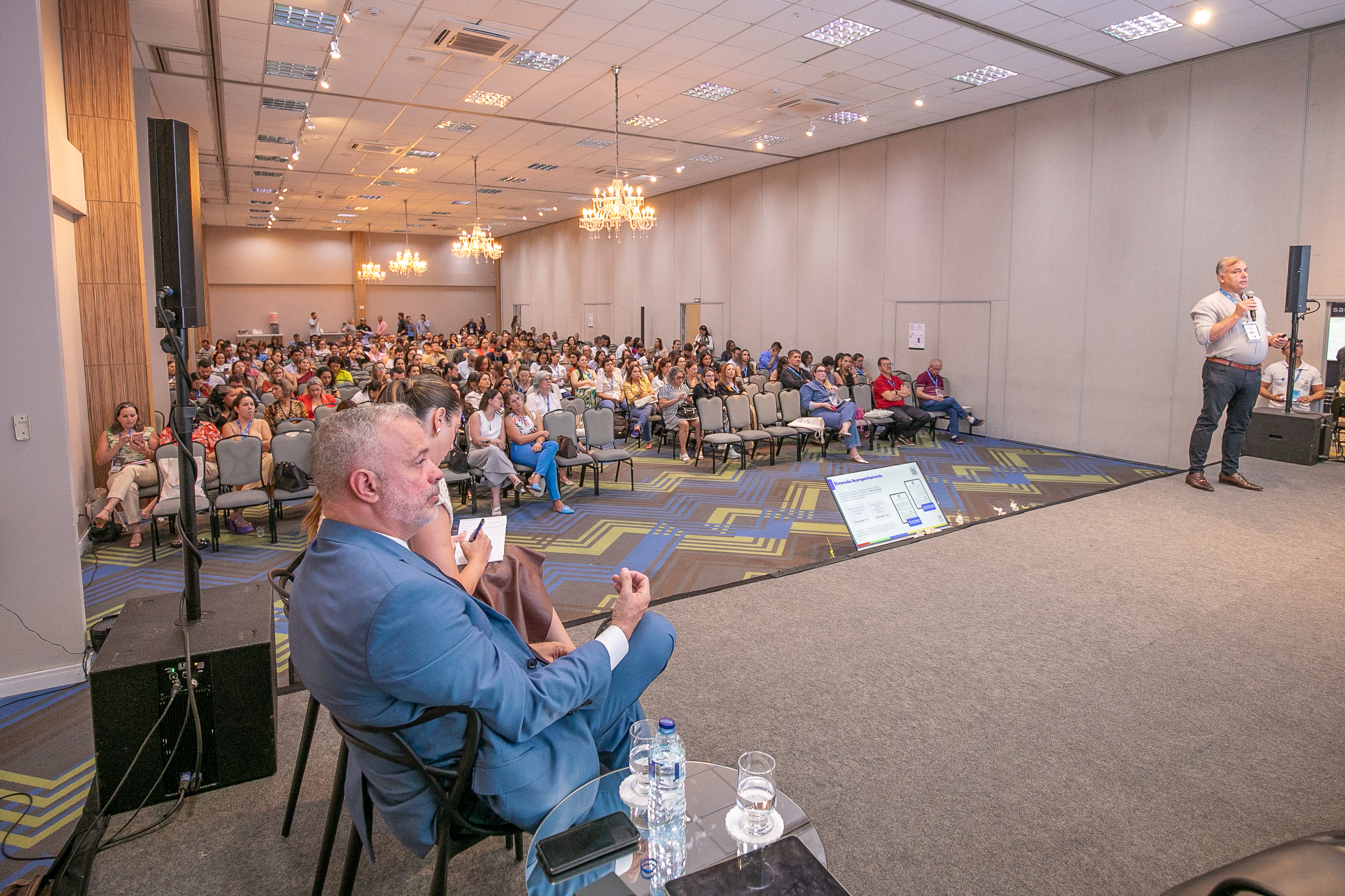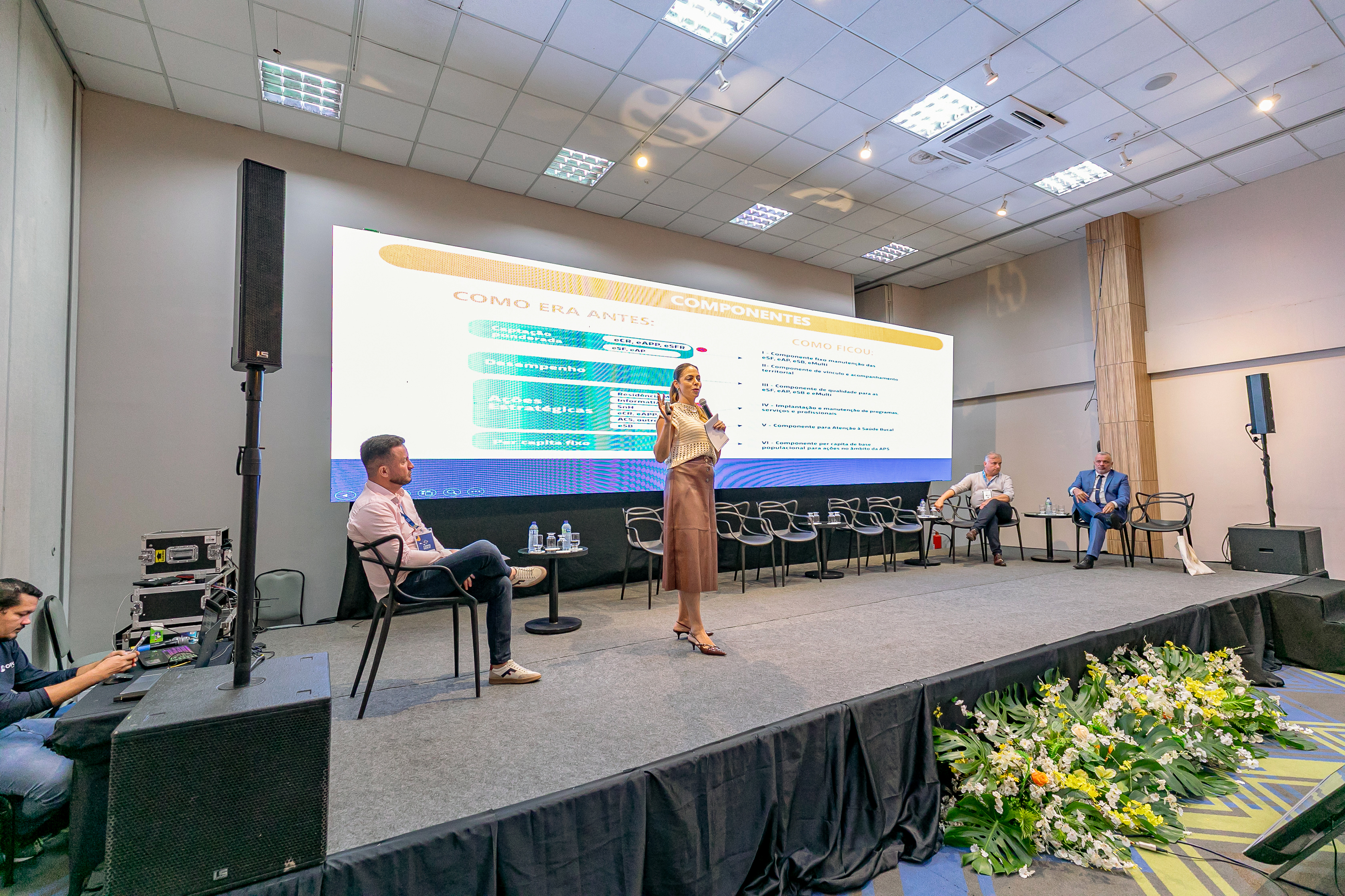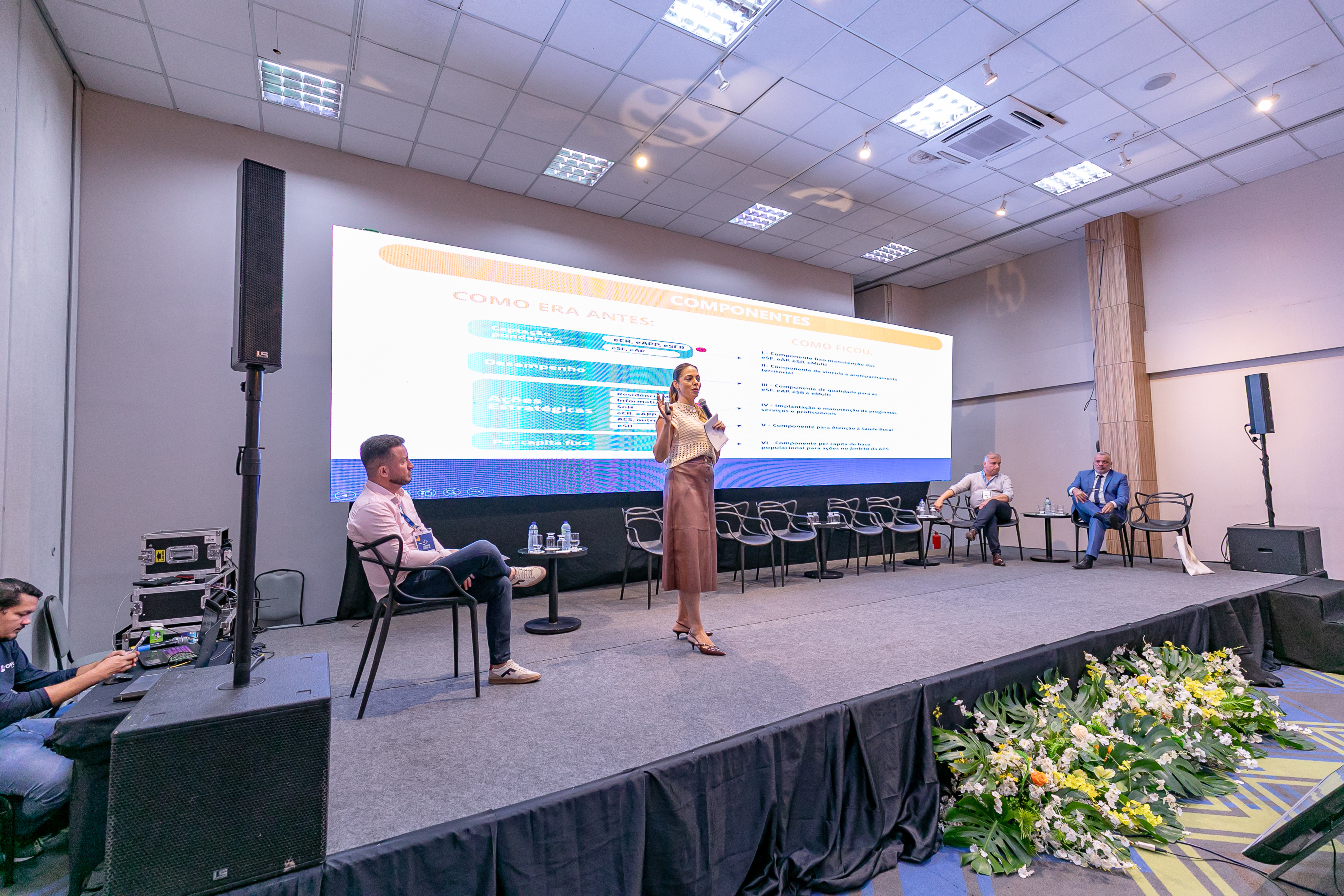 A imagem mostra palestrantes durante a apresentação do evento que acontece no auditório de um hotel. Uma mulher está centralizada no palco, discursando, enquanto outras pessoas sentadas a observam. Ao fundo, há um telão que transmite os slides da apresentação.