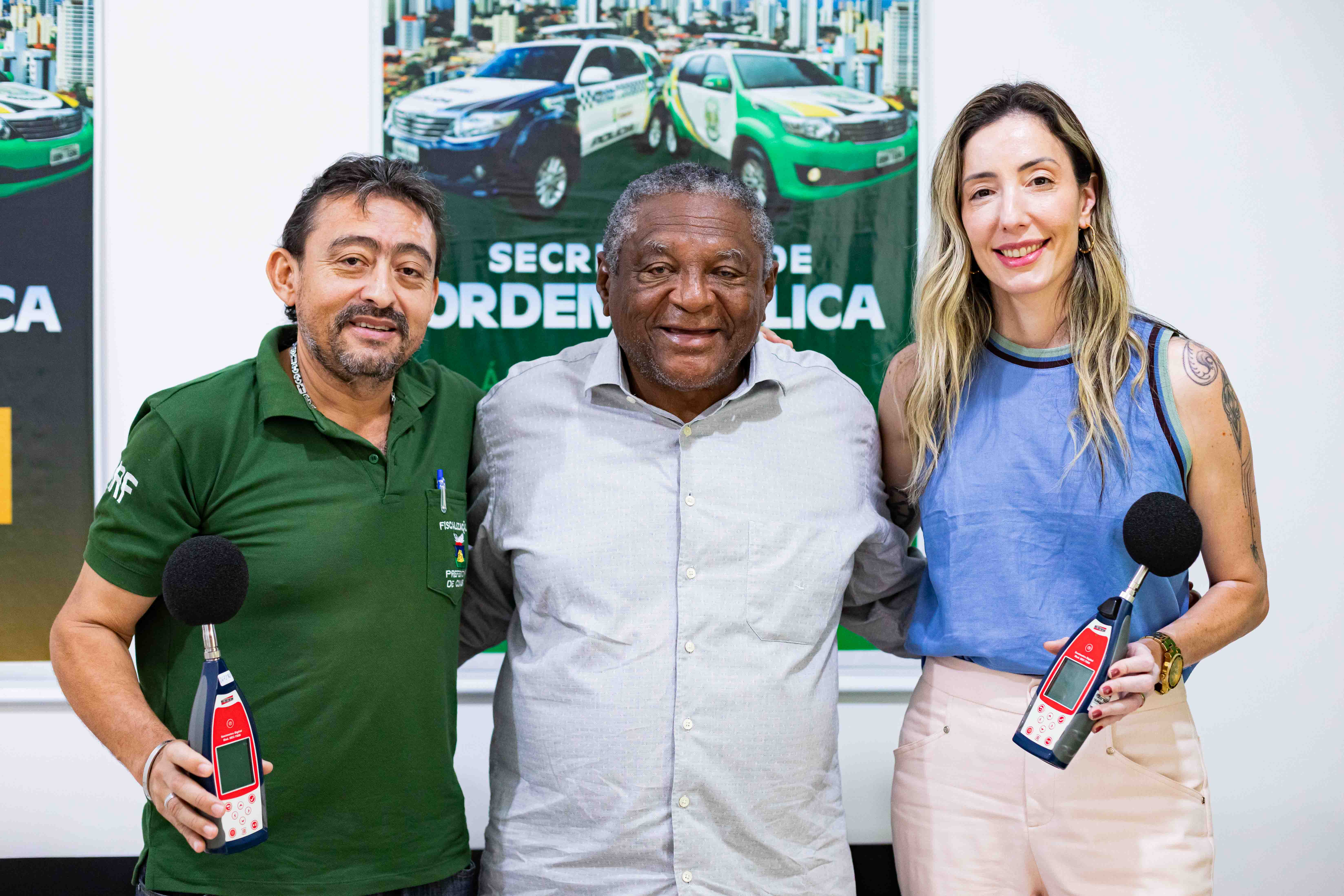 A imagem mostra a secretária municipal de Ordem Pública, Juliana Palhares reunida com o ex-vereador de Cuiabá, Rinaldo Ribeiro de Almeida e o coordenador de fiscalização da poluição sonora, Gilberto Pereira de Almeida. Juliana e Gilberto seguram um sonômetro, medidor de ruído, em homenagem ao ex-vereador, que é autor da Lei do Silêncio em Cuiabá.