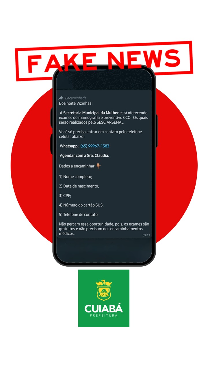 É falsa a mensagem que circula por meio de grupos de aplicativos celulares e por redes sociais de que a Secretaria Municipal da Mulher vem ofertando exames de mamografia e preventivo (CCO) por meio de questionário. O texto da mensagem fake destaca o nome e o número celular de uma servidora da pasta que estaria fazendo esta marcação. Na verdade, a campanha "Outubro Rosa – seja sua própria heroína”, uma parceria entre a Prefeitura de Cuiabá, através das Secretarias Municipais de Saúde e da Mulher e da Empresa Cuiabana de Saúde Pública e Núcleo de Apoio à Primeira-dama Márcia Pinheiro, e o Serviço Social do Comércio, realizará cerca de mil exames de mamografia e Citopatológico de Papanicolaou (CCO) ao longo do mês de outubro.
