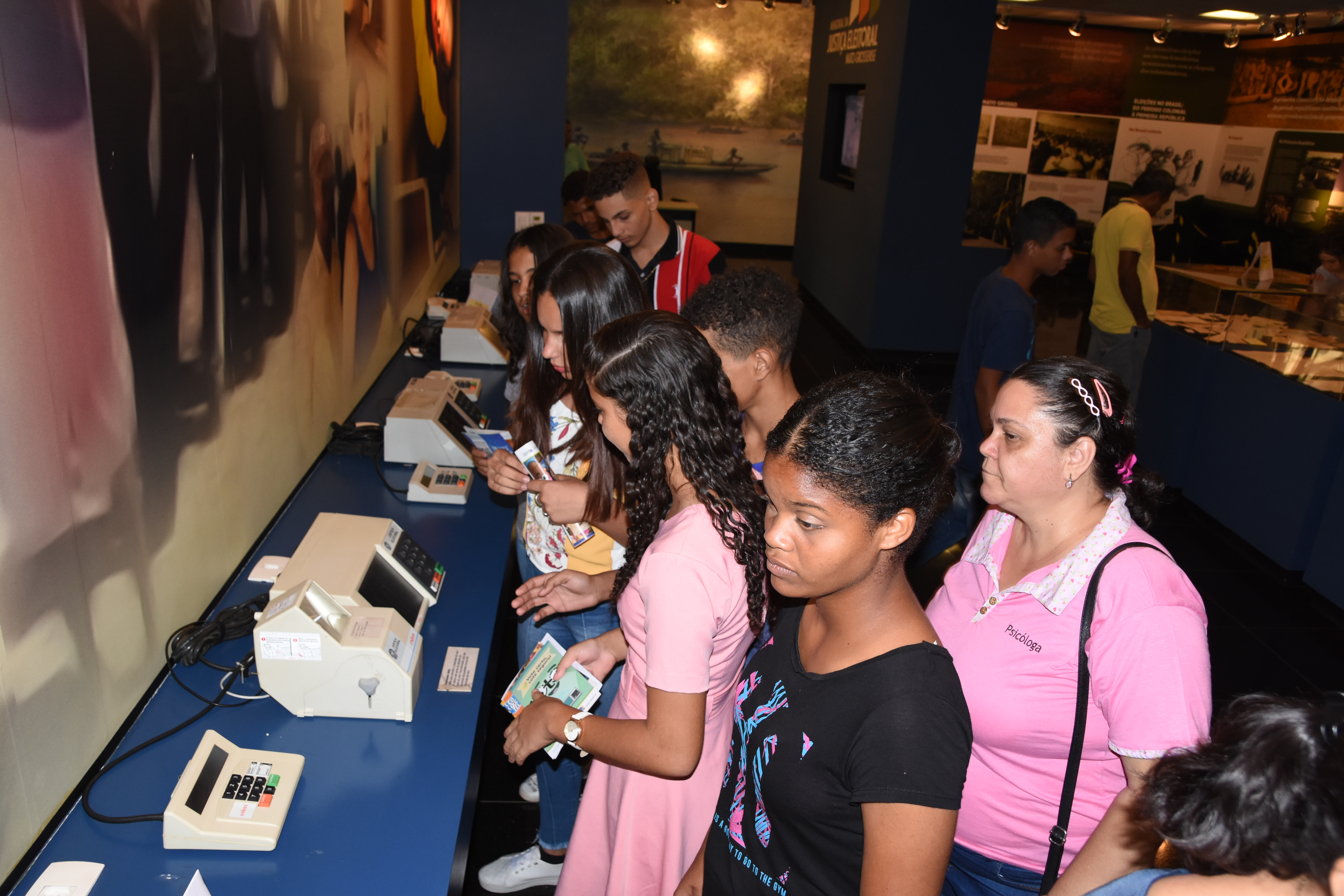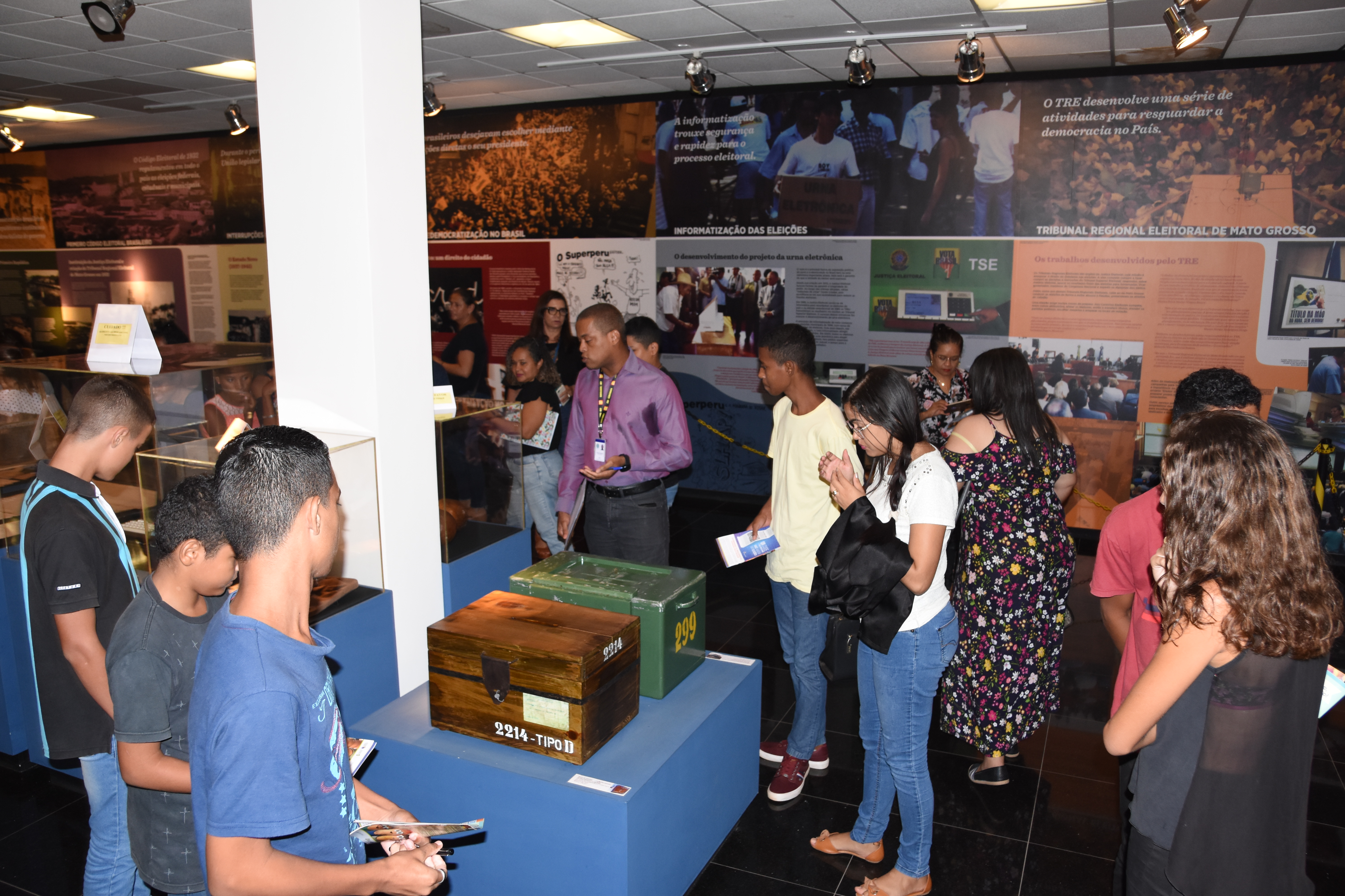 O grupo de alunos após a eleição simulada visitou o Museu existente dentro do TRE que conta um pouco da história da evolução das eleições em Mato Grosso.