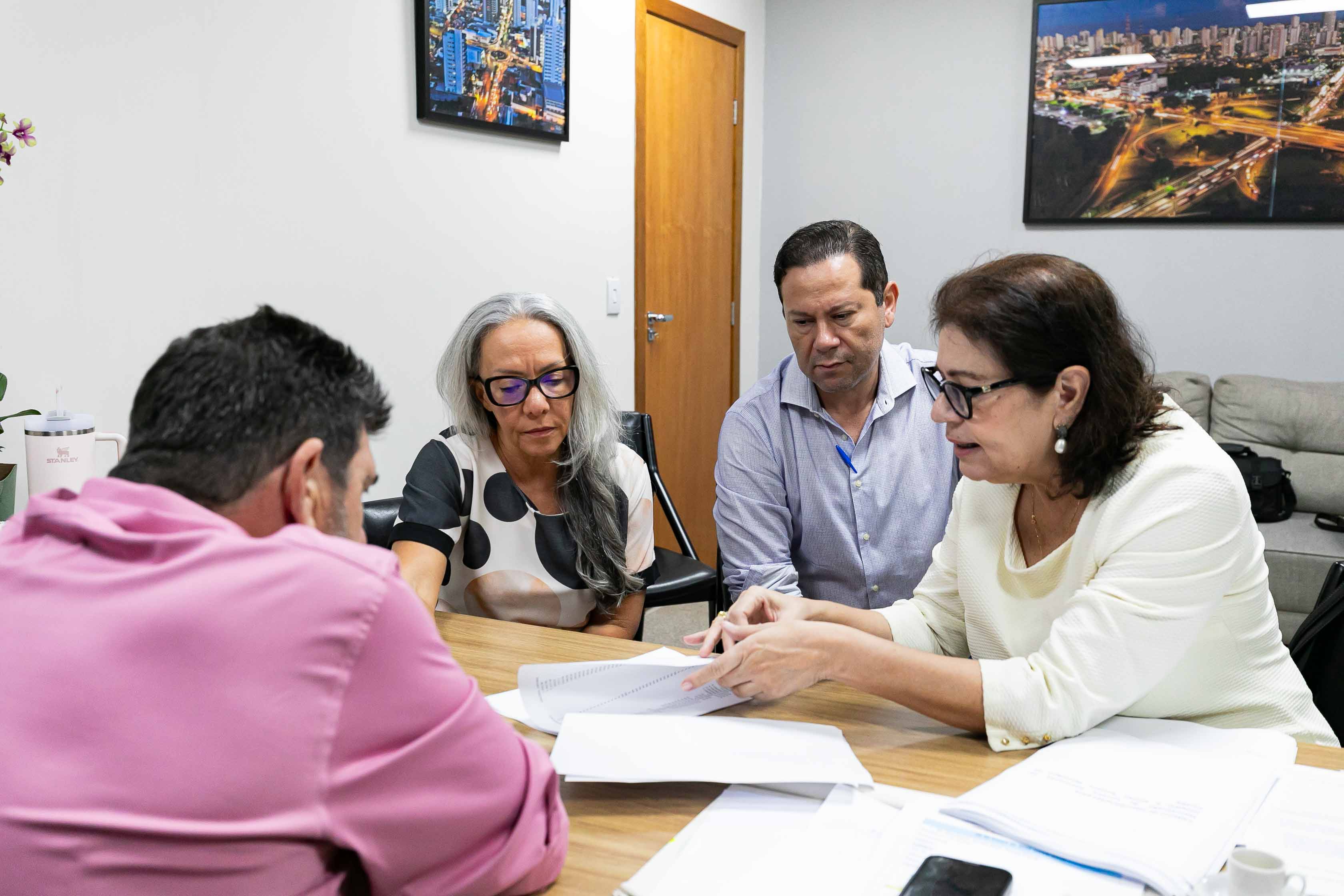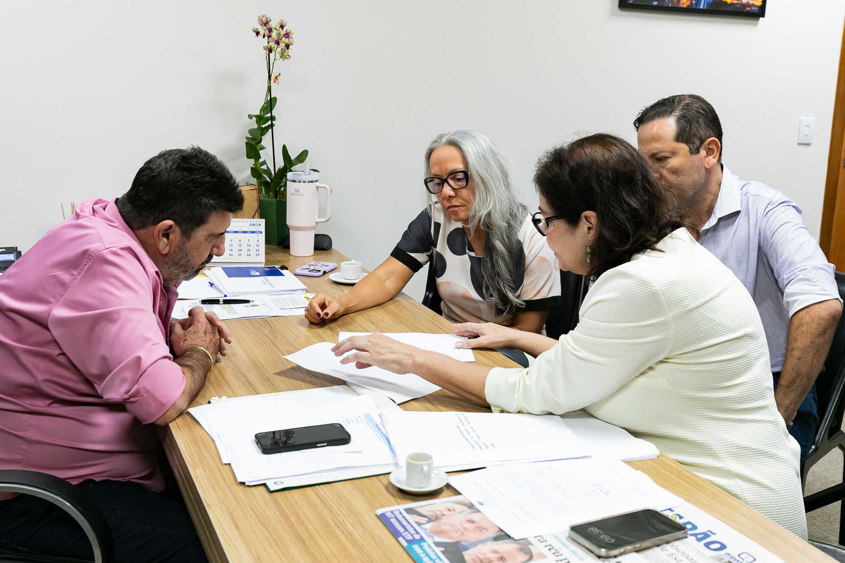 A imagem mostra uma reunião entre quatro pessoas em busca de um bem comum: a reforma de um andar do antigo Pronto-Socorro de Cuiabá. Os envolvidos estão analisando alguns documentos que estão sendo apresentados ao deputado Dr. João José em seu gabinete.