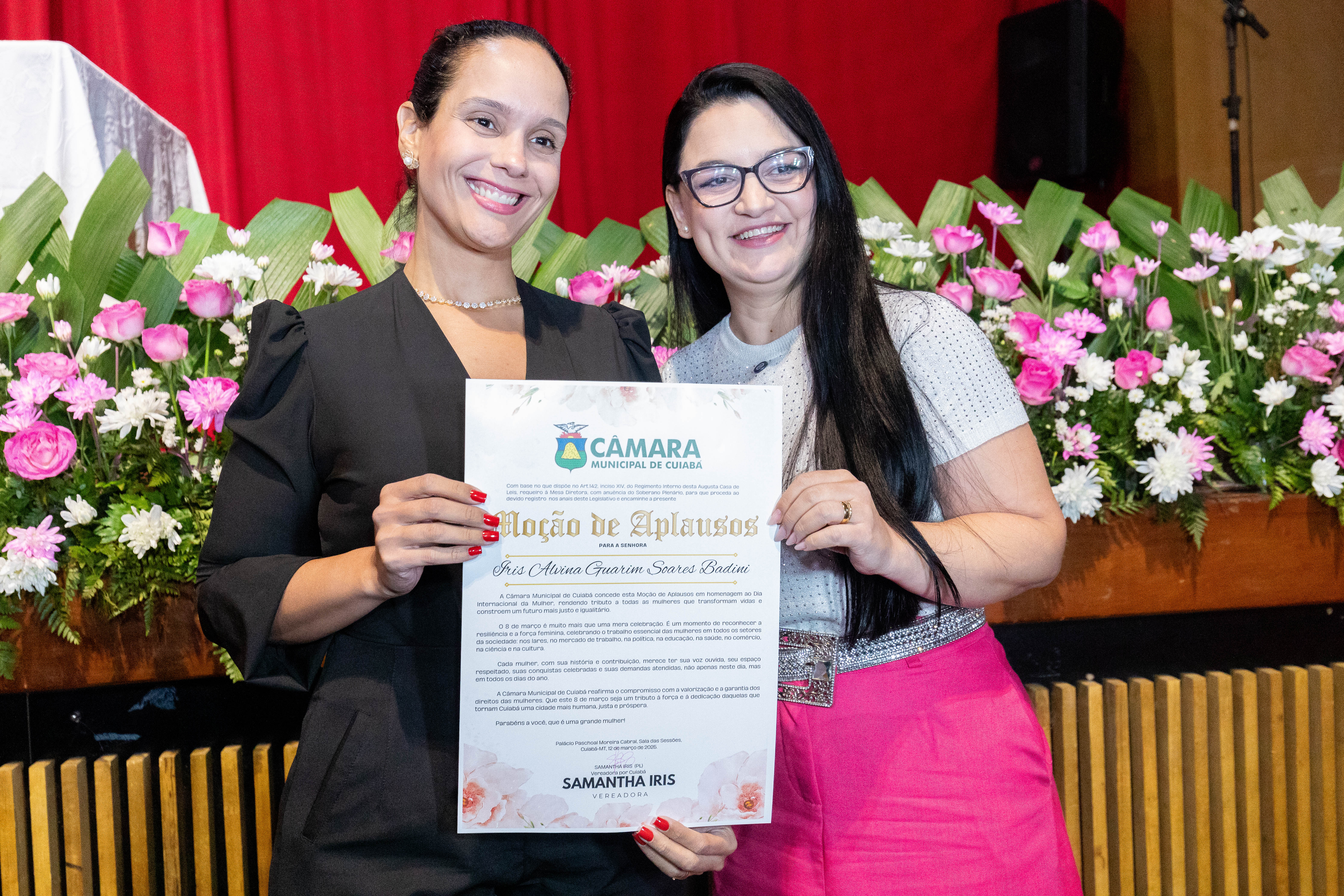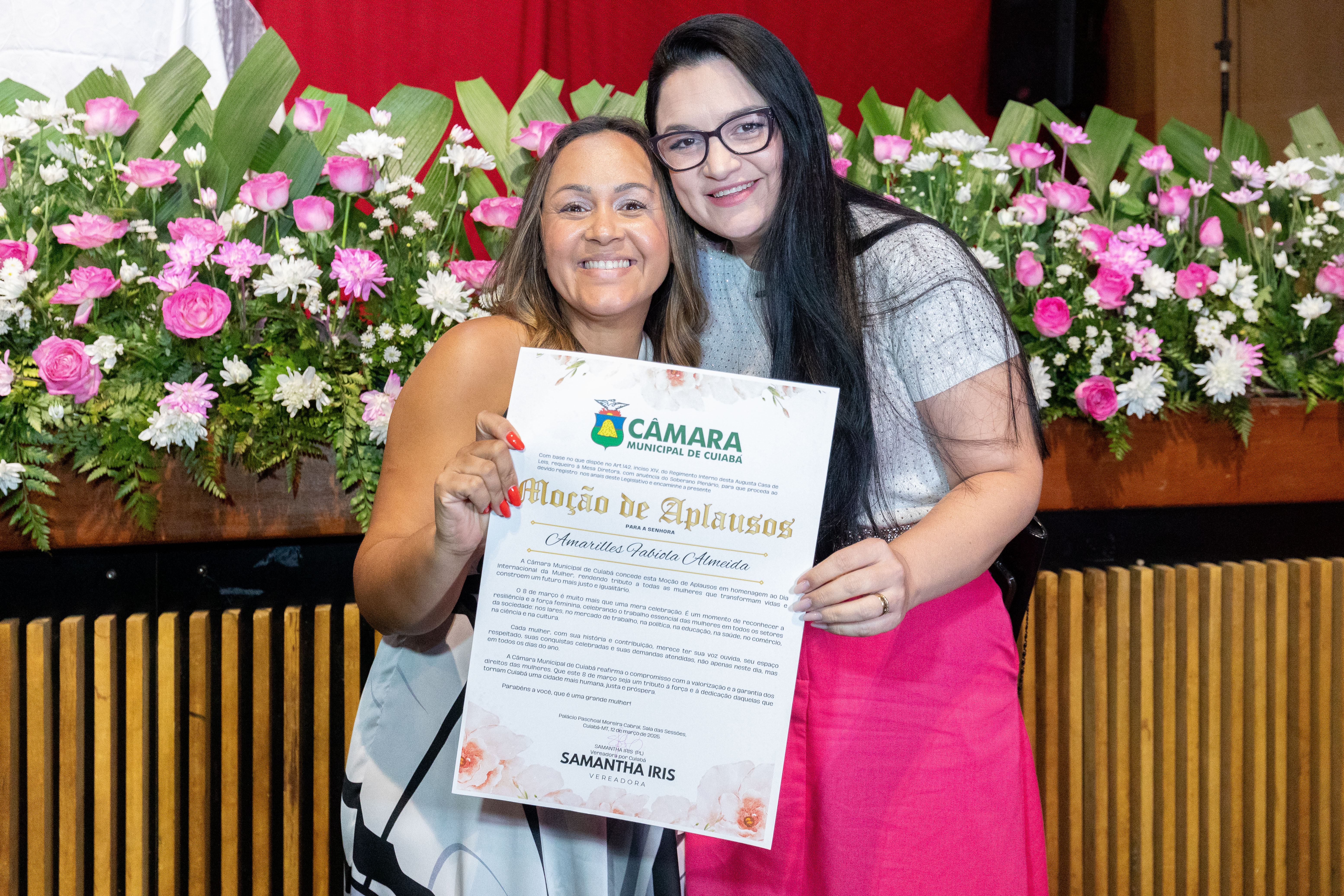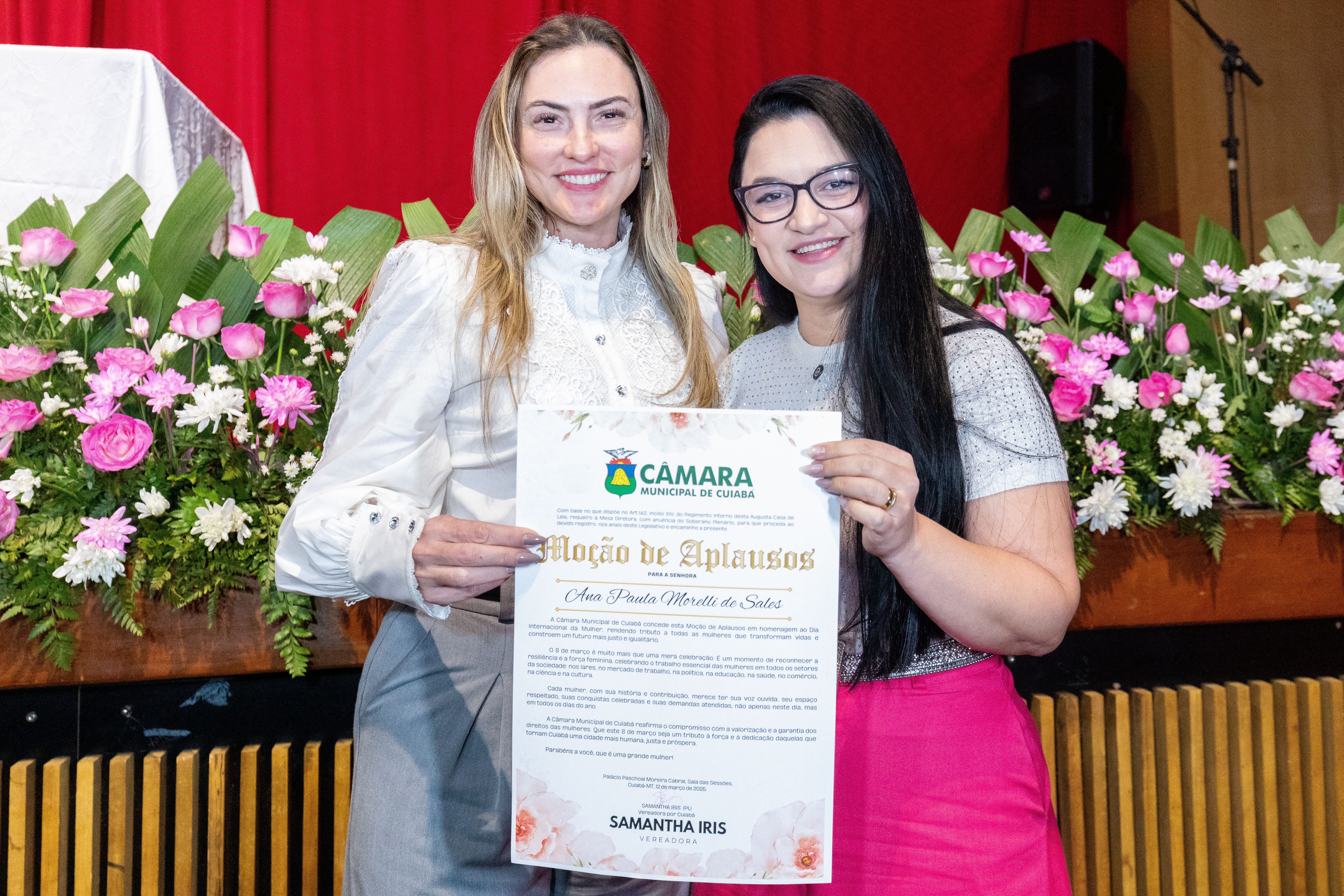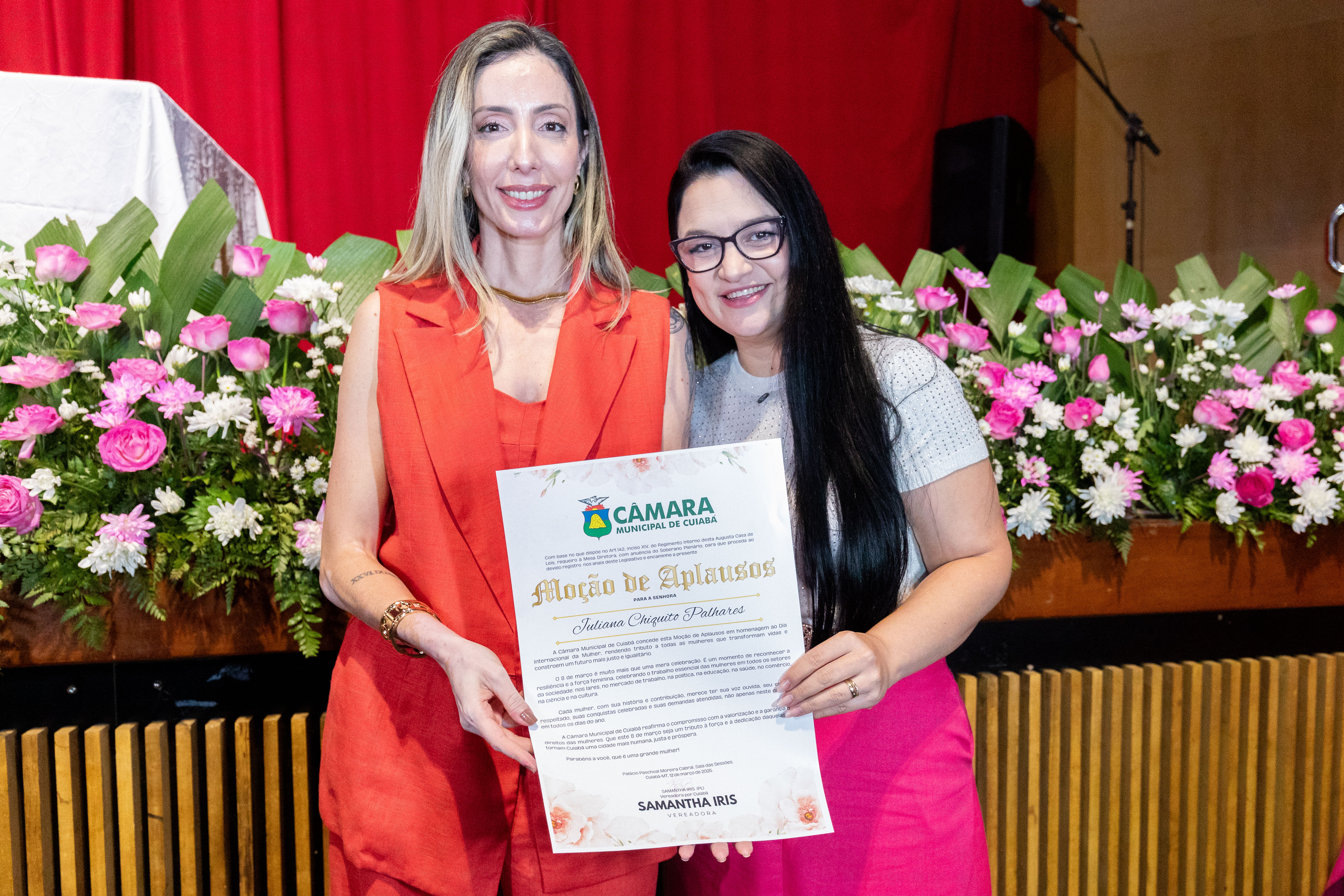 A vereadora Baixinha e a vereadora e primeira-dama, Samantha Iris, foram responsáveis pela entrega das homenagens ao Executivo e escolheram ressaltar o trabalho feminino na Prefeitura de Cuiabá.