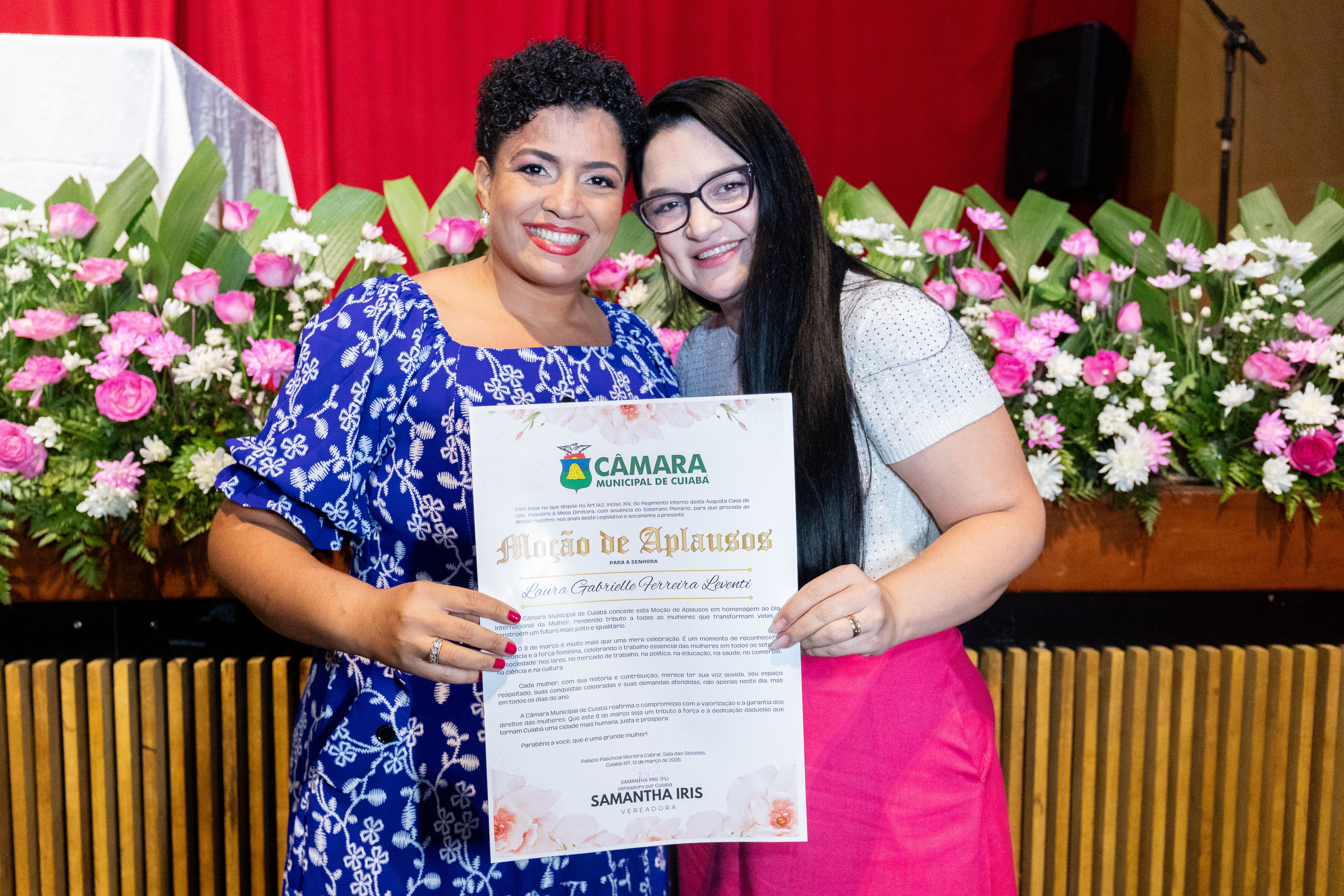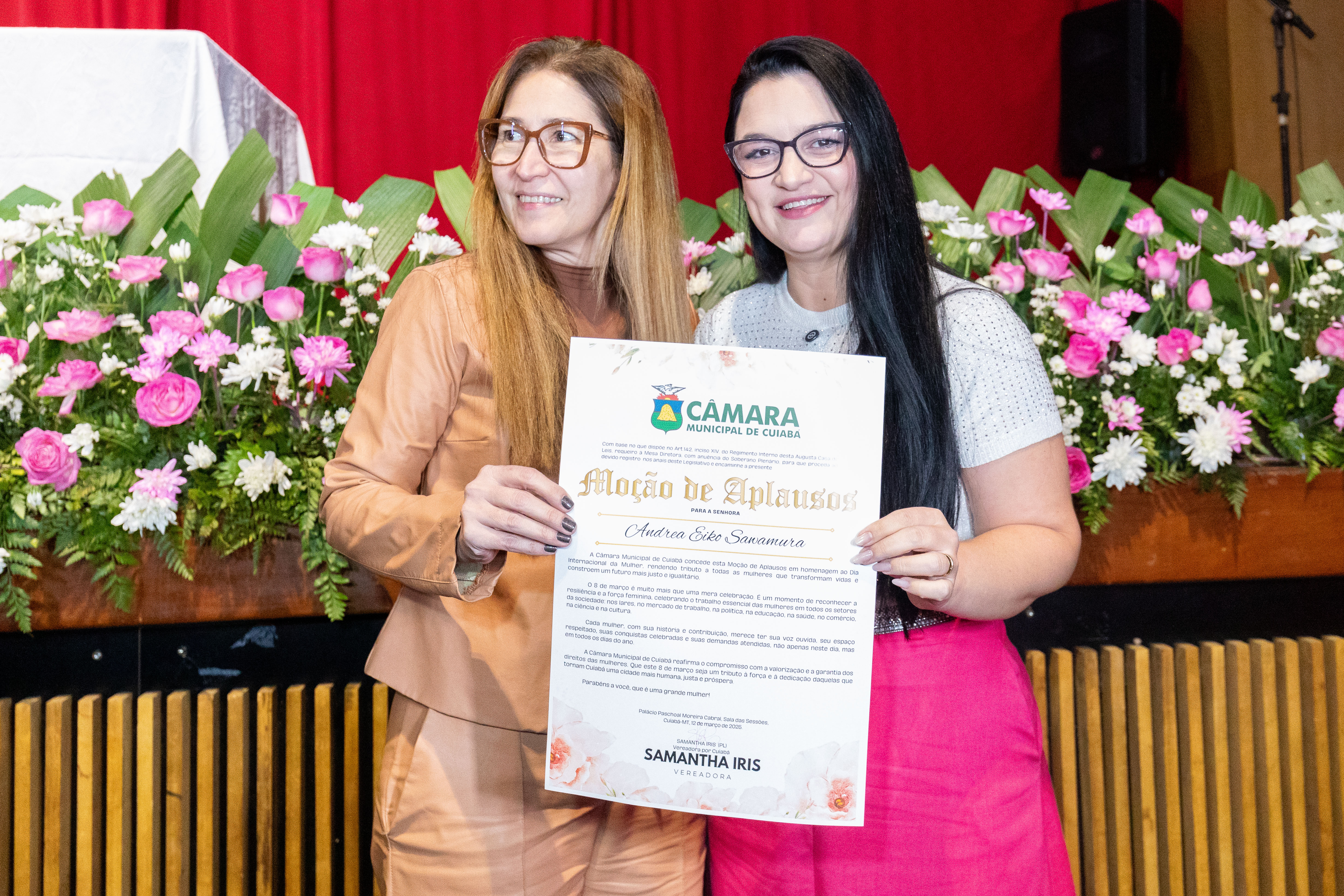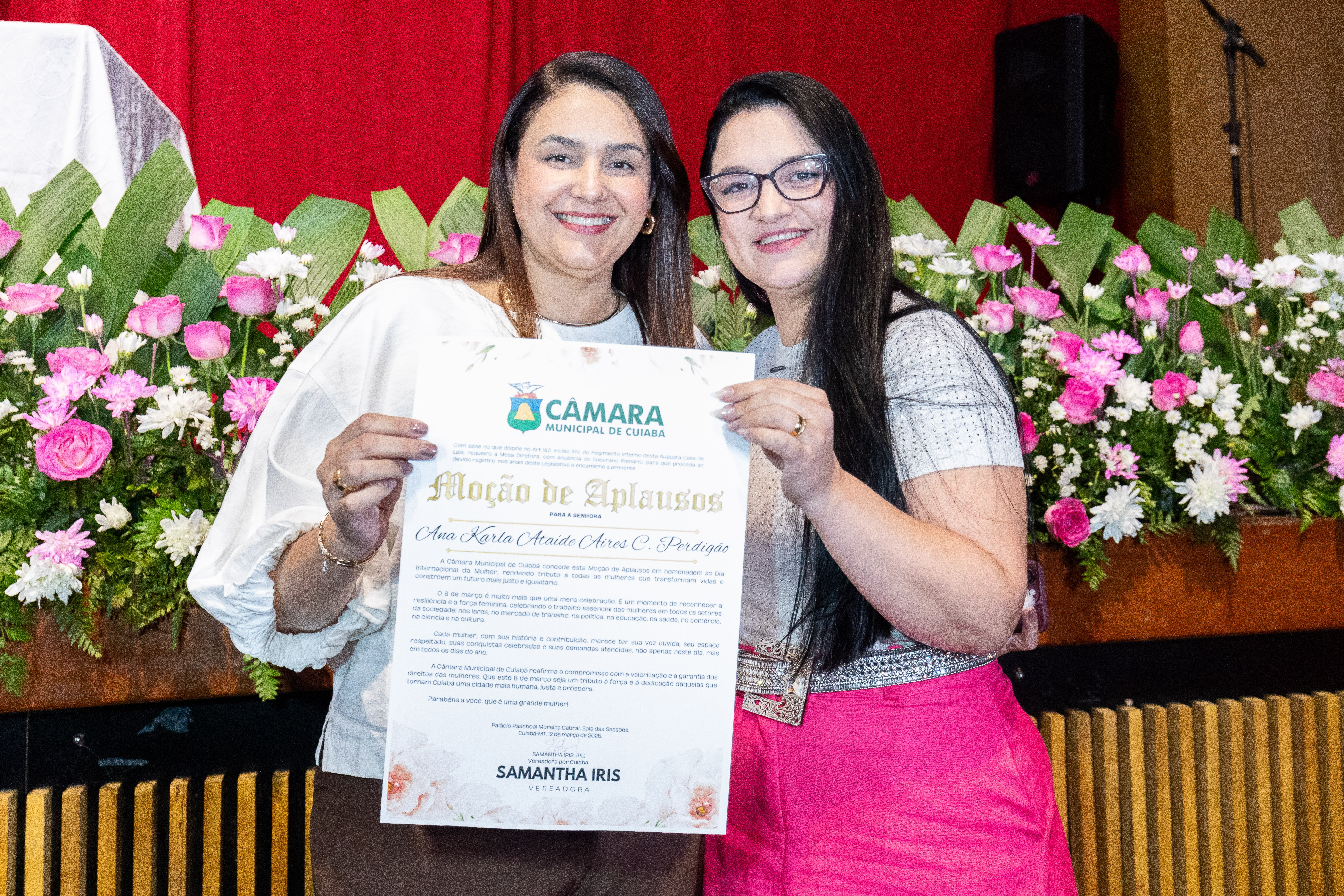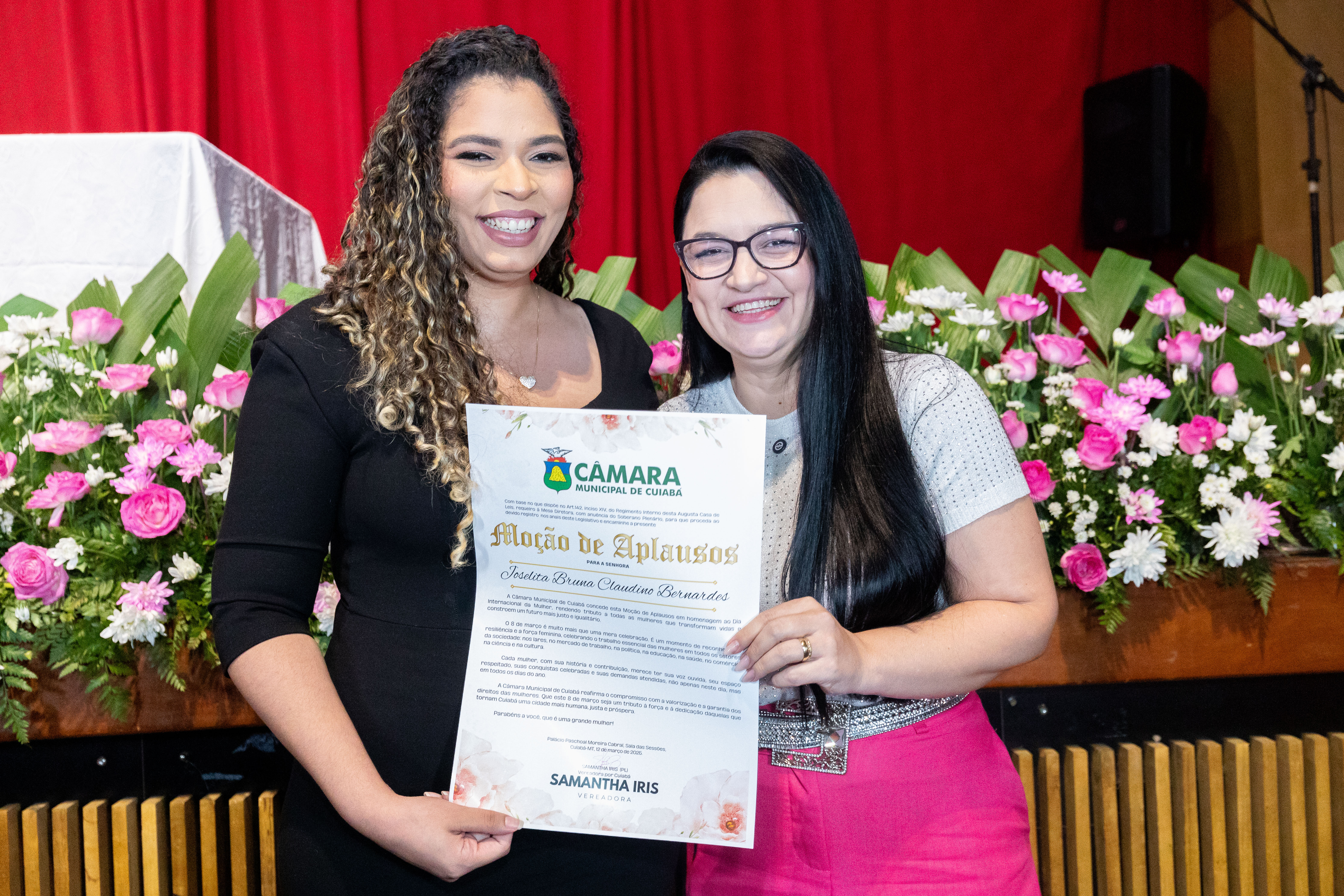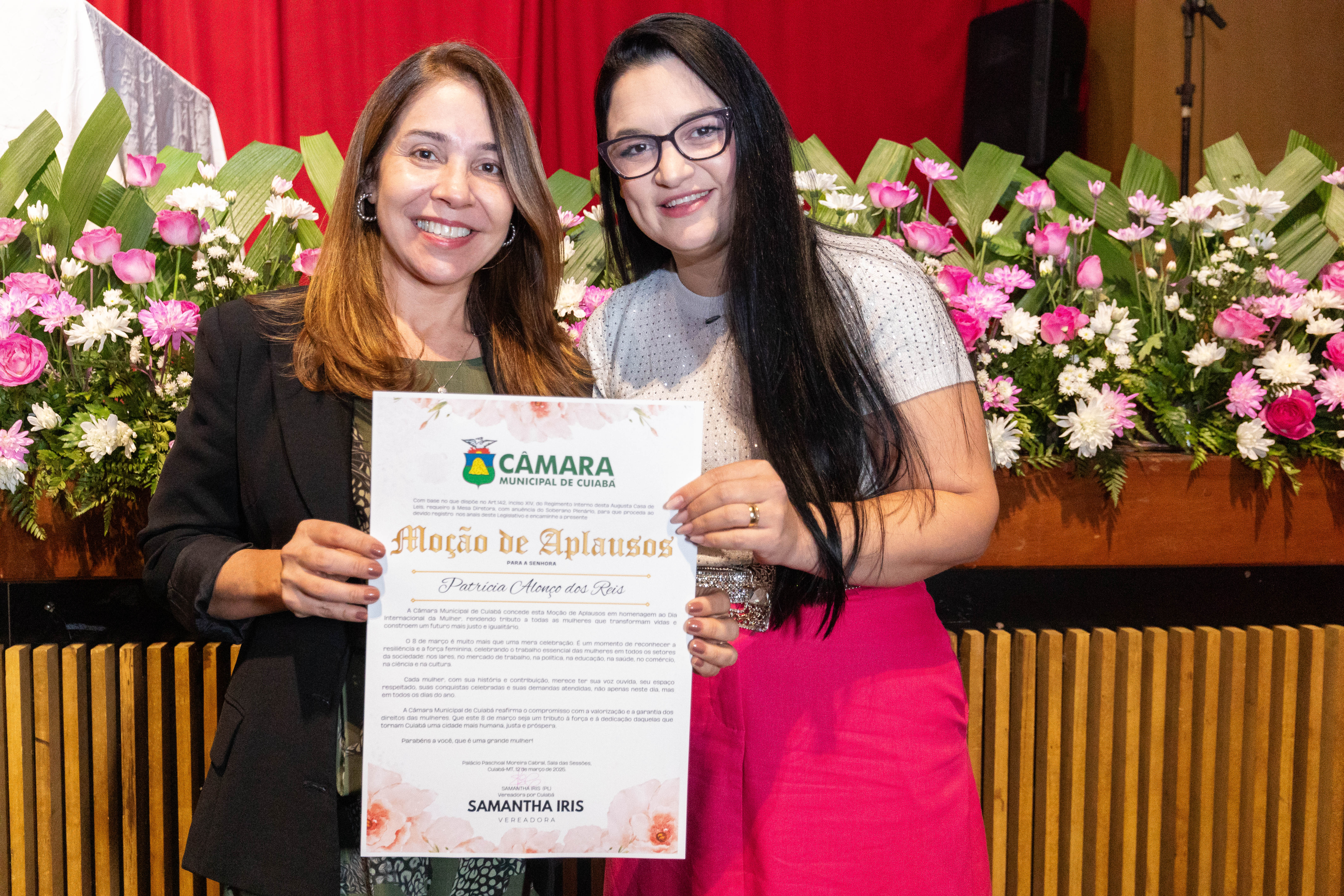 A vereadora Baixinha e a vereadora e primeira-dama, Samantha Iris, foram responsáveis pela entrega das homenagens ao Executivo e escolheram ressaltar o trabalho feminino na Prefeitura de Cuiabá.