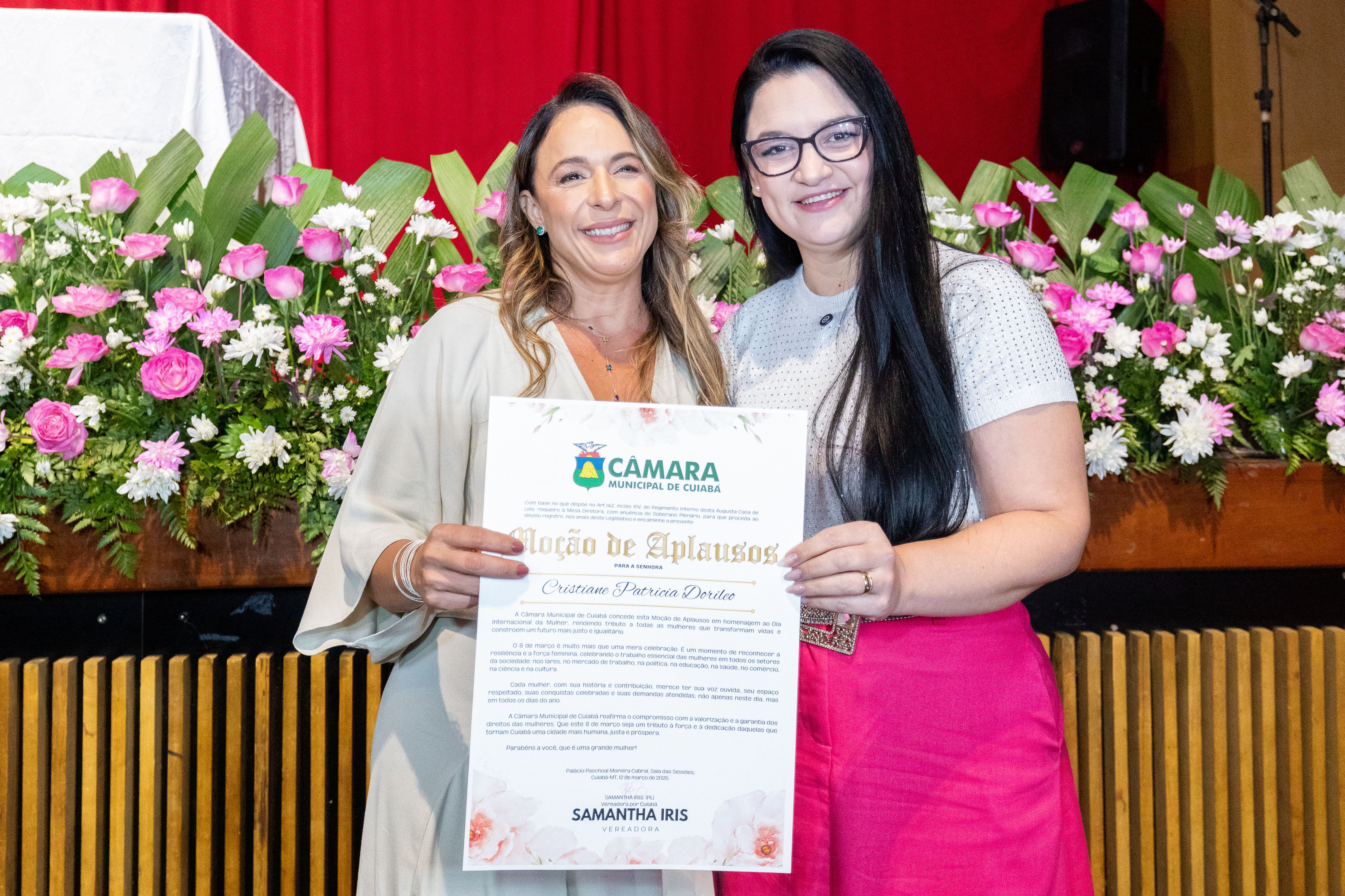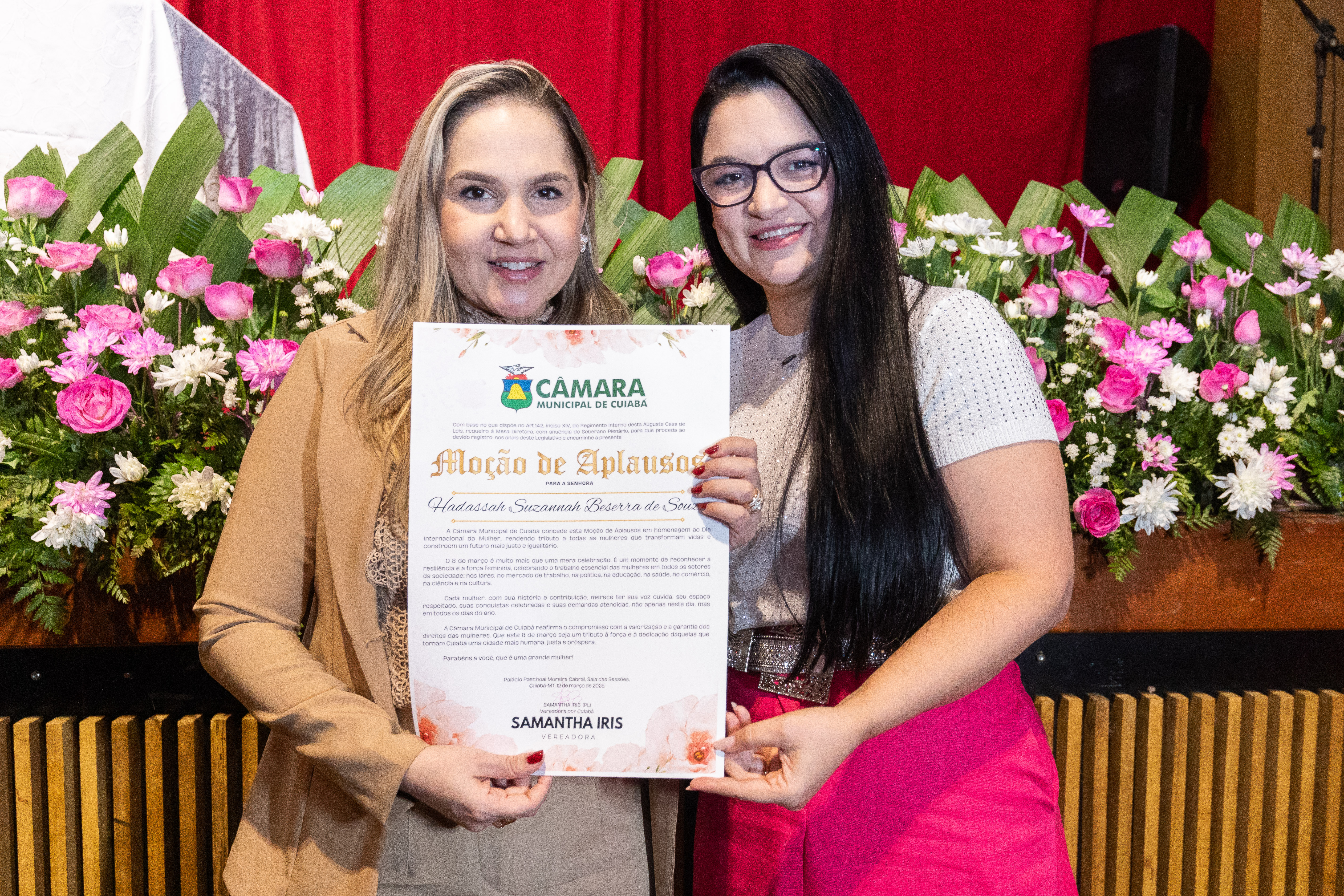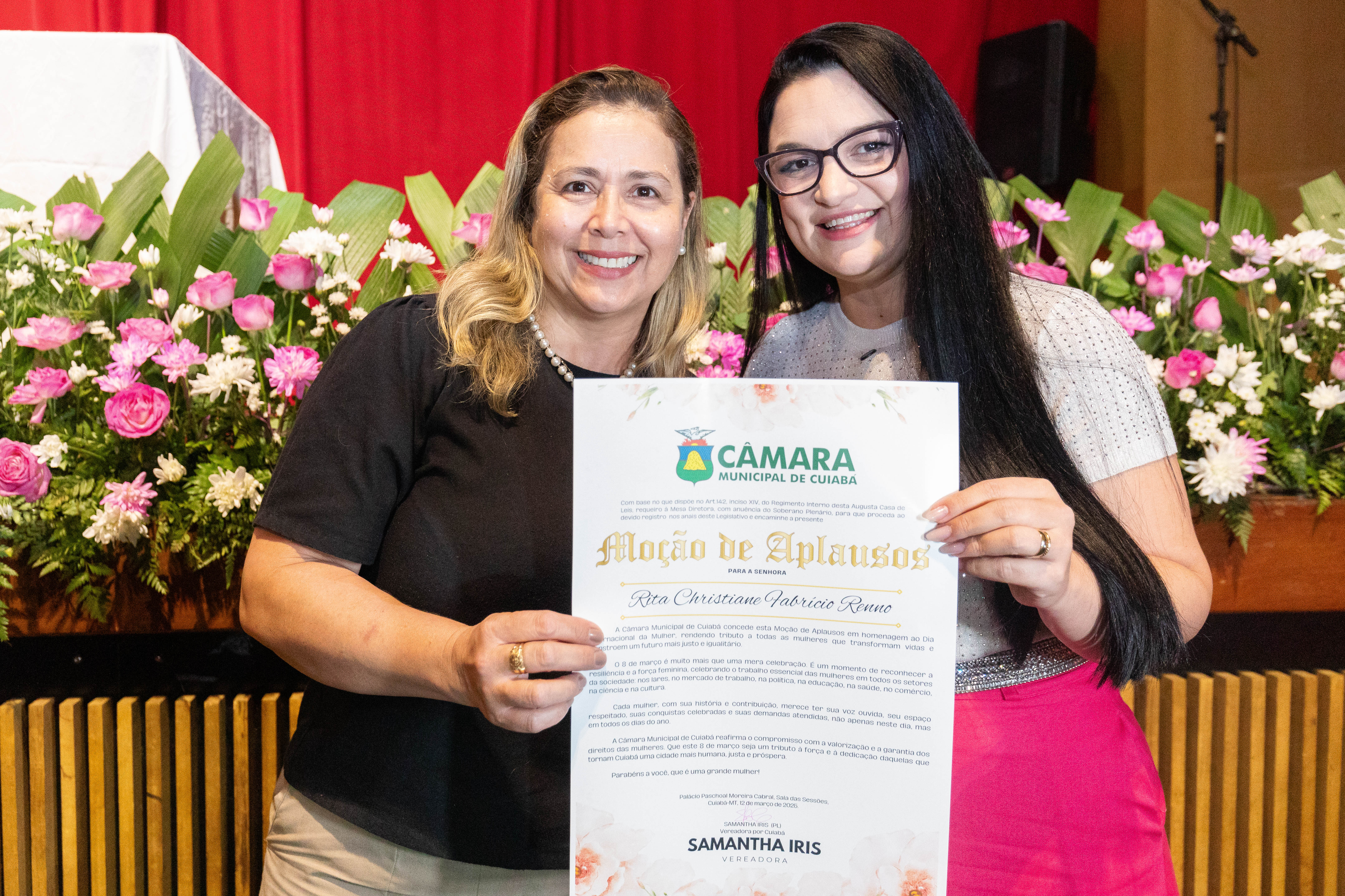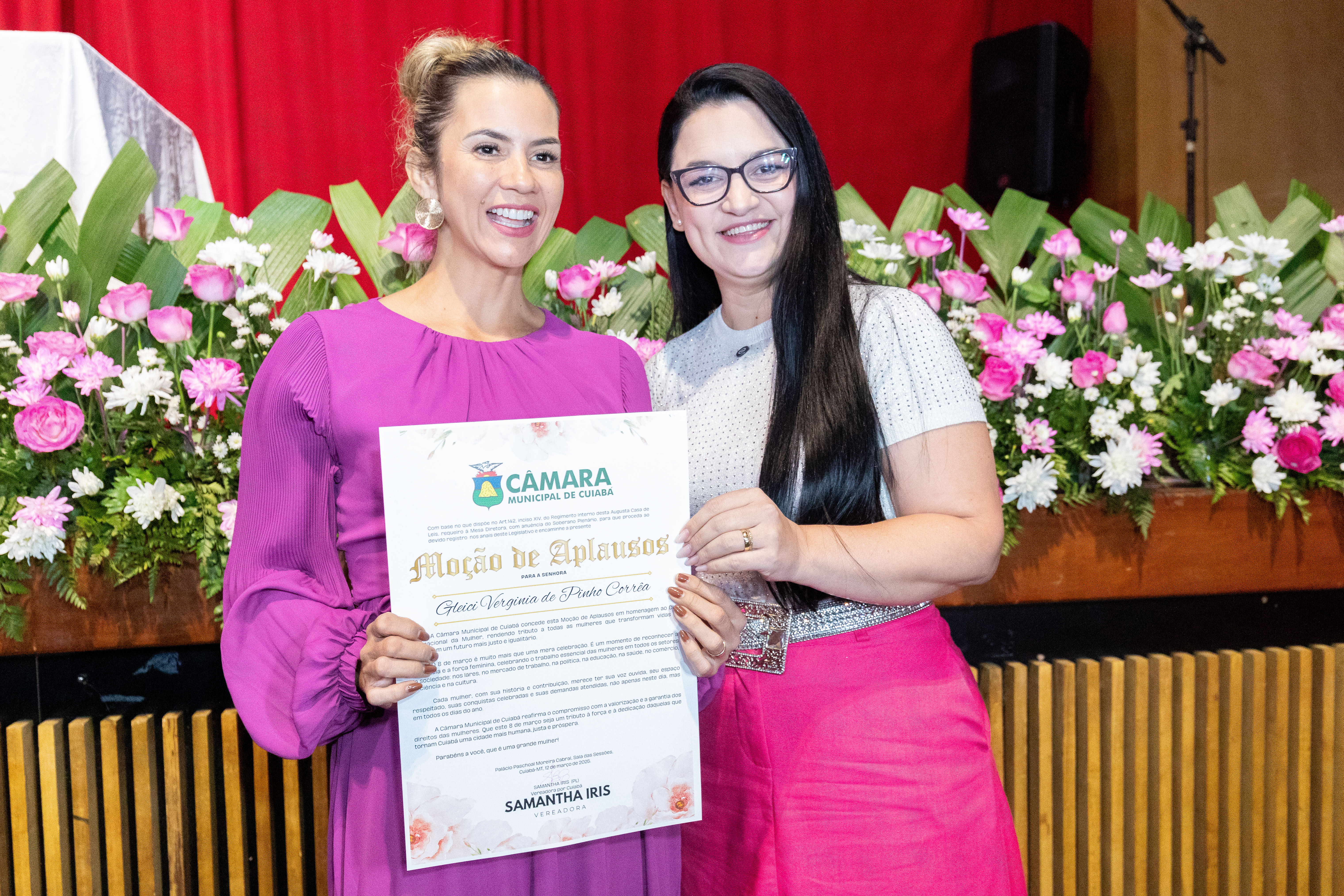 A vereadora Baixinha e a vereadora e primeira-dama, Samantha Iris, foram responsáveis pela entrega das homenagens ao Executivo e escolheram ressaltar o trabalho feminino na Prefeitura de Cuiabá.