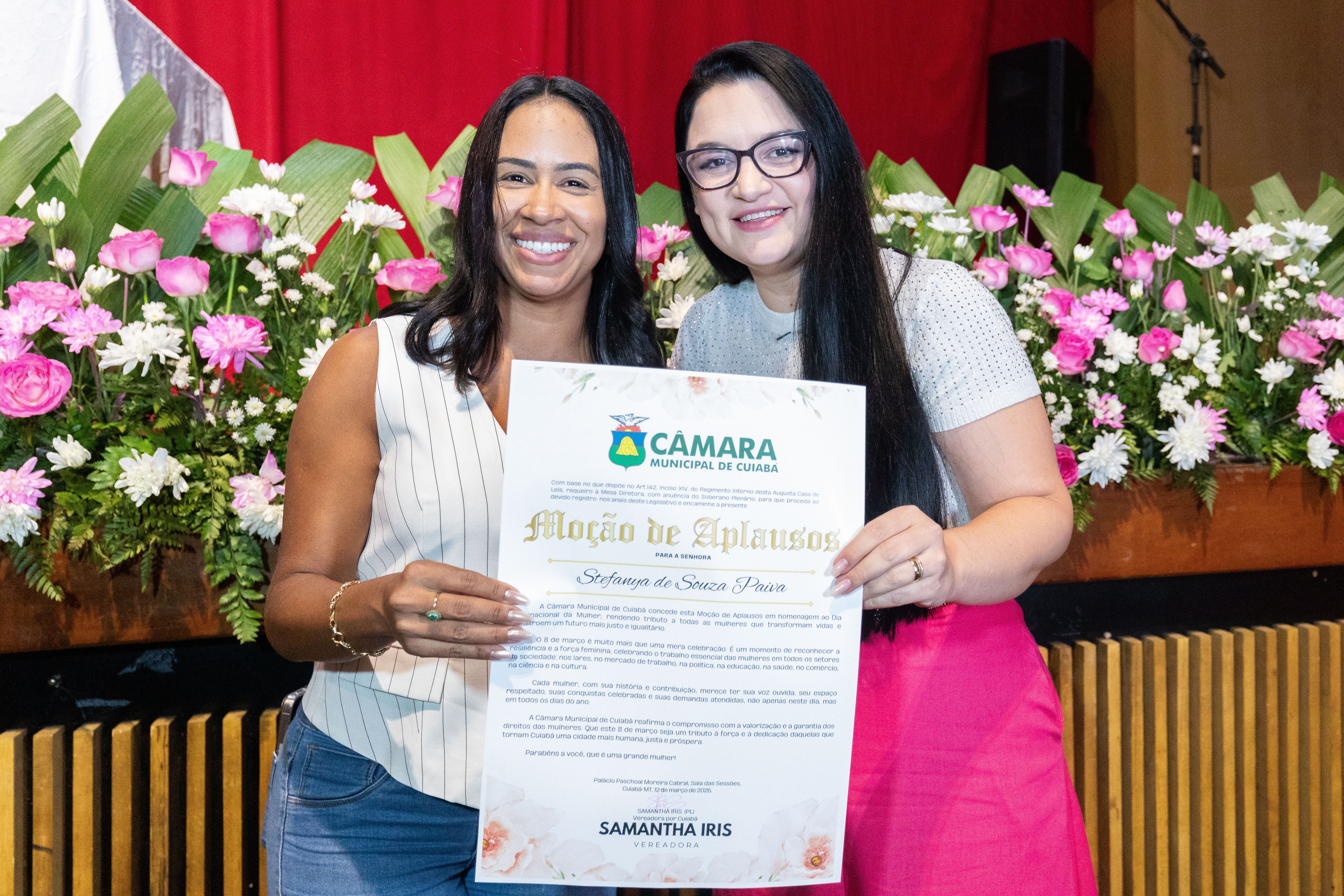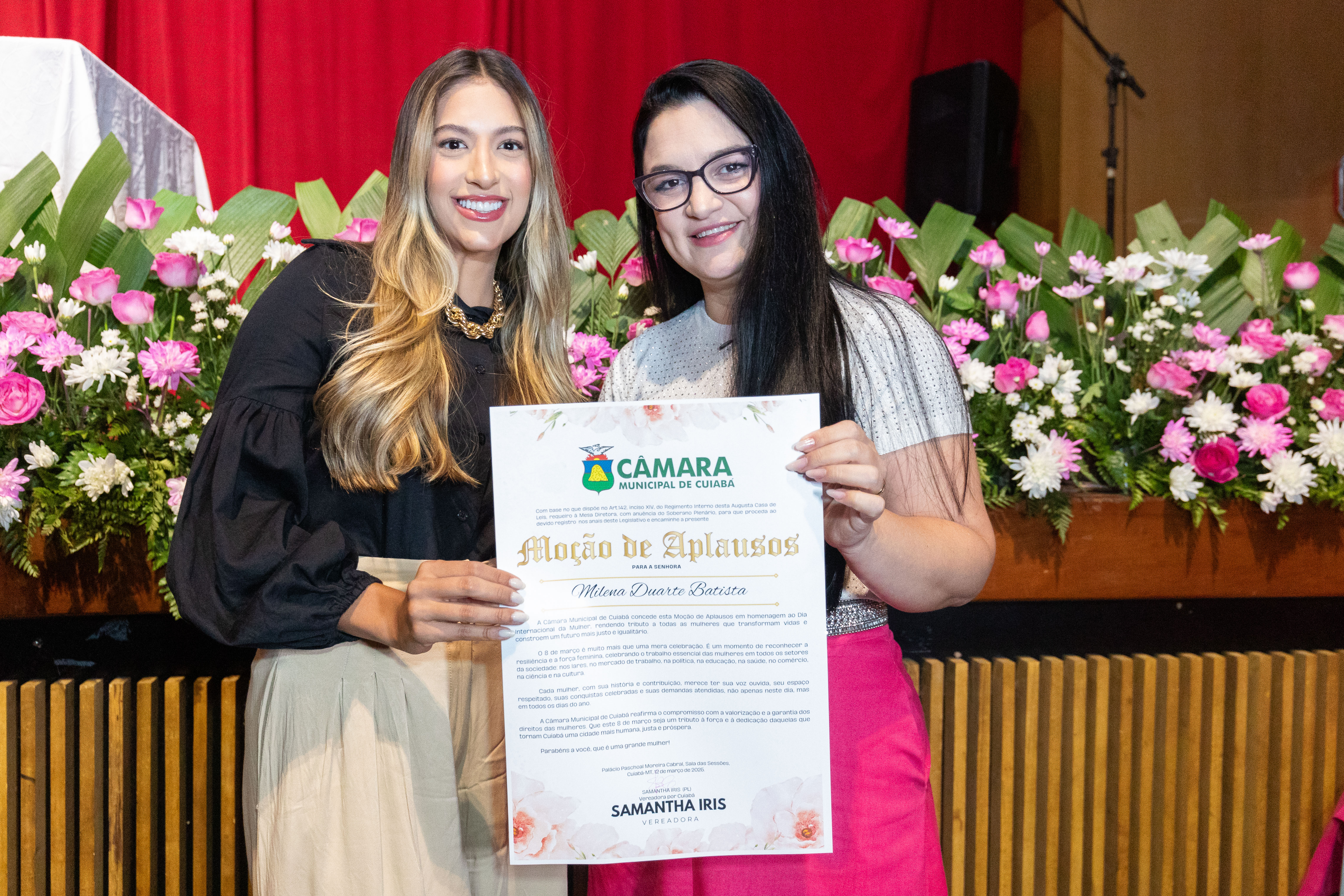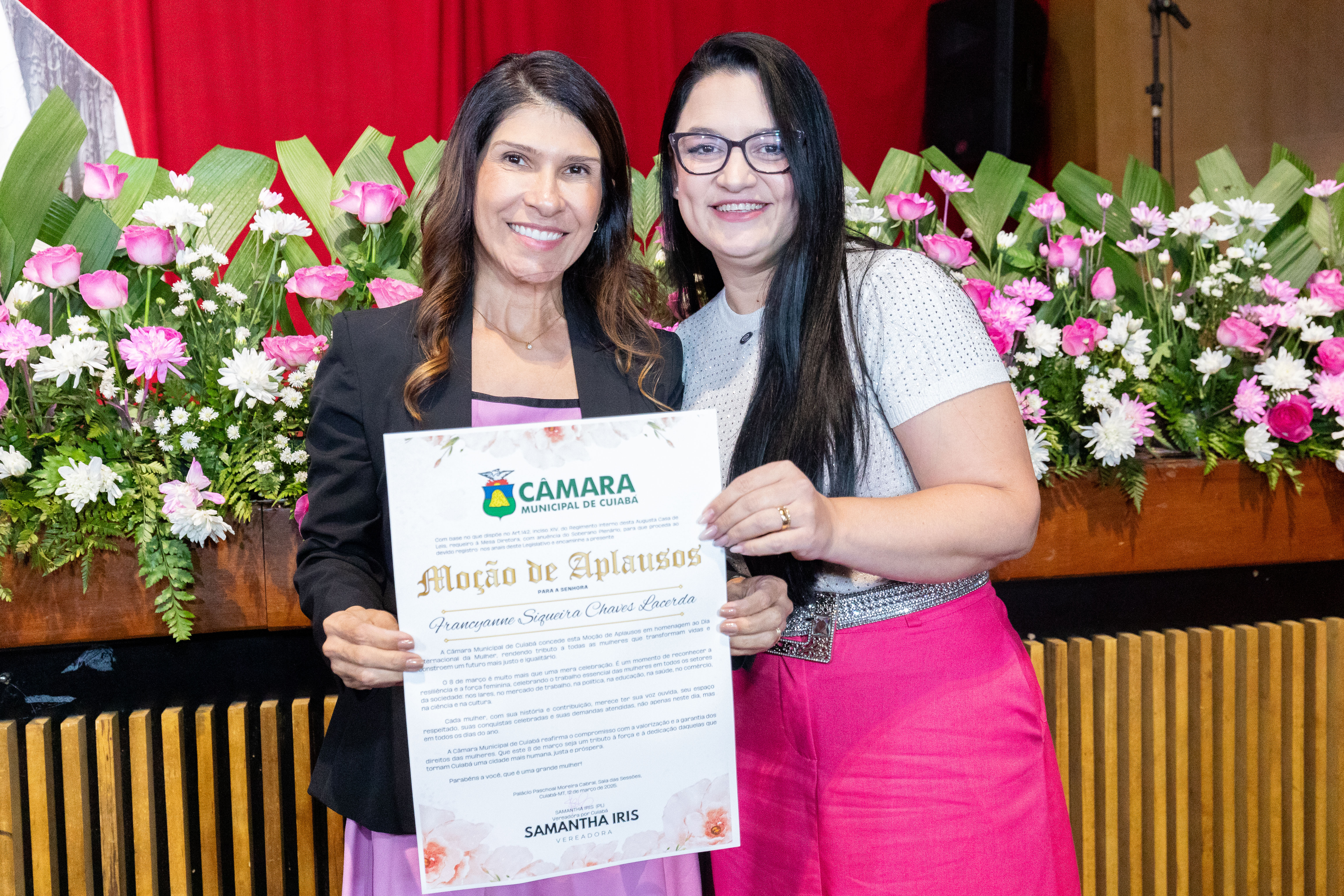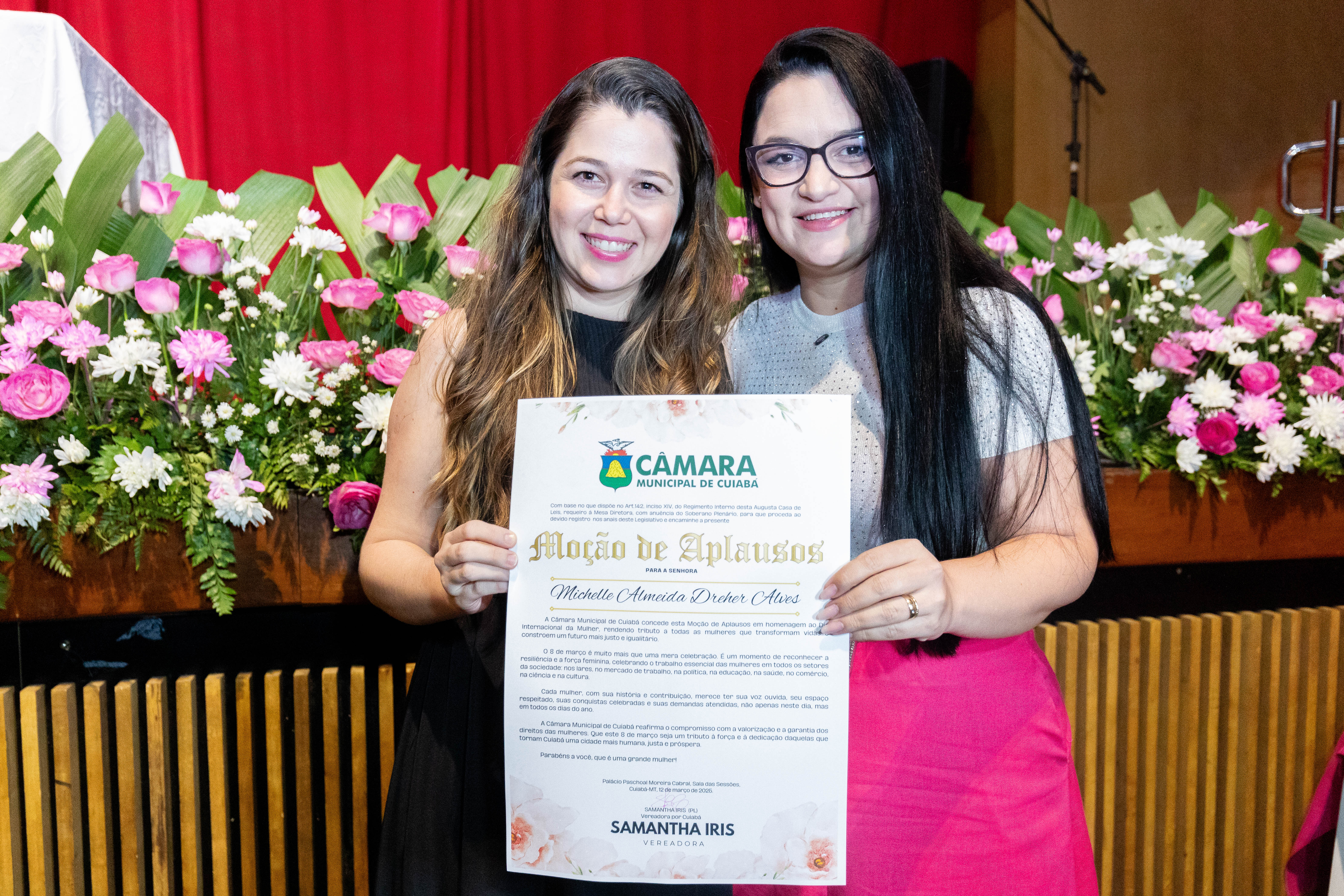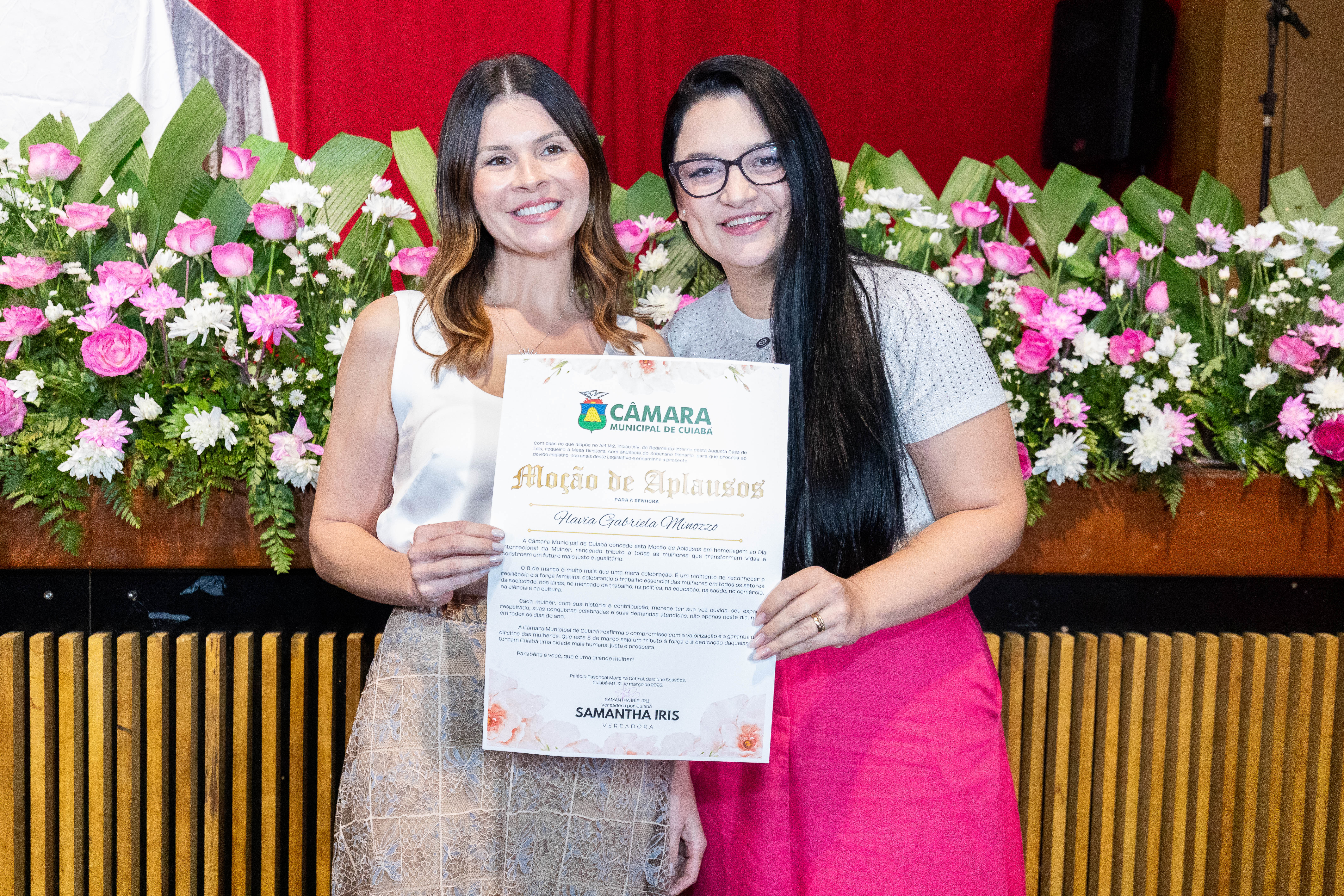 A vereadora Baixinha e a vereadora e primeira-dama, Samantha Iris, foram responsáveis pela entrega das homenagens ao Executivo e escolheram ressaltar o trabalho feminino na Prefeitura de Cuiabá.
