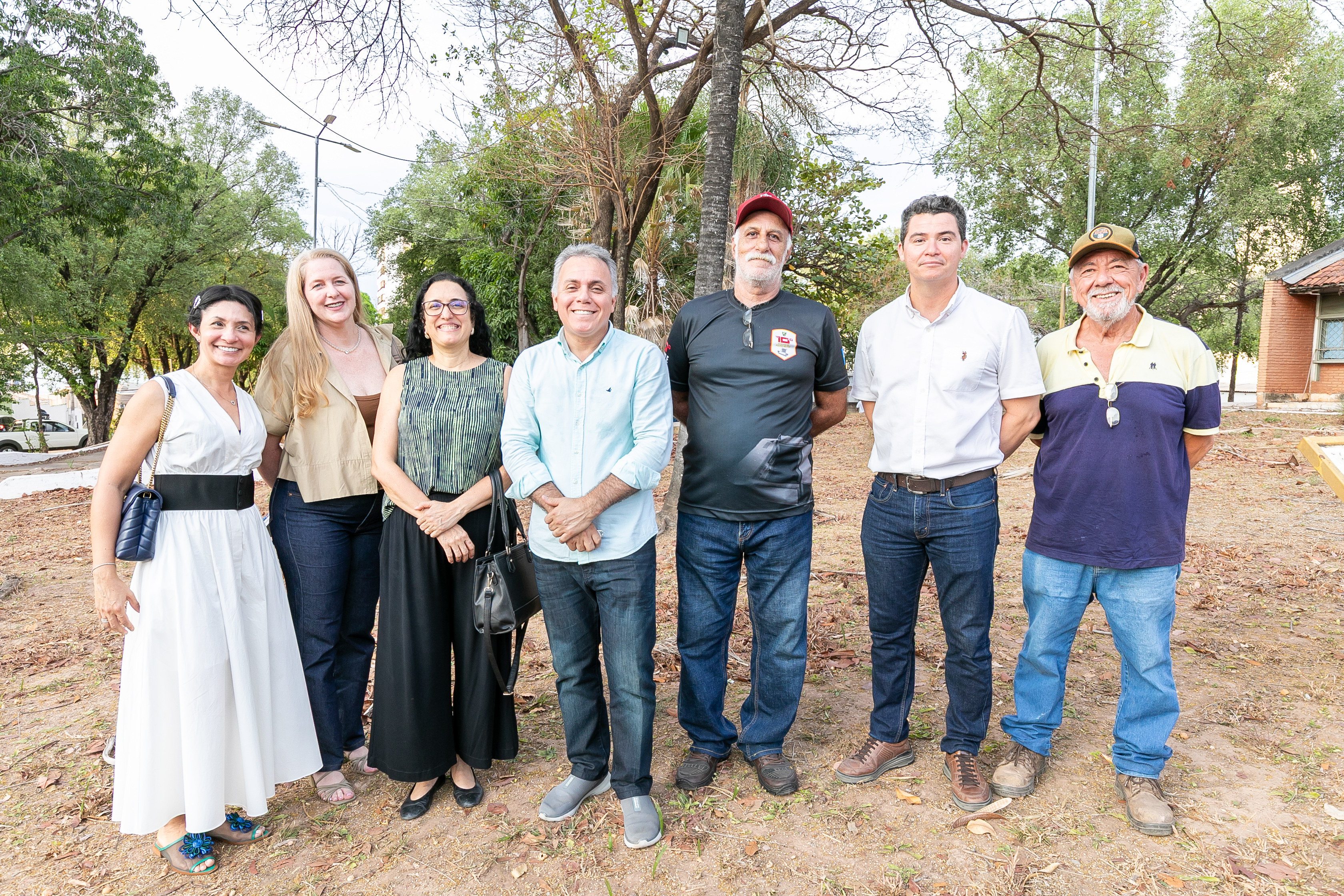 A imagem mostra o secretário de Infraestrutura e Obras, Reginaldo Teixeira, acompanhado de lideranças comunitárias e moradores, durante vistoria na praça Oscar Brandão, localizada no bairro Quilombo.
