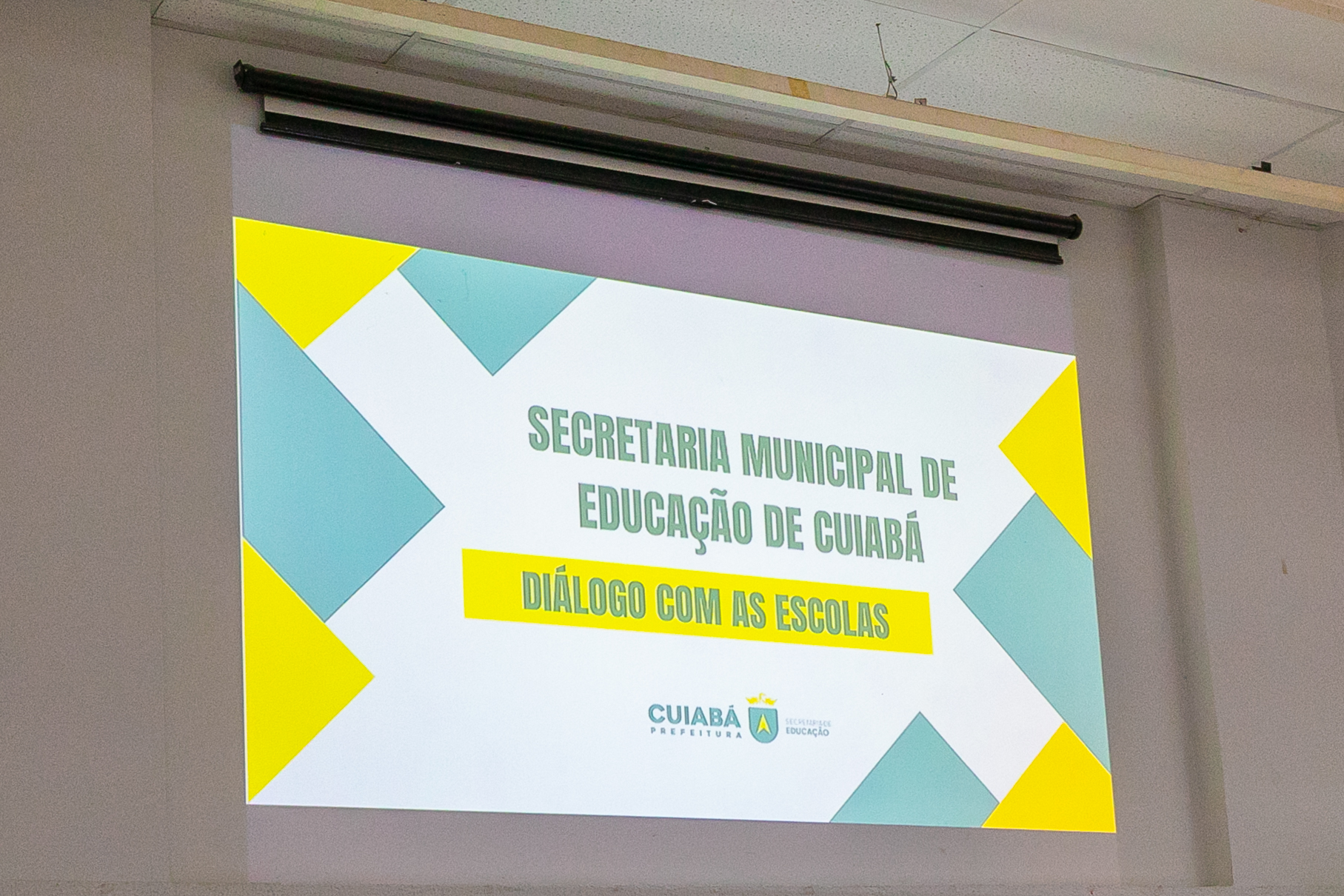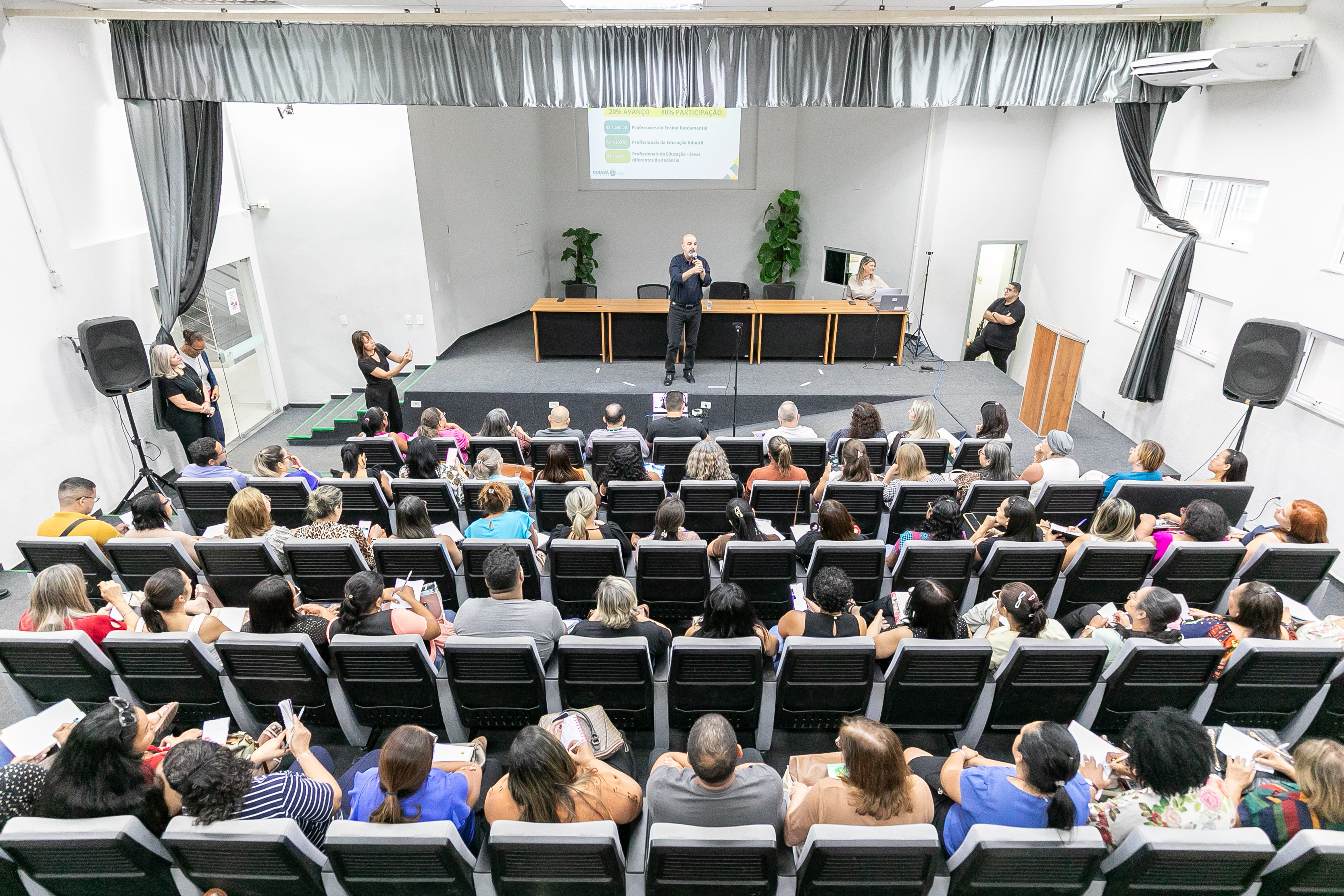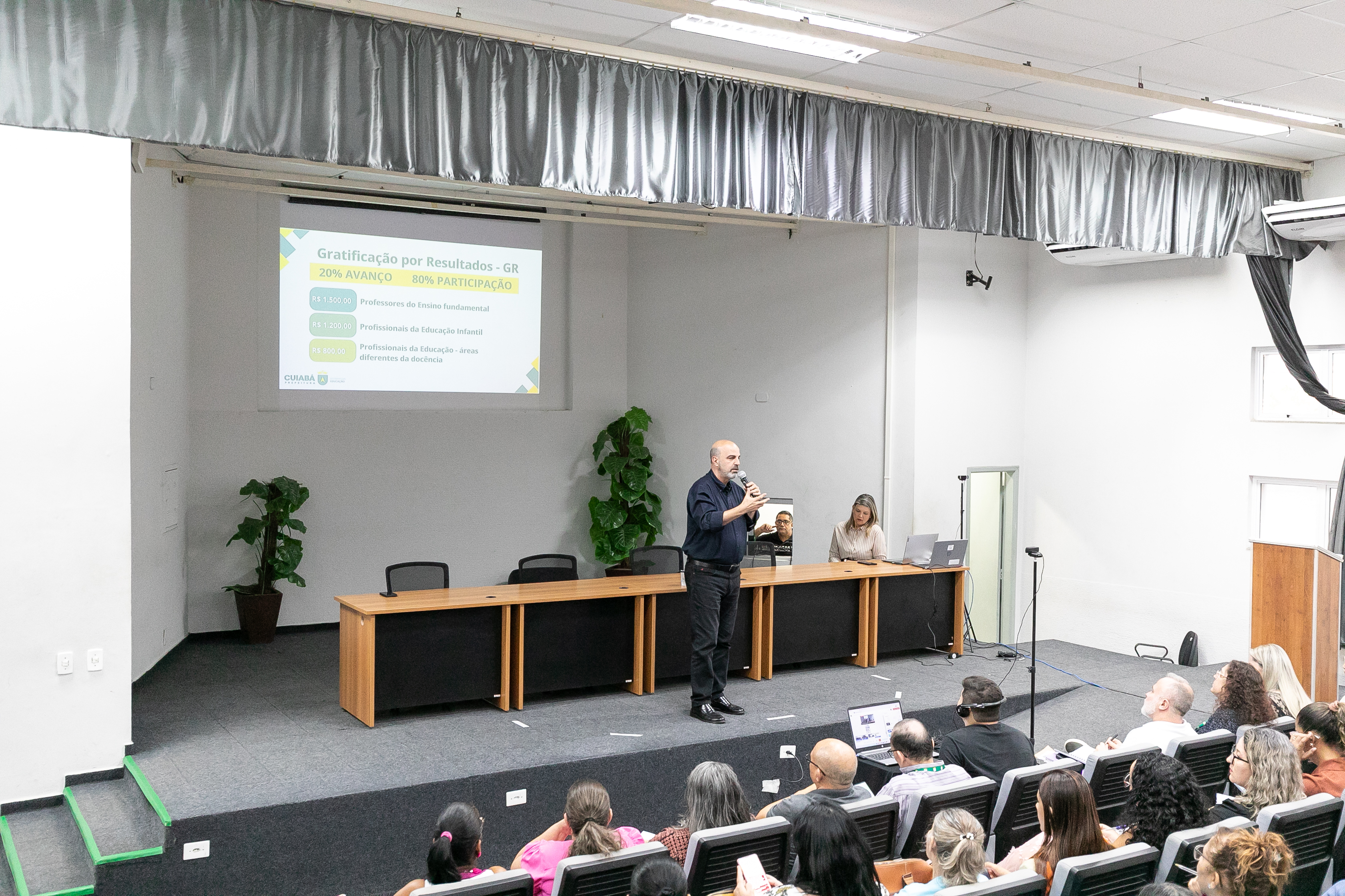 A foto ilustra o secretário de Educação de Cuiabá, Amauri Monge Fernandes, vestido com traje social em um palco de auditório. É possível visualizar servidores da educação sentados em cadeiras almofadadas, atentos à fala do secretário.