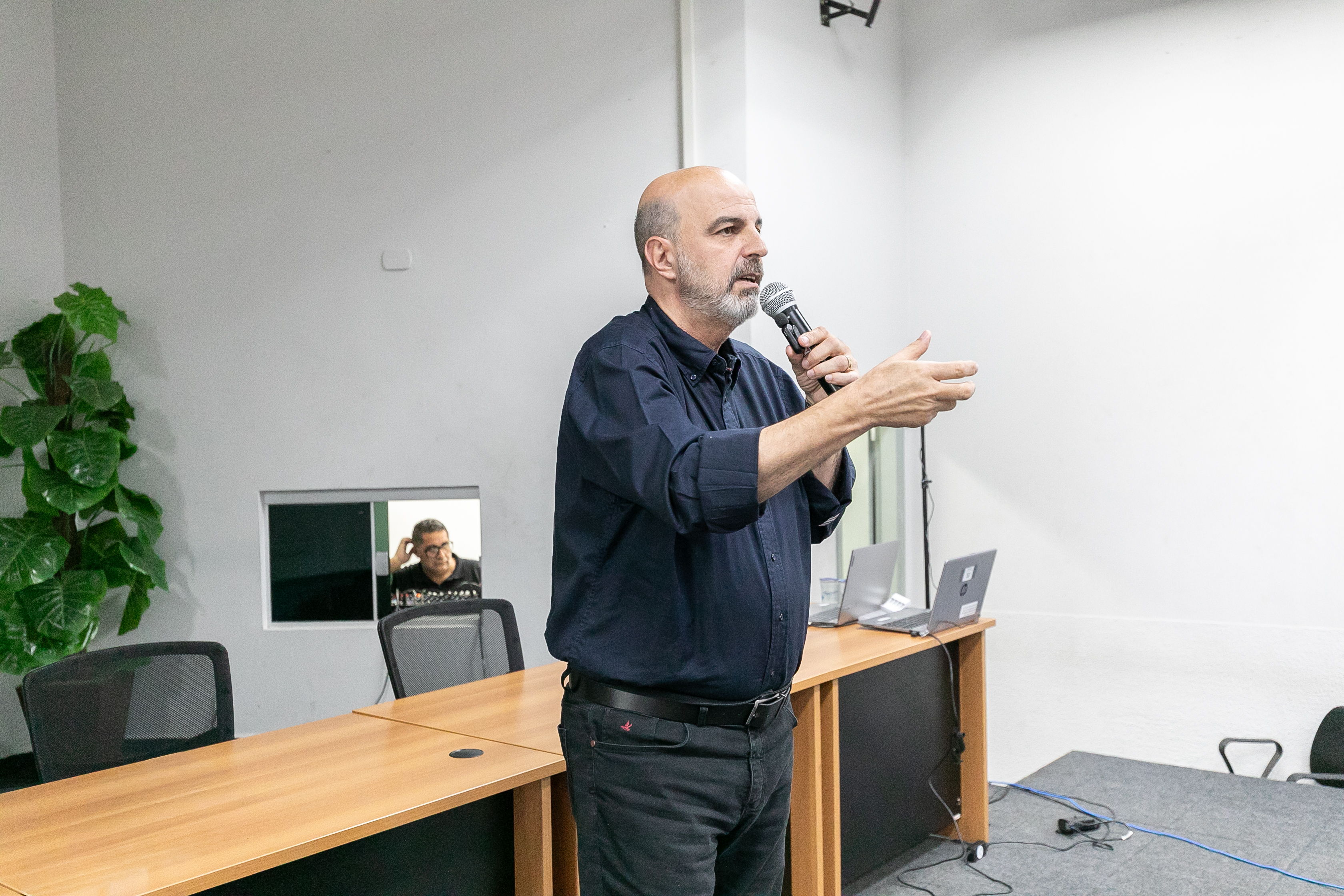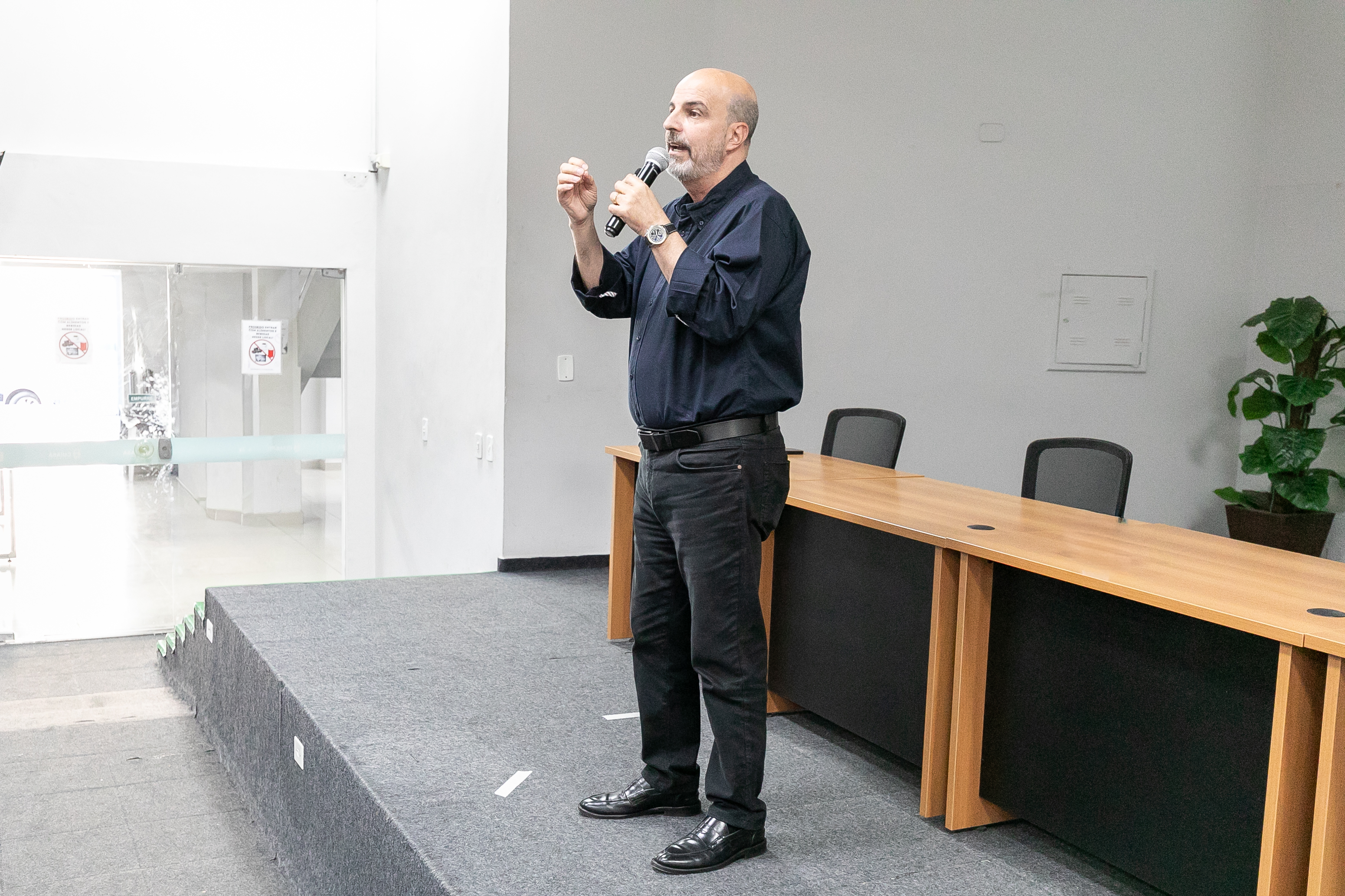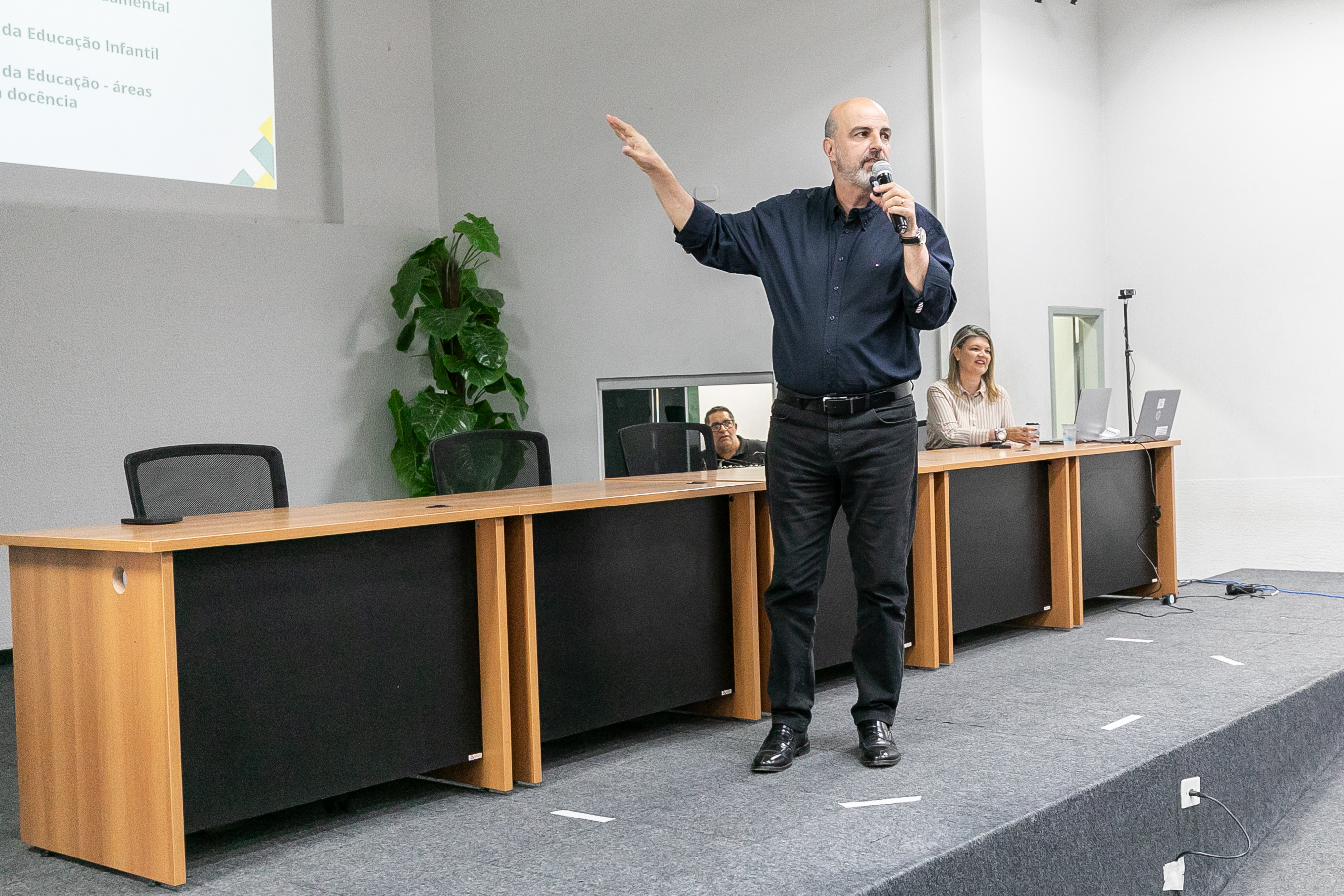 A foto ilustra o secretário de Educação de Cuiabá, Amauri Monge Fernandes, vestido com traje social em um palco de auditório. É possível visualizar servidores da educação sentados em cadeiras almofadadas, atentos à fala do secretário.