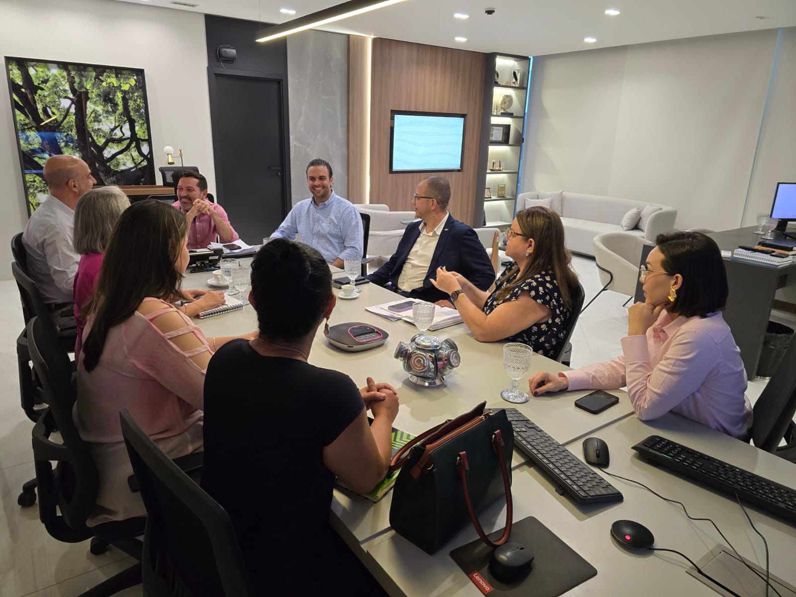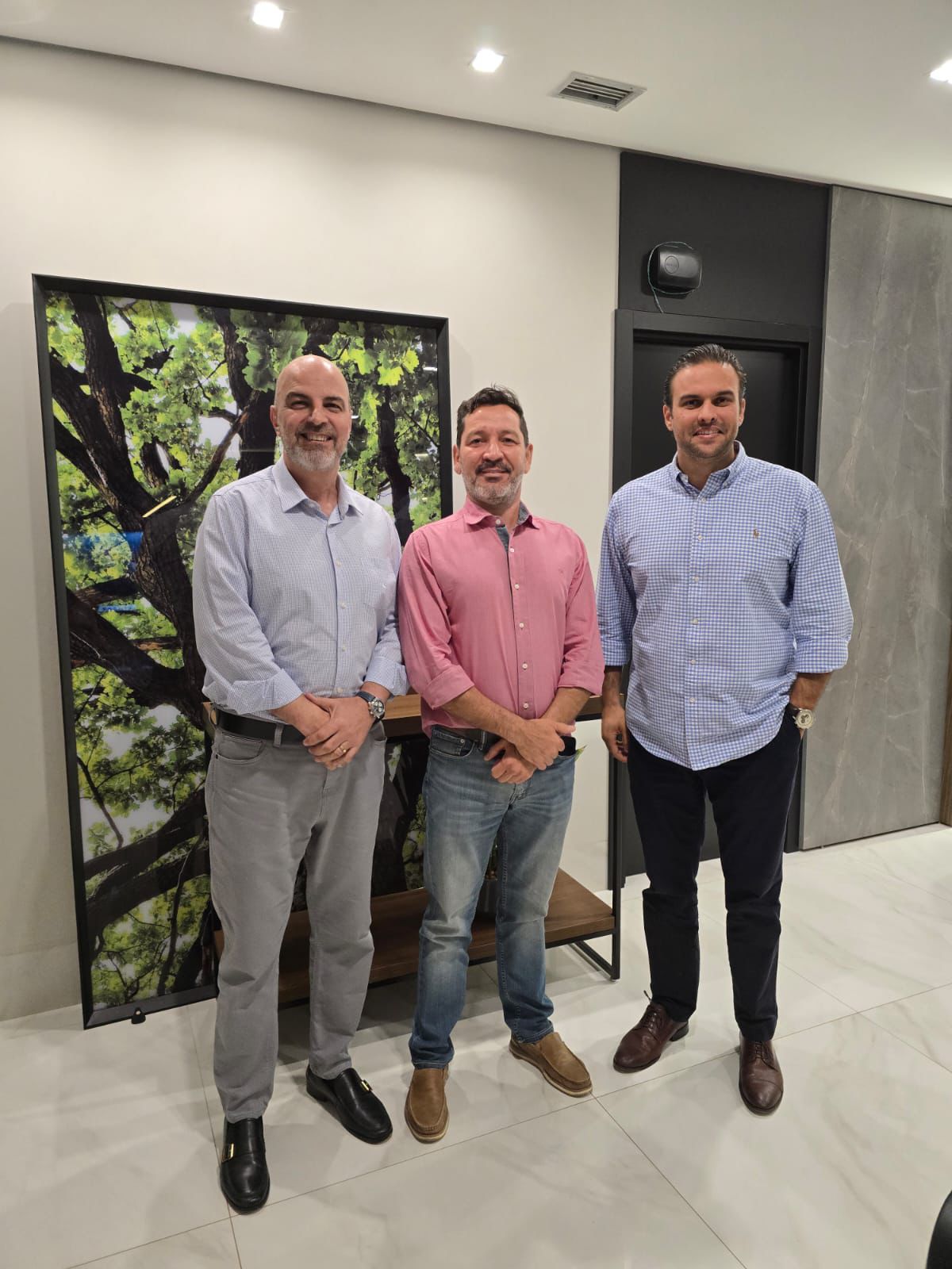 A foto ilustra um grupo de servidores públicos de alto escalão em uma sala comercial. A direita, está o secretário de Educação, Amauri Monge Fernandes, vestido com traje social. À sua frente, está o secretário de Estado de Planejamento, Basilio dos Santos, a esquerda, está o secretário de Planejamento Estratégico, Murilo Bianchini, também de traje social.