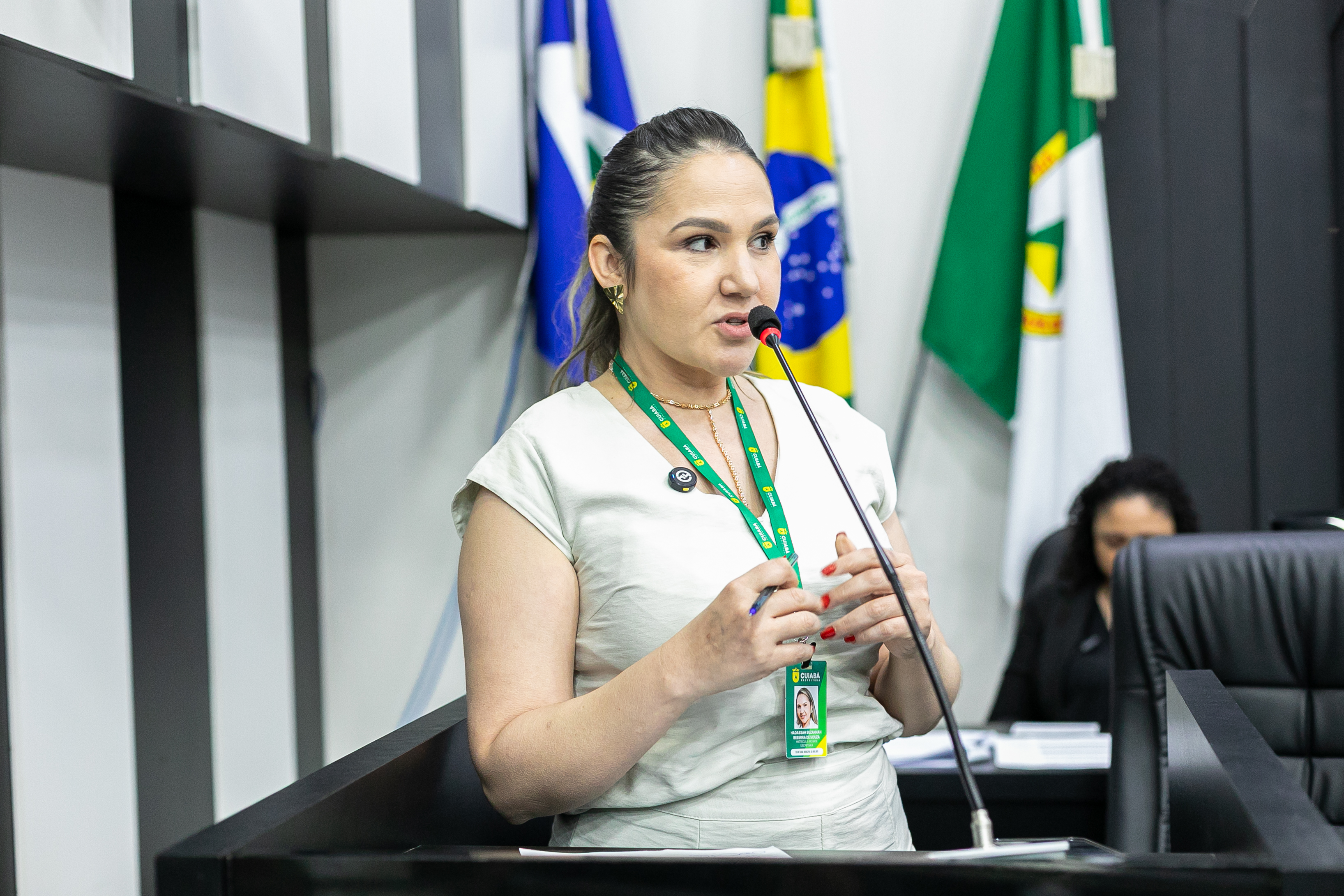 Os secretários municipais Hadassah Suzannah, tenente-coronel e titular da Pasta da Mulher, e Amauri Monge Fernandes, da Educação, apresentaram na Câmara Municipal de Cuiabá iniciativas para a aplicação da Lei nº 7.143/2023, de autoria da vereadora Michelly Alencar, que institui o programa “Maria da Penha vai às Escolas”.
