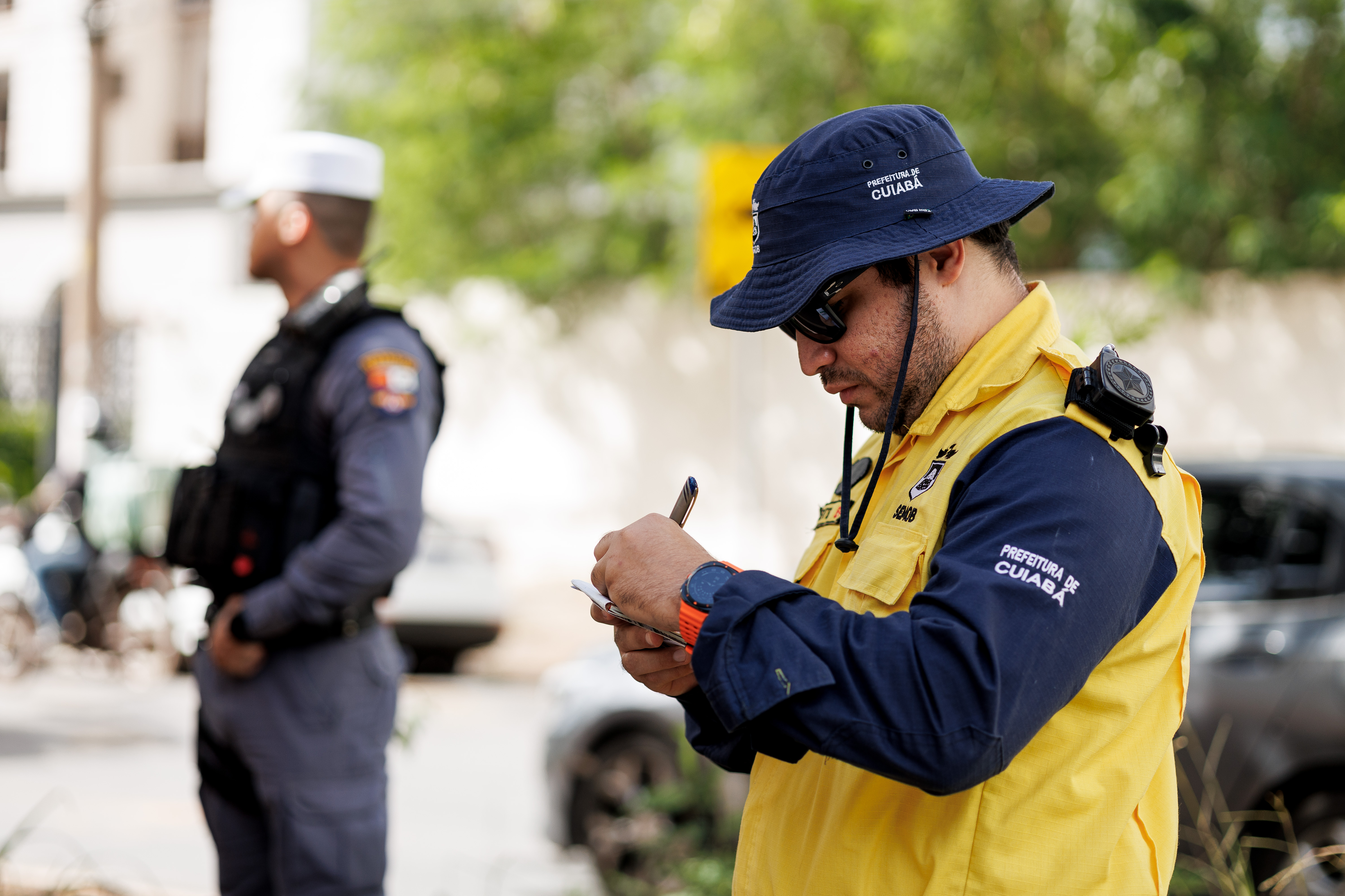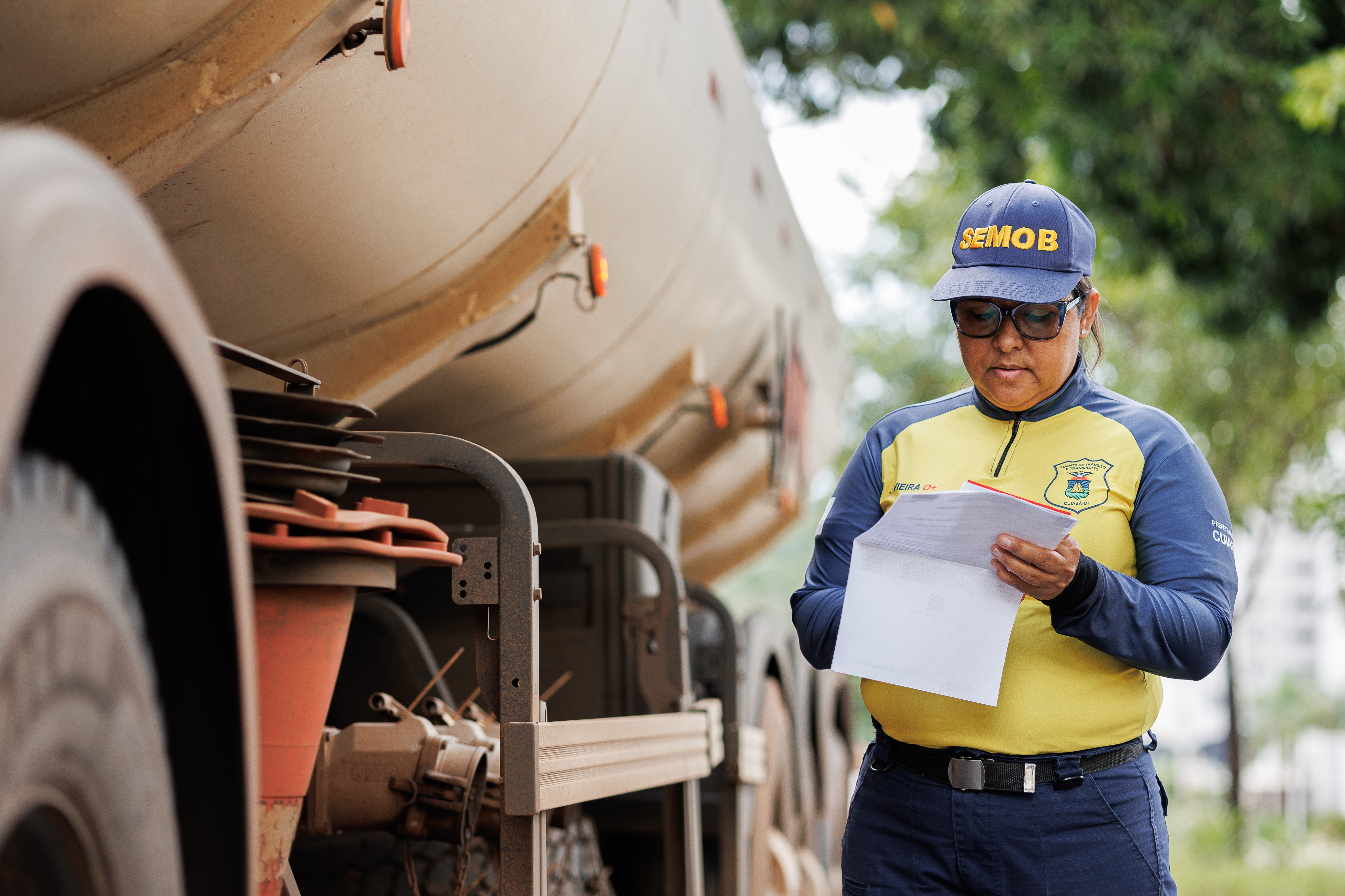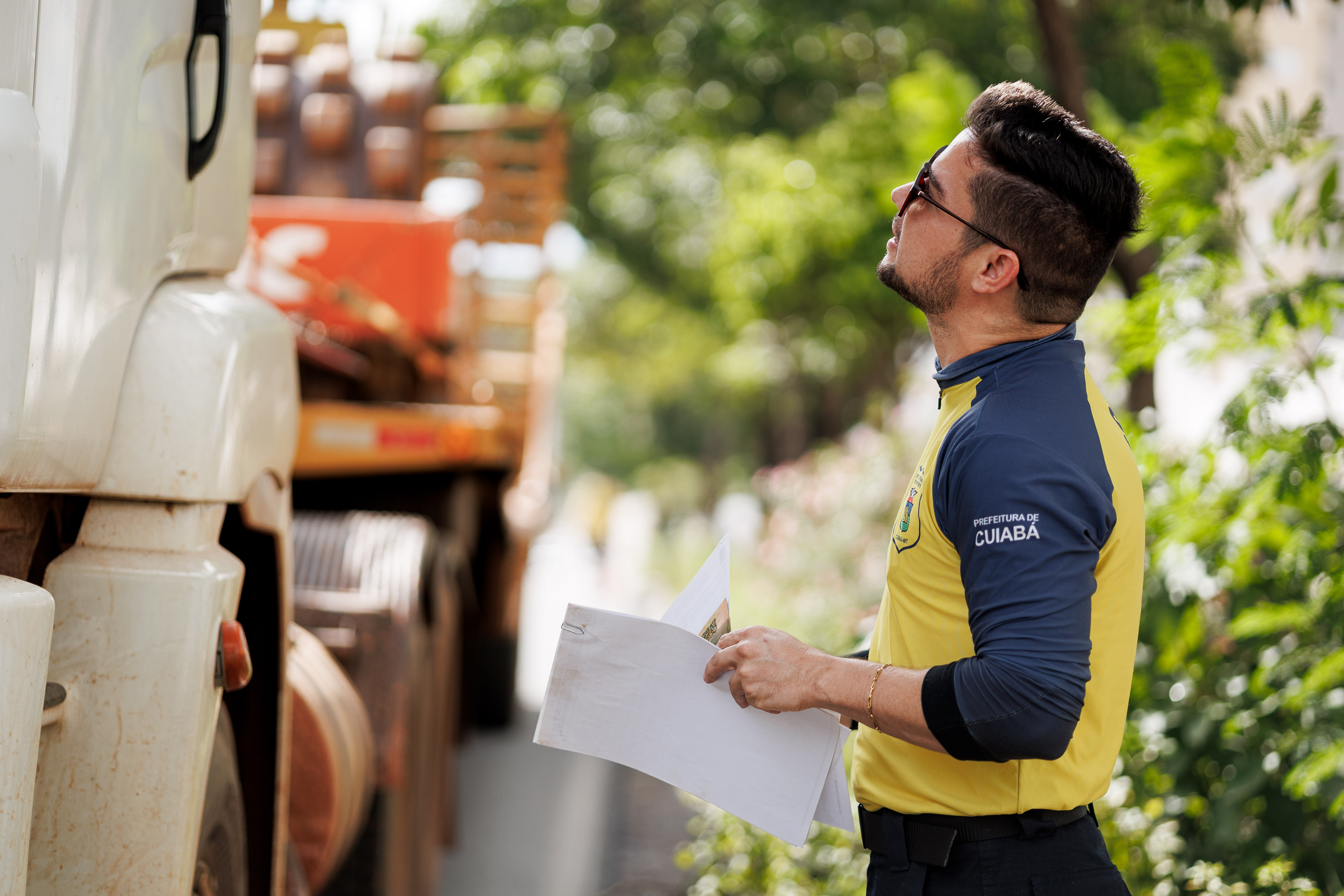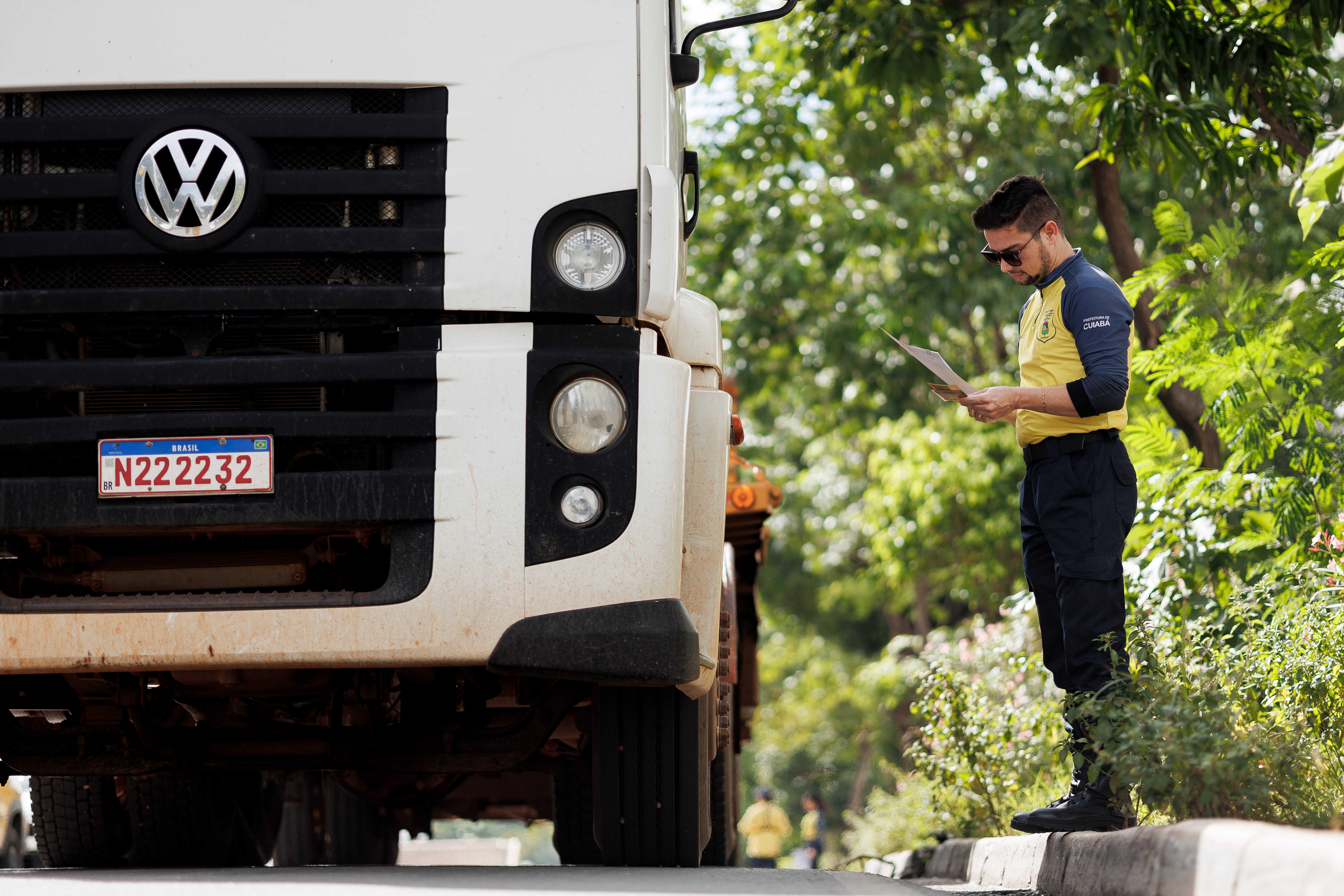 A imagem ilustra um agente de trânsito com colete amarelo e camisa azul preenchendo um papel branco. Ao fundo, é exibido um caminhão de cor branca.
