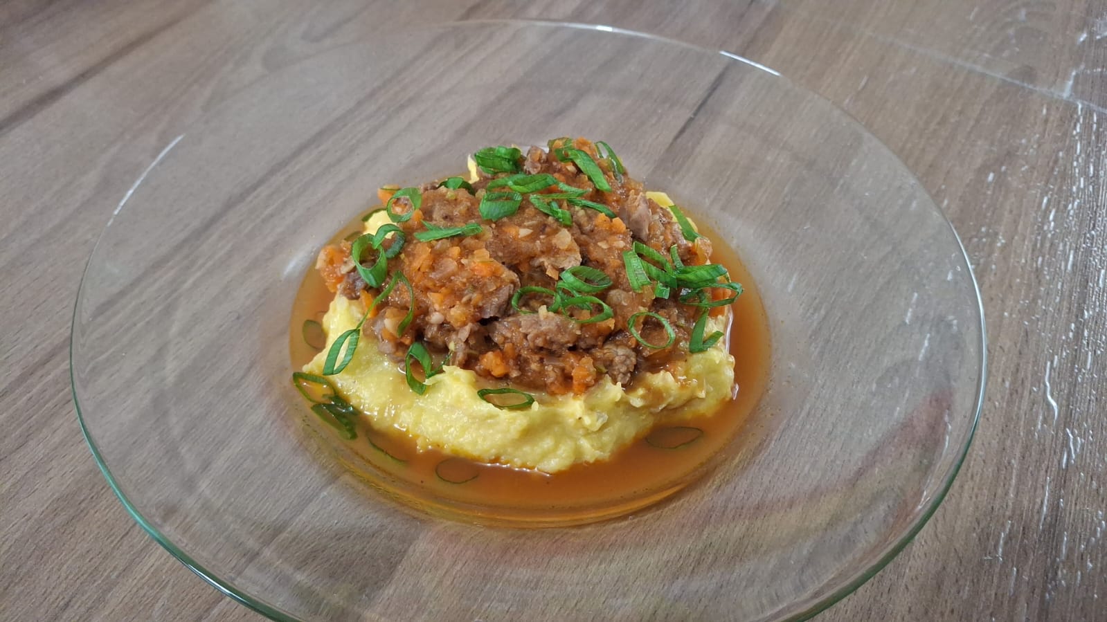 A foto ilustra um prato com porção de comida. É possível visualizar uma quantia de arroz, carne e abóbora.