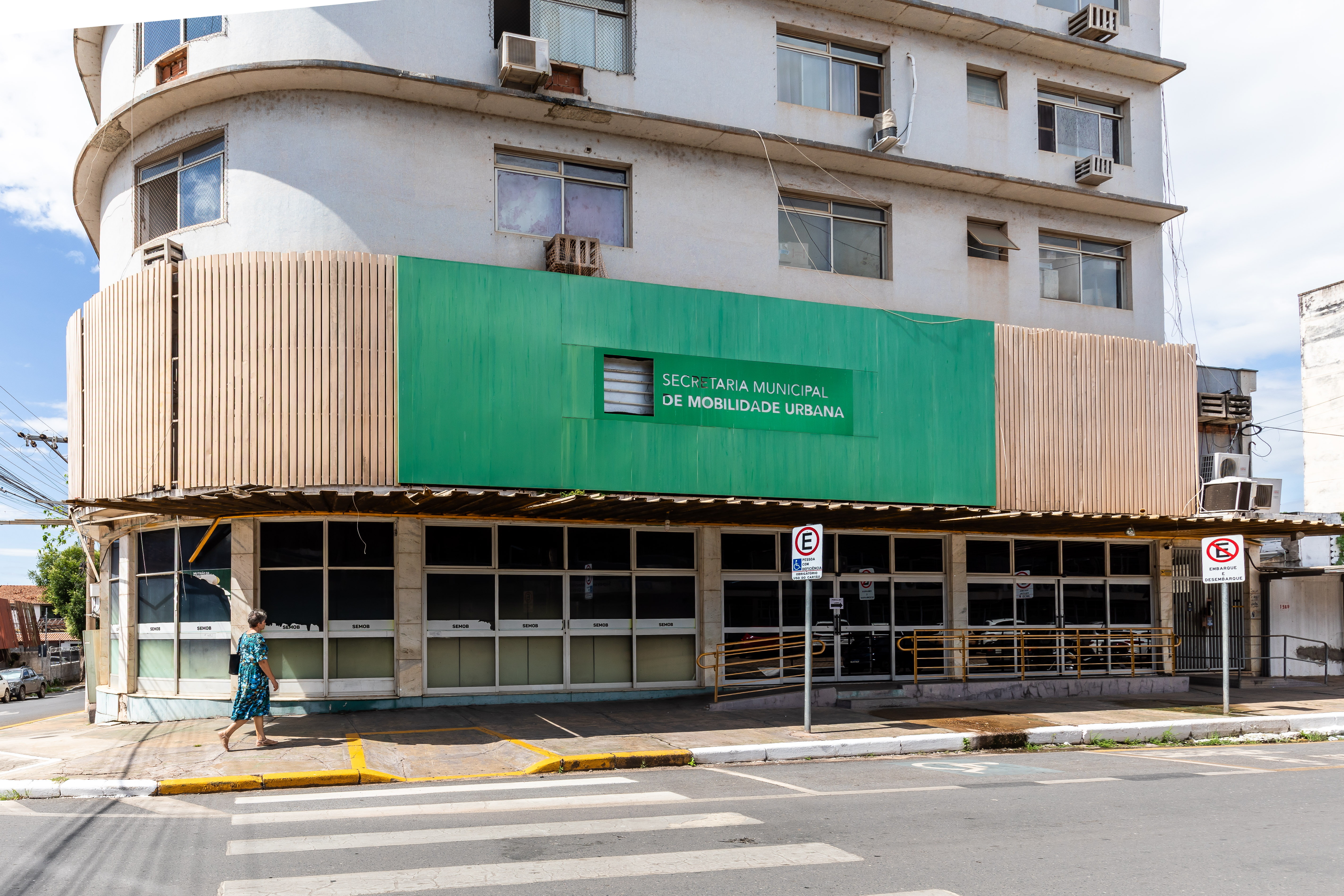 A foto mostra a sede da Secretaria Municipal de Mobilidade Urbana, em Cuiabá. Na fachada, em verde, a identificação do local.
