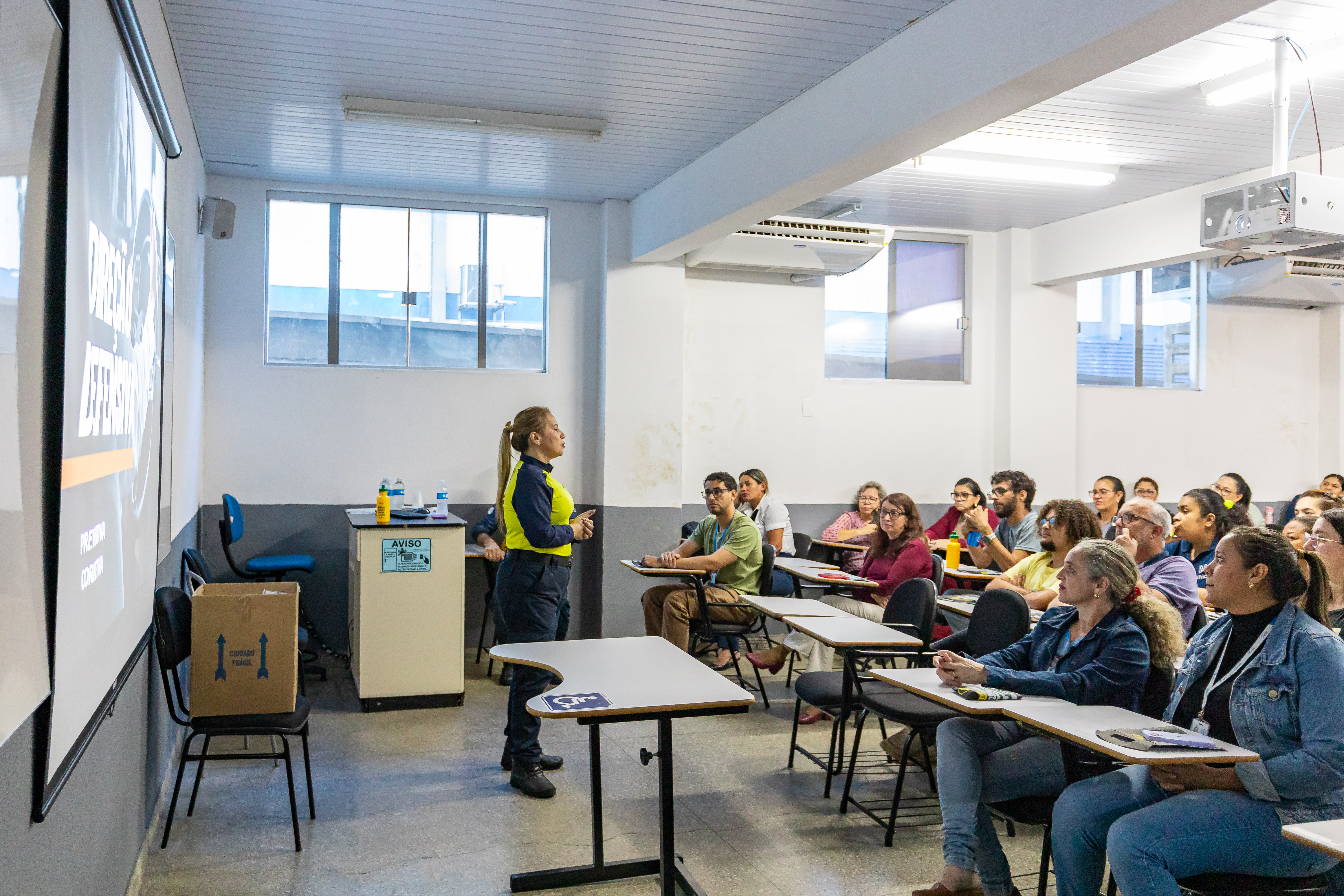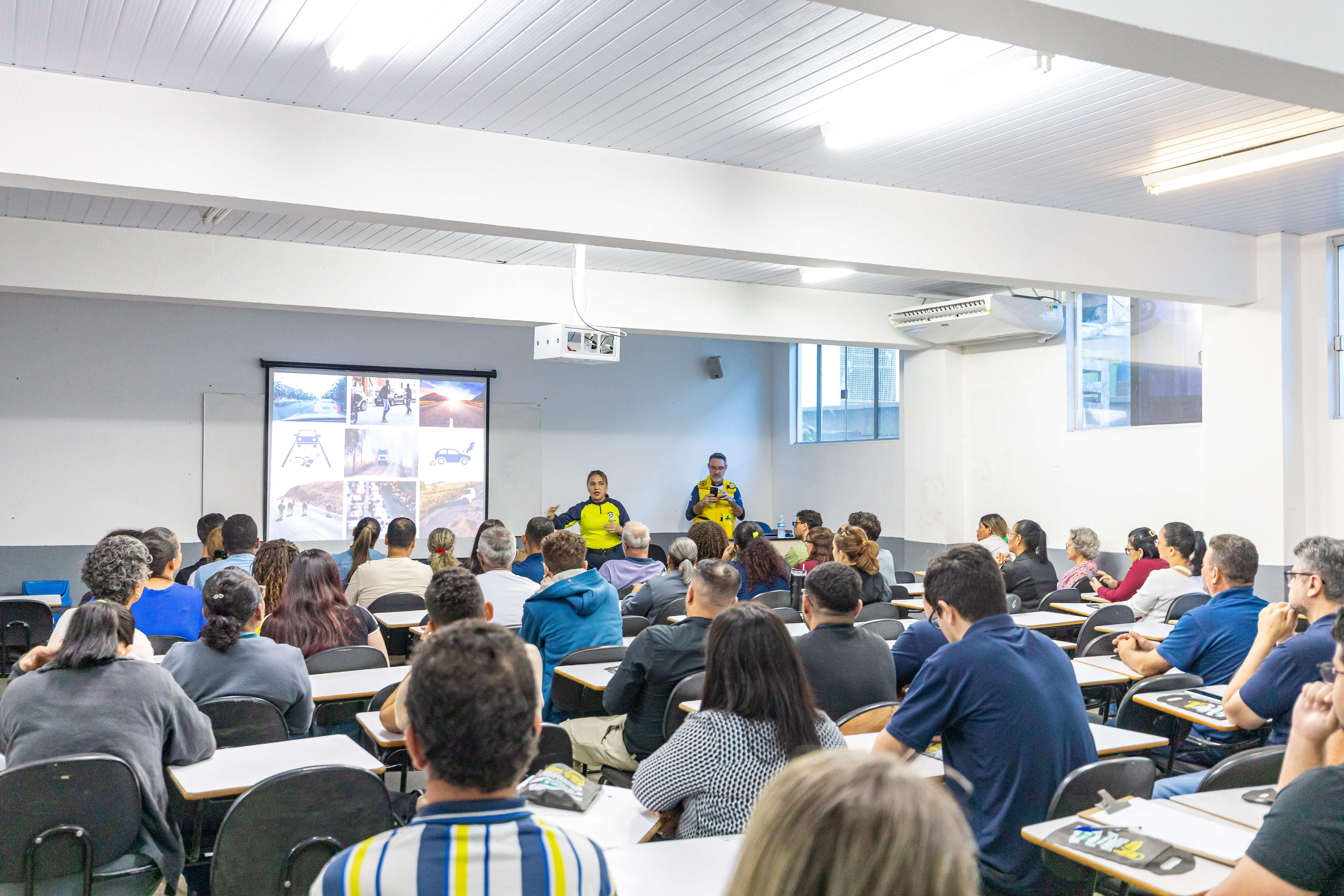 A apresentação, conduzida pelos supervisores de Educação para o Trânsito da Semob, Marcus Garé e Luciana Melo, destacou orientações práticas e emocionais para uma condução mais segura. O conteúdo foi reforçado por vídeos com cenas reais de sinistros, o que provocou forte impacto entre os participantes, com direito a questionamentos: Você acha que é um motorista exemplar? Quem é você no trânsito?