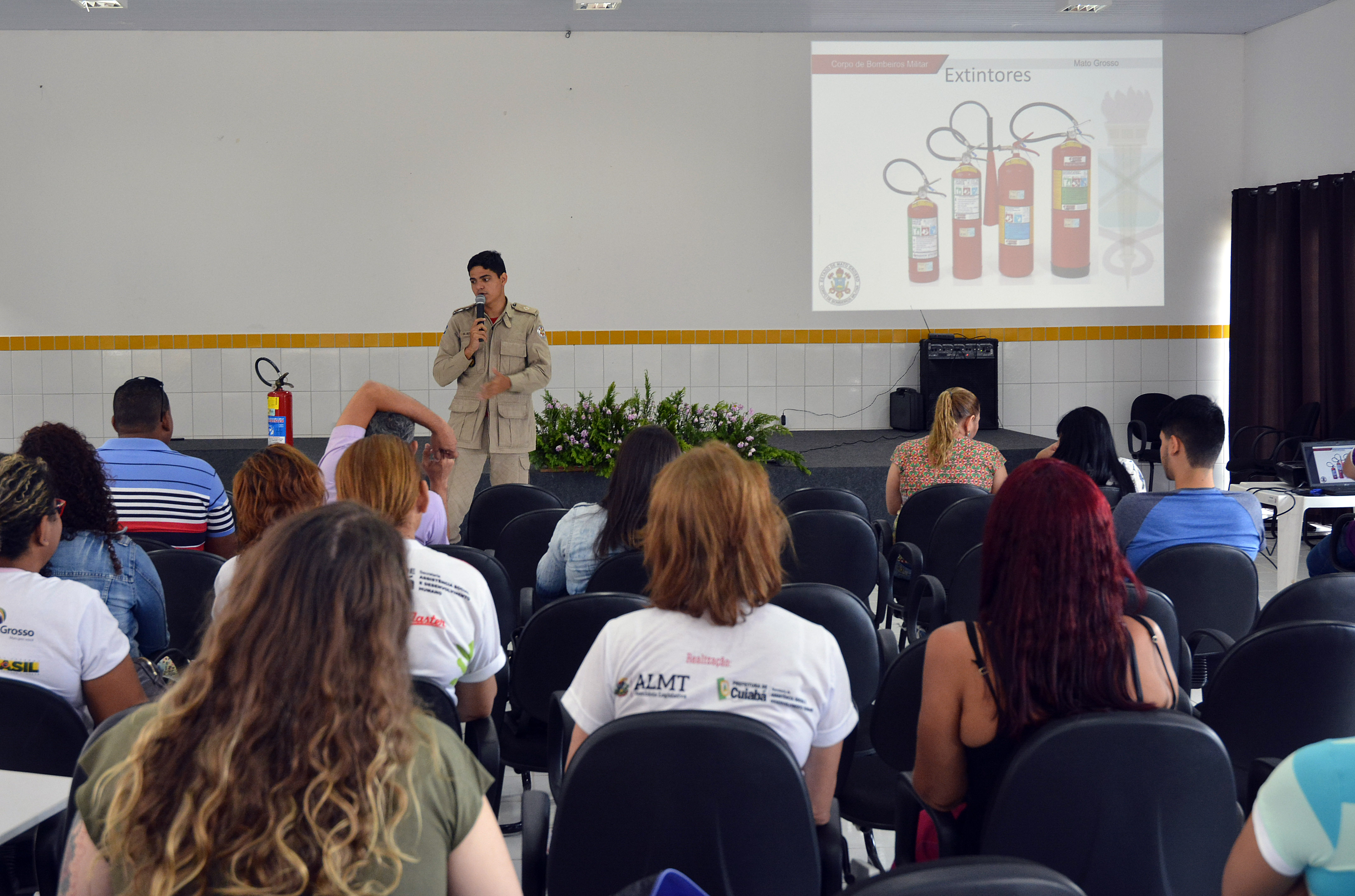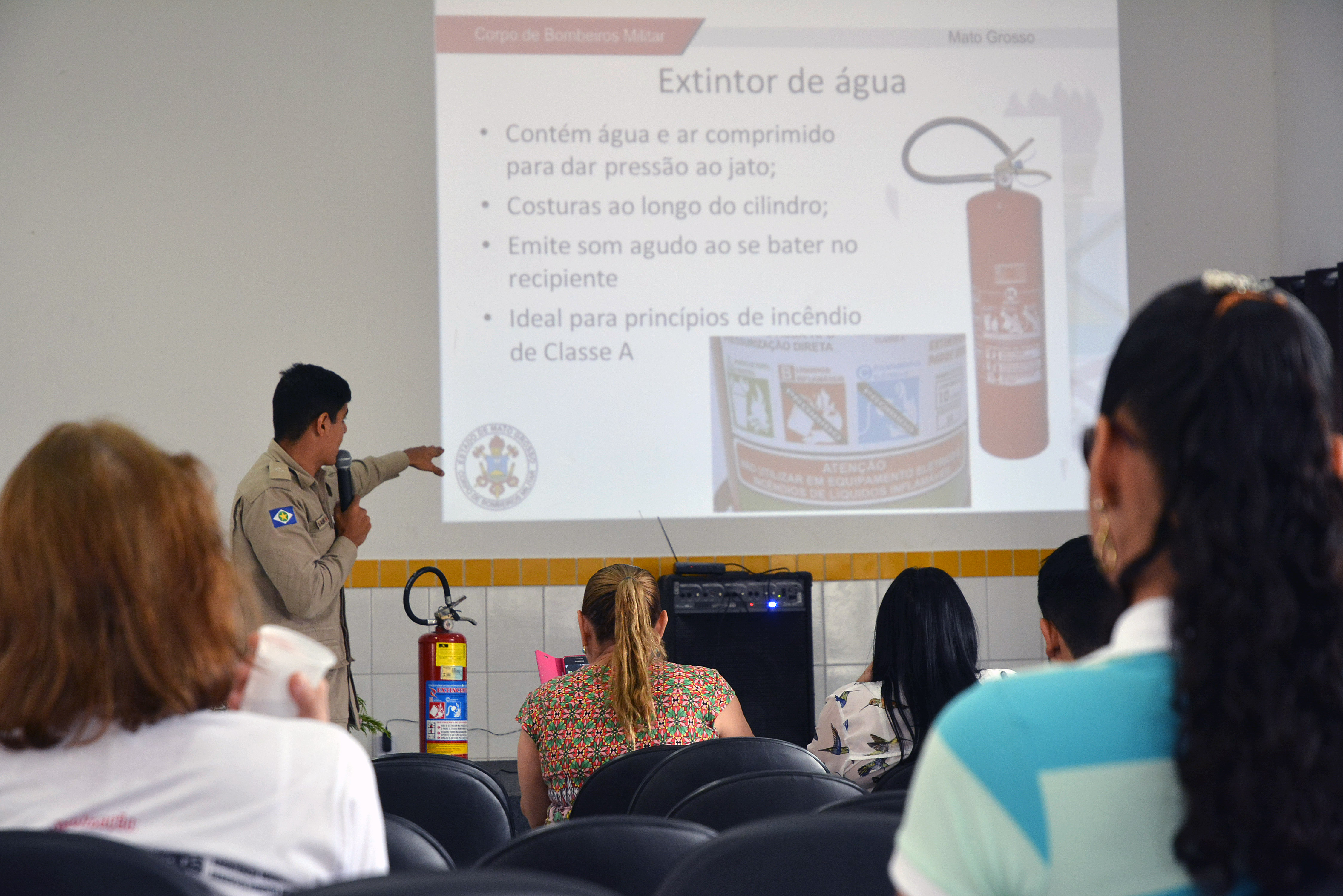 Durante a manhã de hoje, os bombeiros ensinaram os servidores a parte teórica da capacitação, com a explicação sobre a teoria da proliferação do fogo, os tipos e usos dos extintores, os incêndios, as estruturas das edificações, acidentes domésticos que costumam gerar incêndio e quais devem ser os cuidados com energia elétrica, fogos de artificio e gás de cozinha.