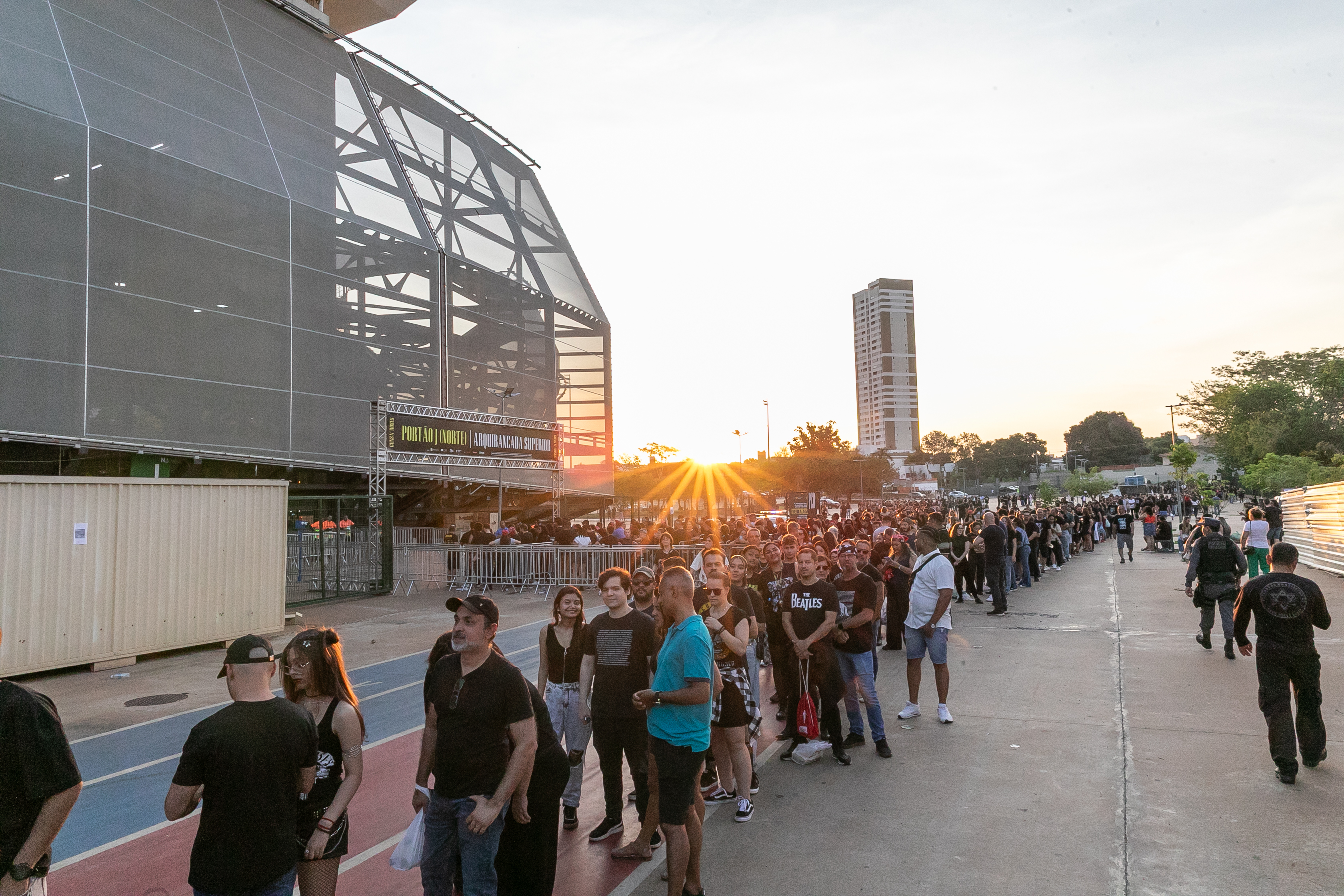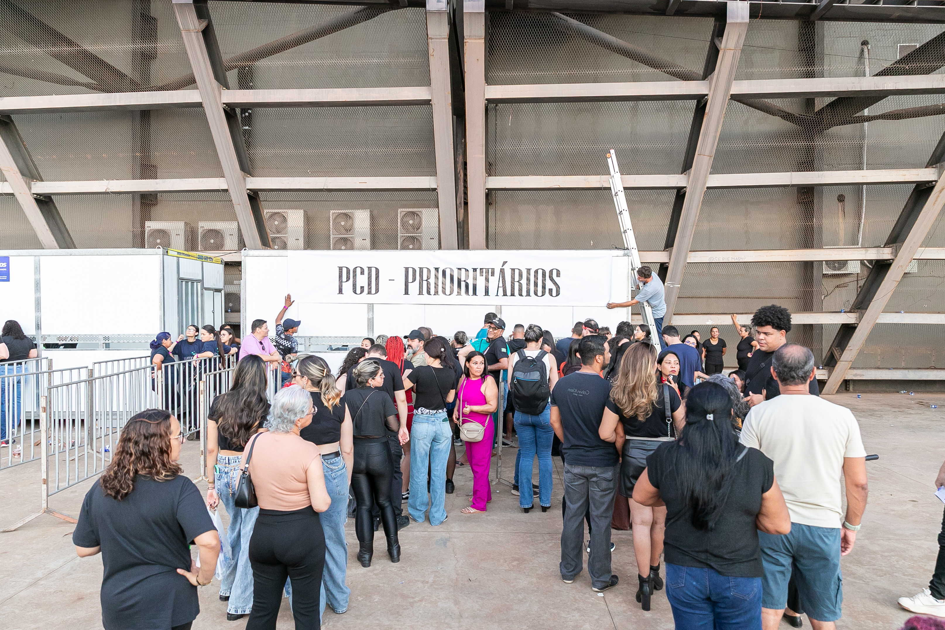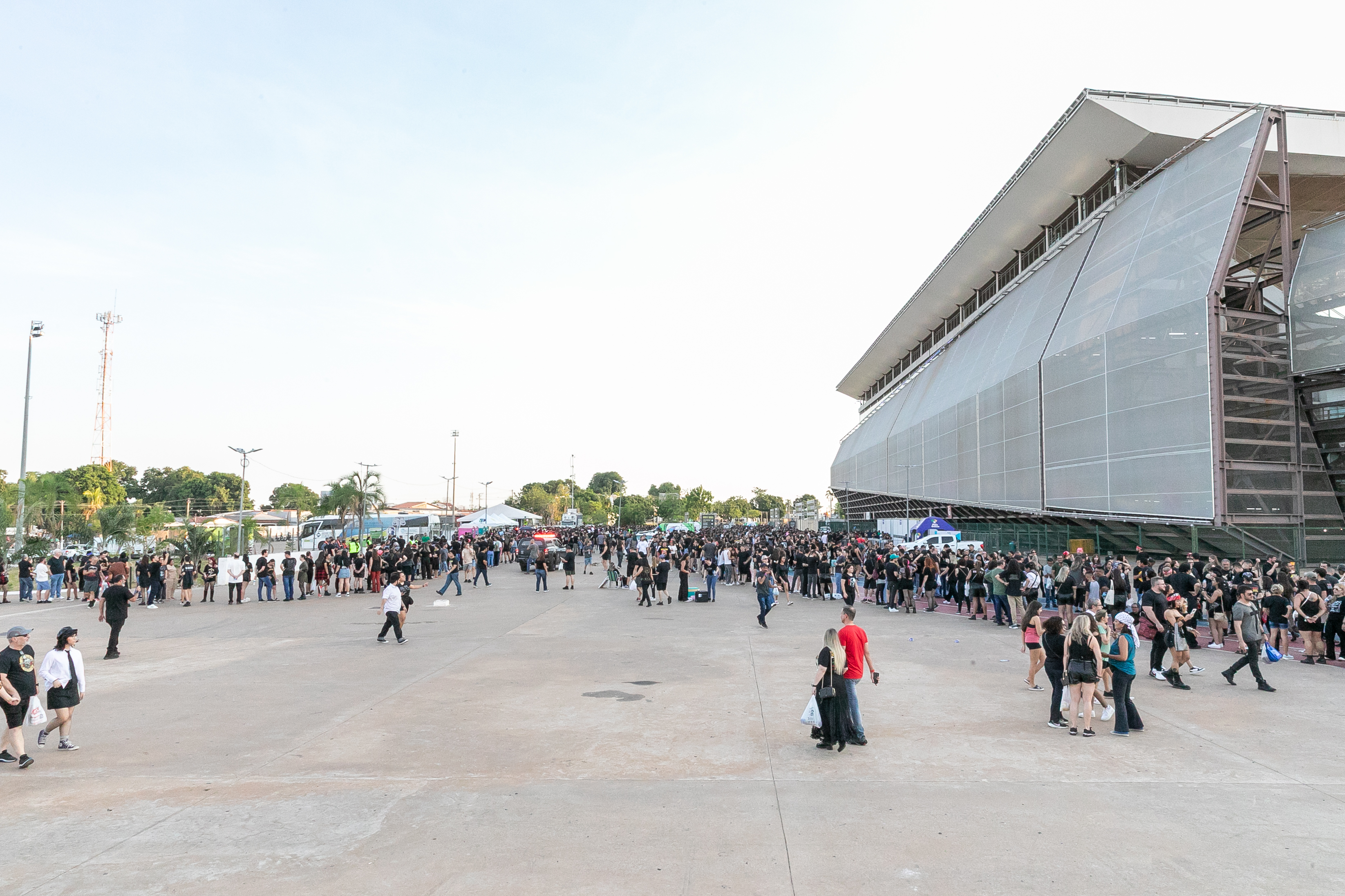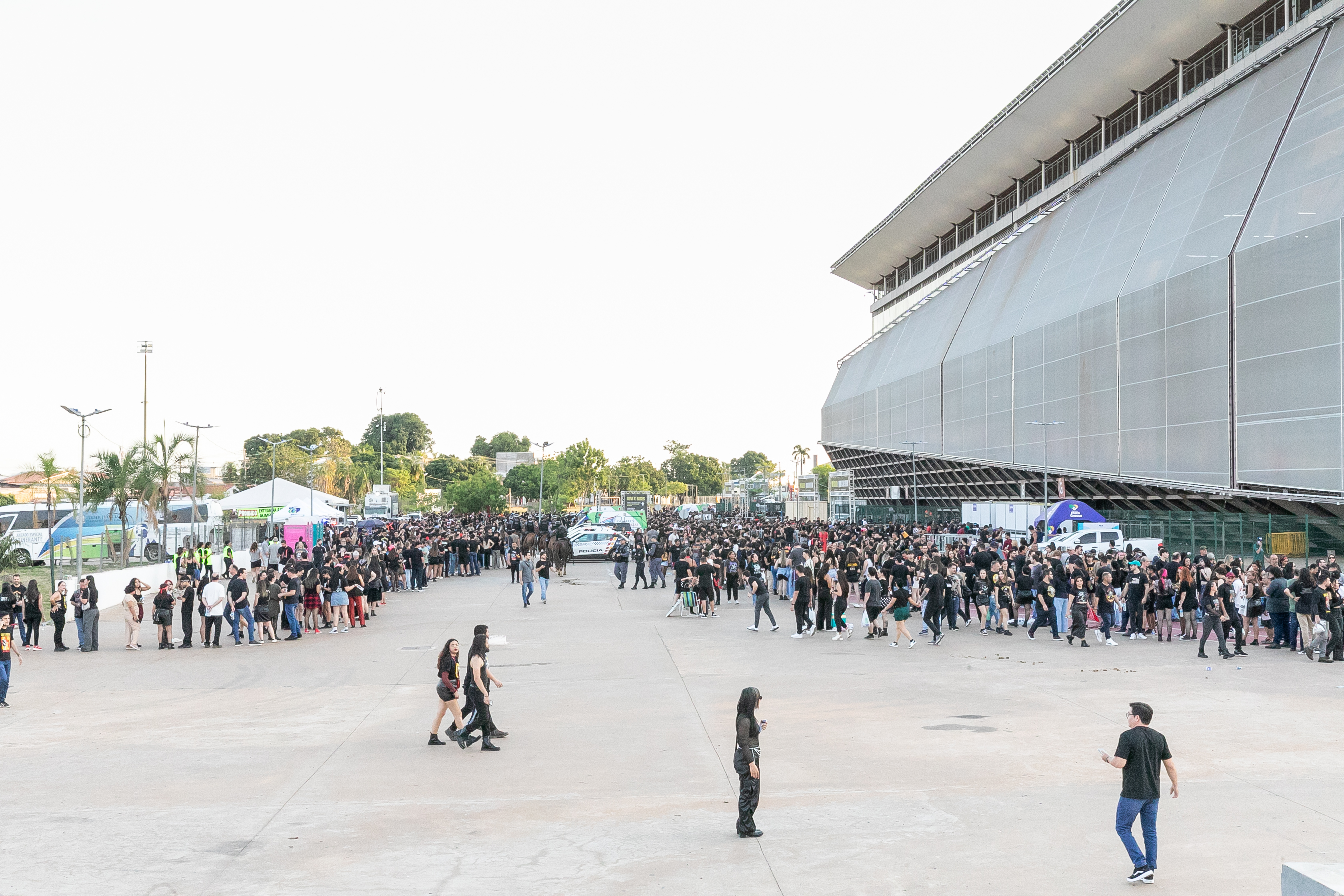 A foto mostra a empolgação dos fãs ainda do lado de fora da Arena Pantanal, aguardando a liberação da entrada do show.