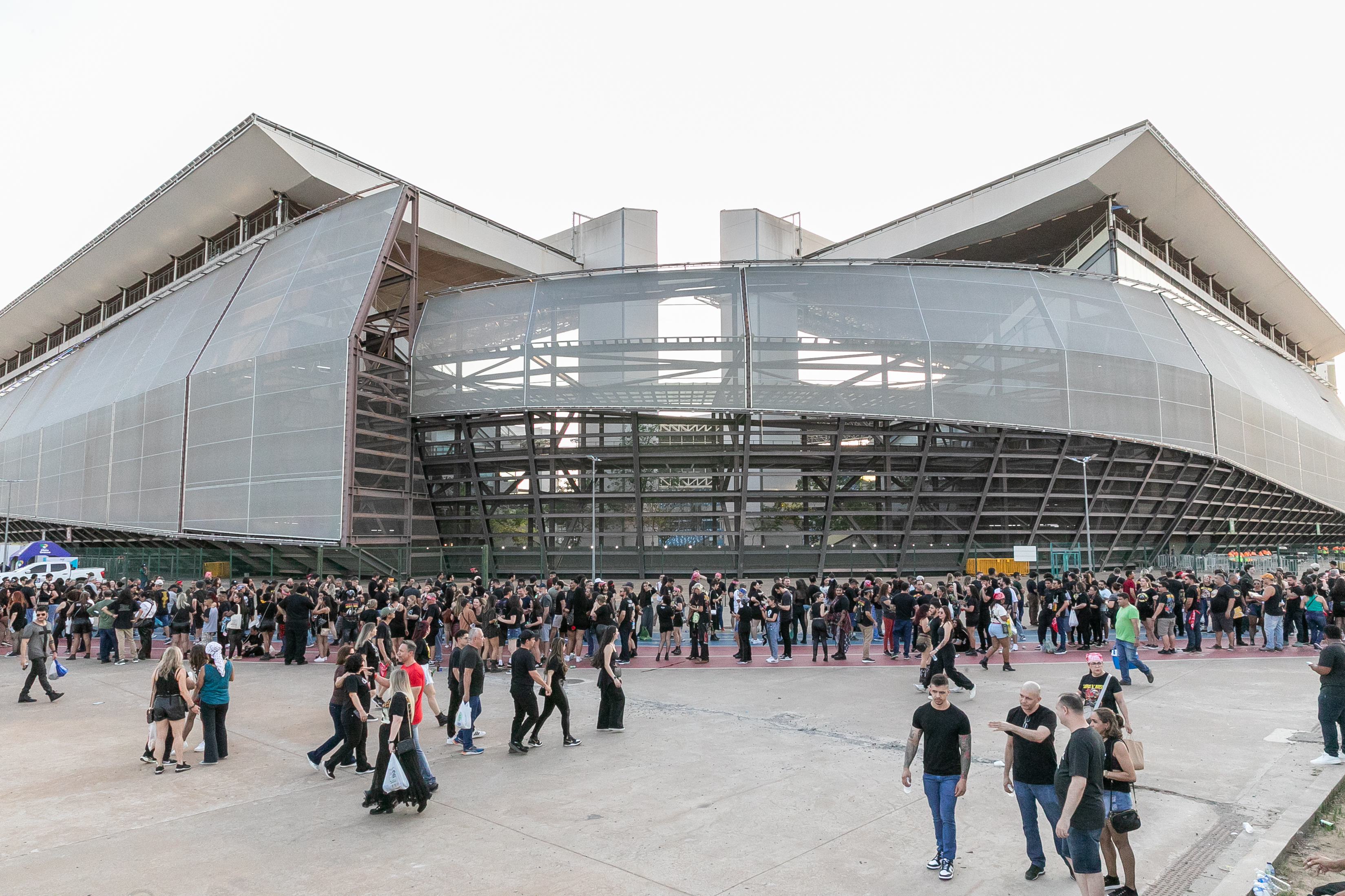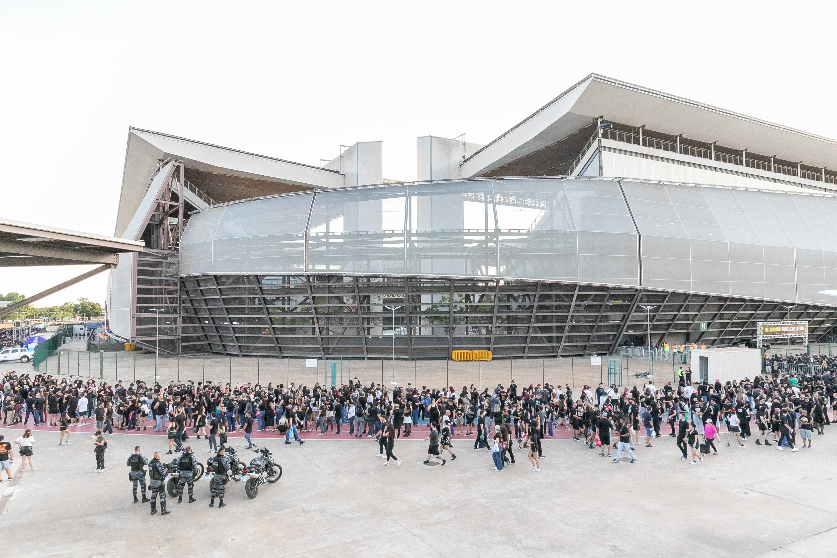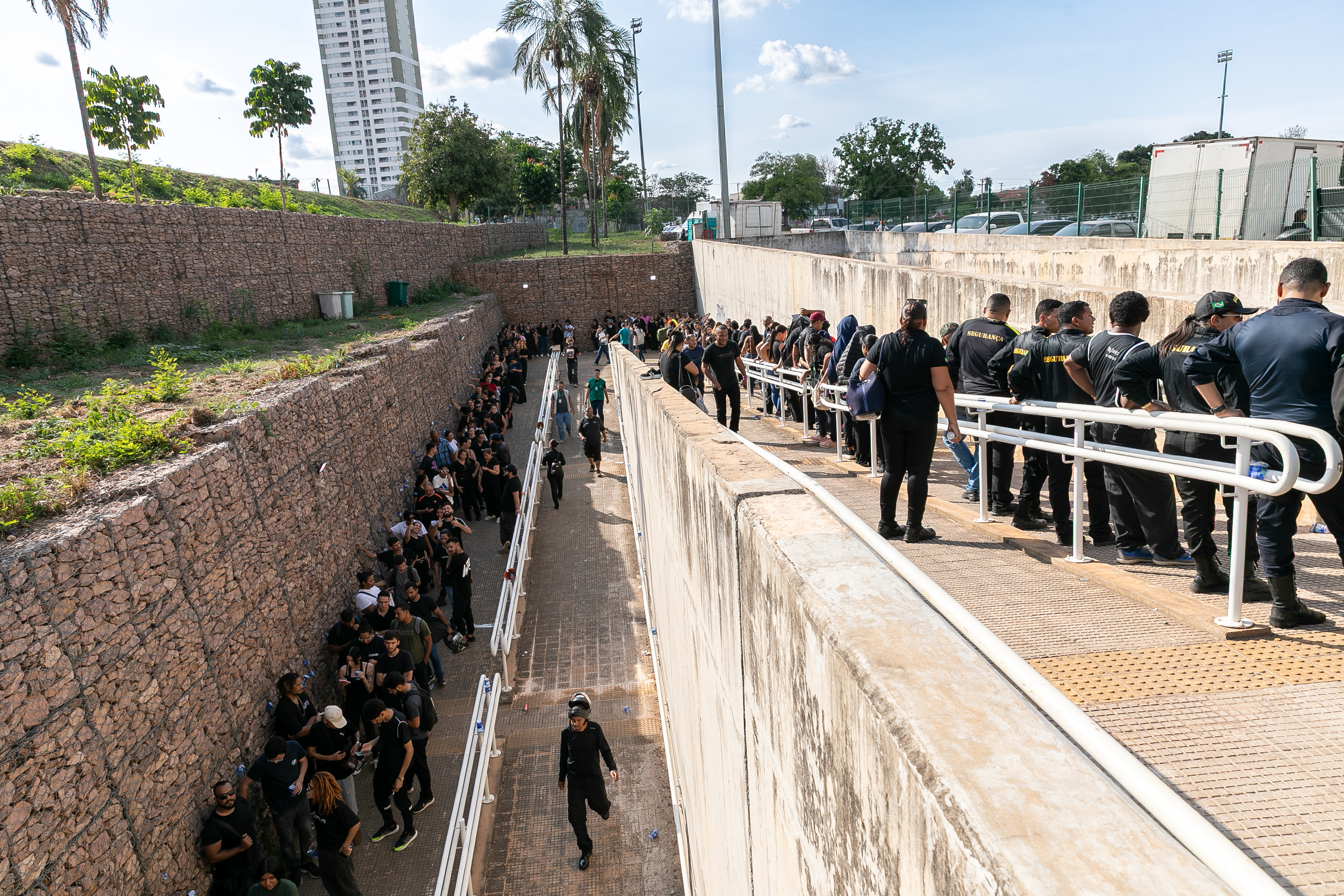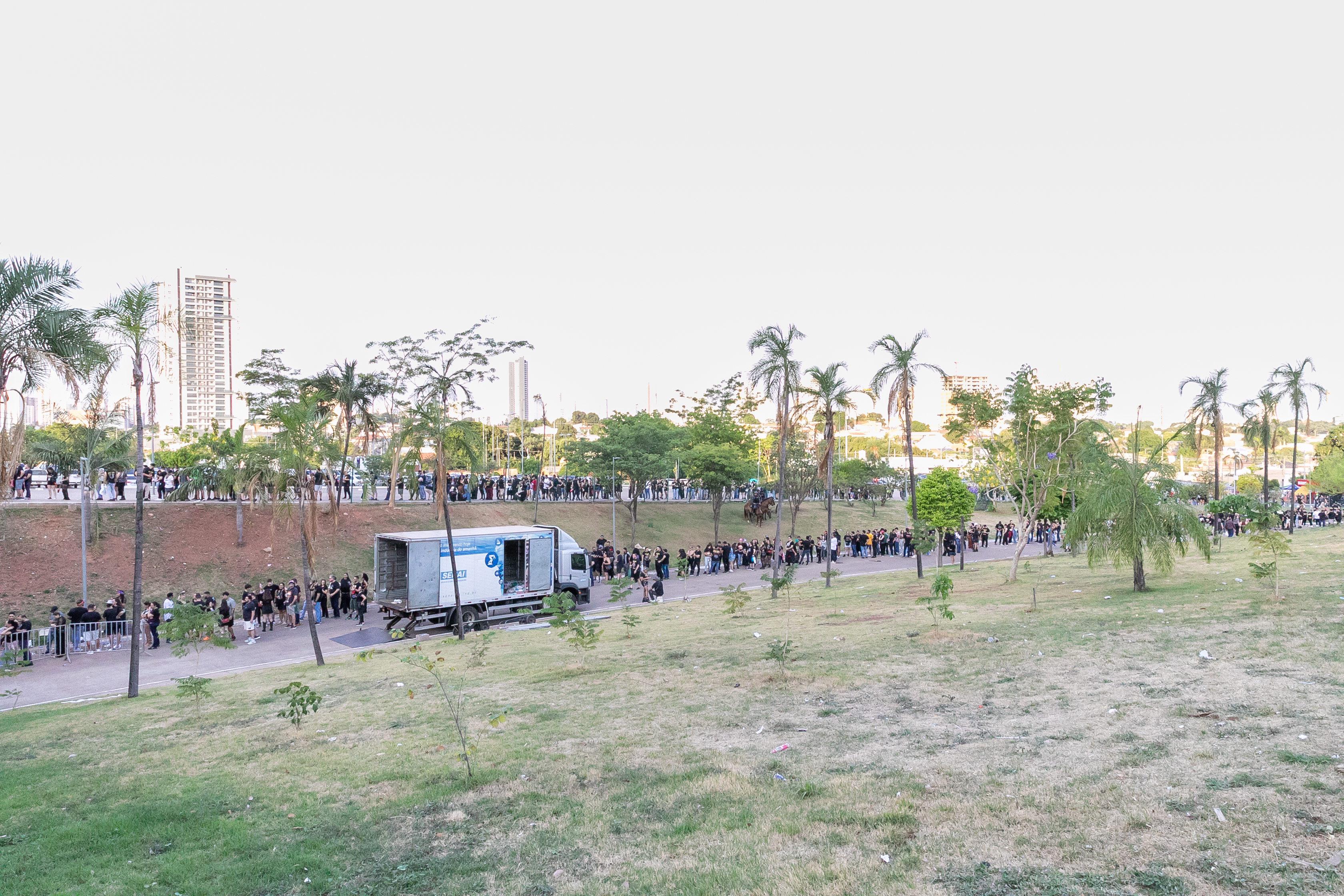A foto mostra a empolgação dos fãs ainda do lado de fora da Arena Pantanal, aguardando a liberação da entrada do show.